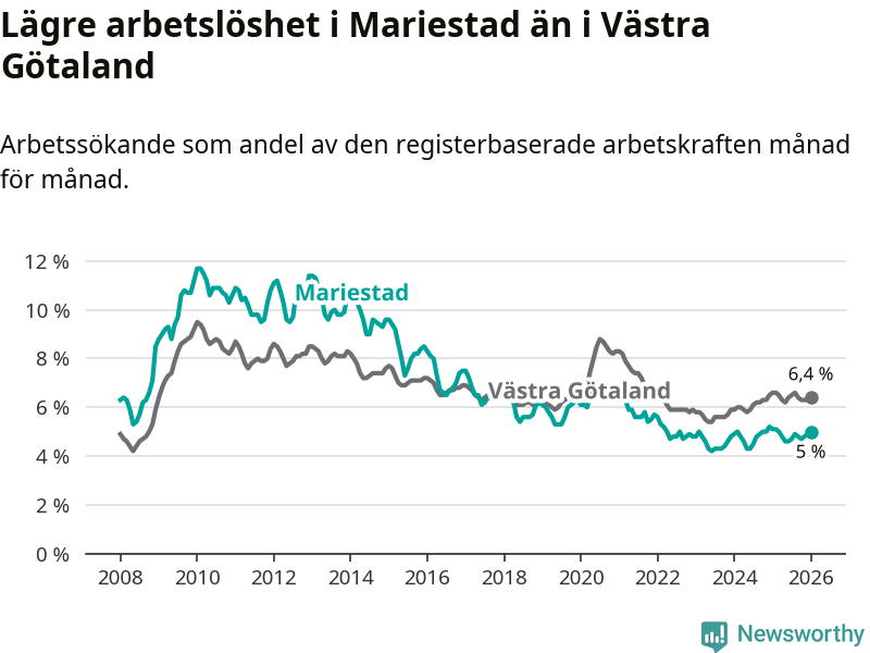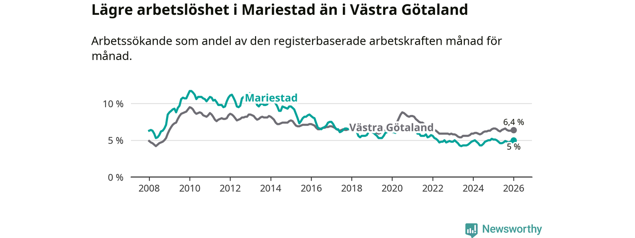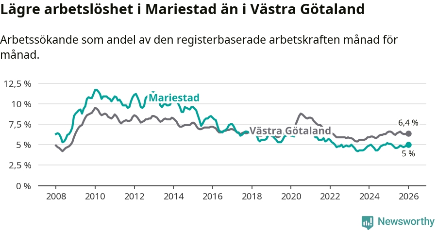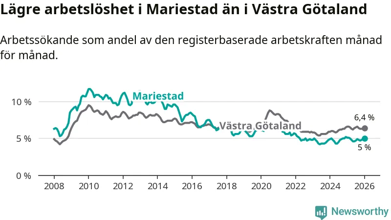 Under januari månad rapporterade Mariestads kommun en total arbetslöshet på 5,0 procent. Det är en minskning jämfört med samma tidpunkt i fjol (−0,1 procentenheter). Även i Västra Götalands län sjunker arbetslösheten .