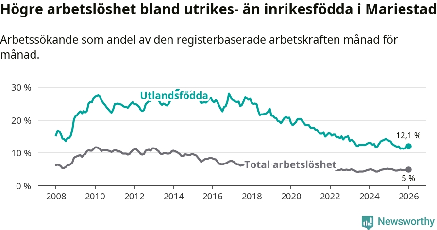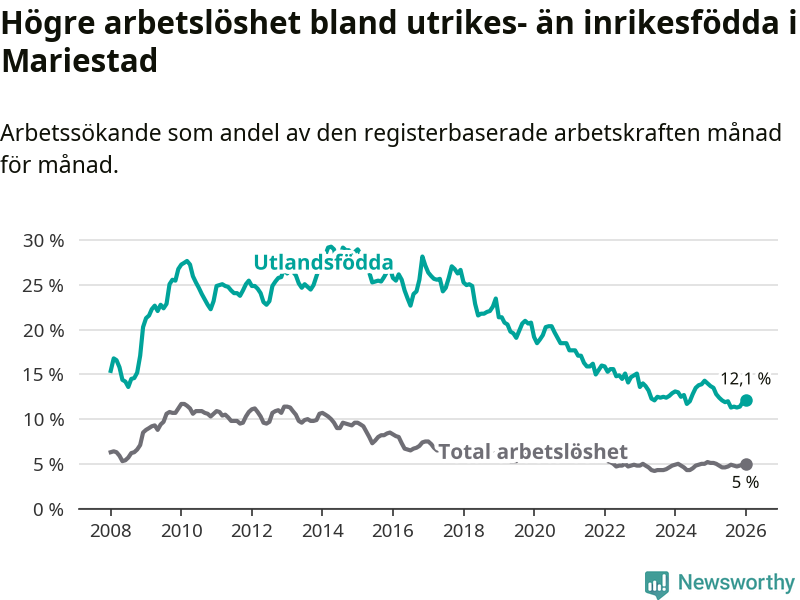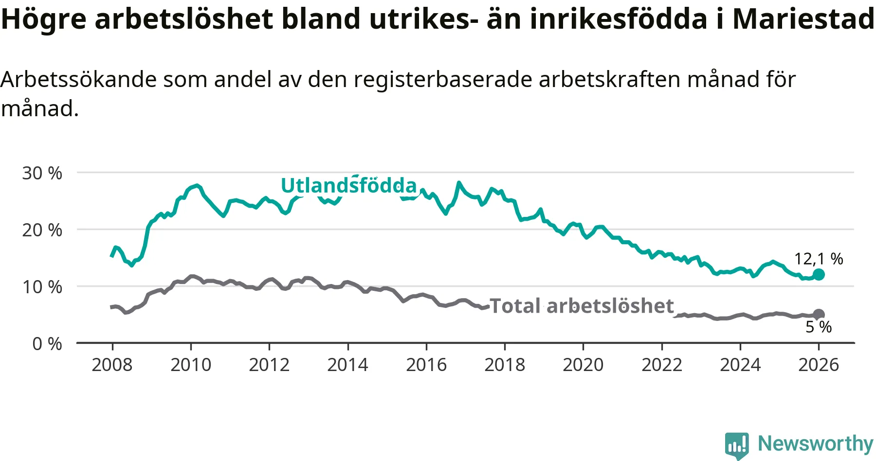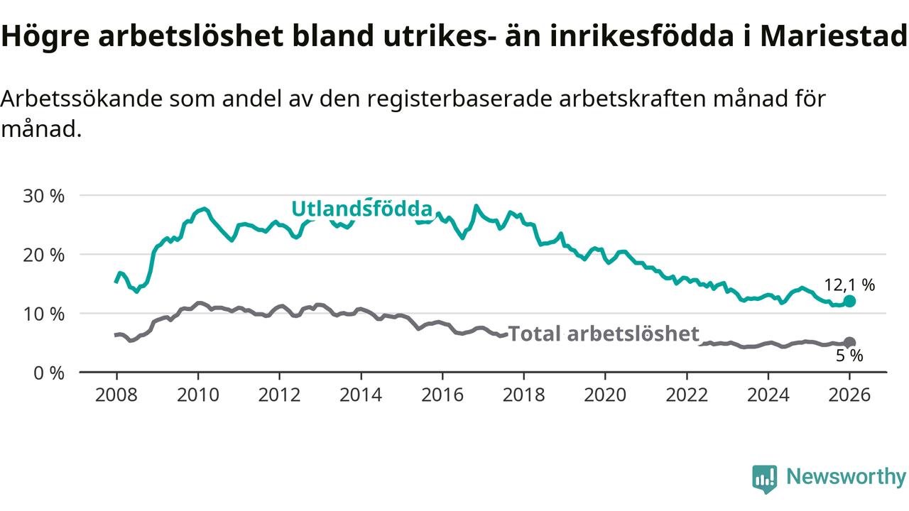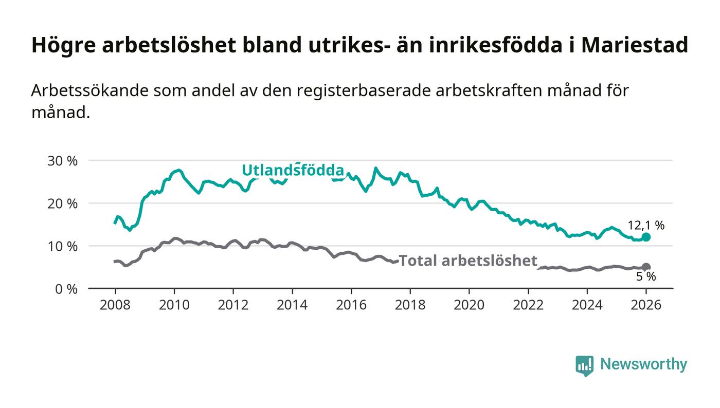 Arbetslösheten bland utlandsfödda var 12,1 procent i Mariestad under januari månad, motsvarande 197 av 1 628 personer. Det är 1,6 procentenheter färre än vid samma tidpunkt i fjol (−24 om man räknar personer). Därmed är de utlandsföddas arbetslöshet lägre än vid samma tidpunkt i fjol för åttonde månaden i följd.