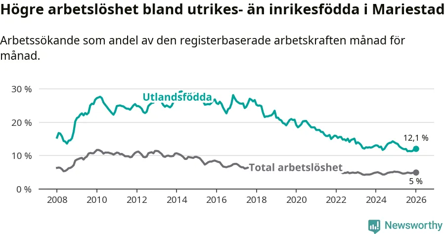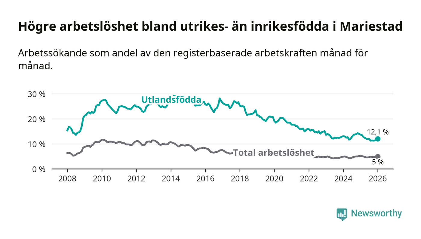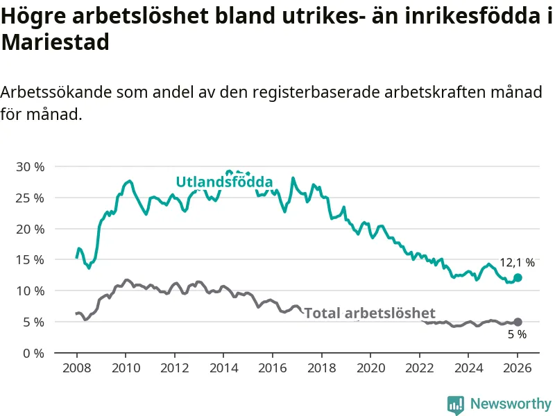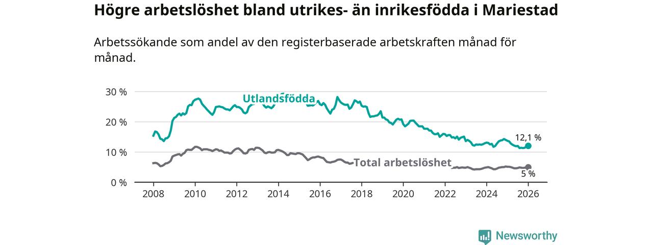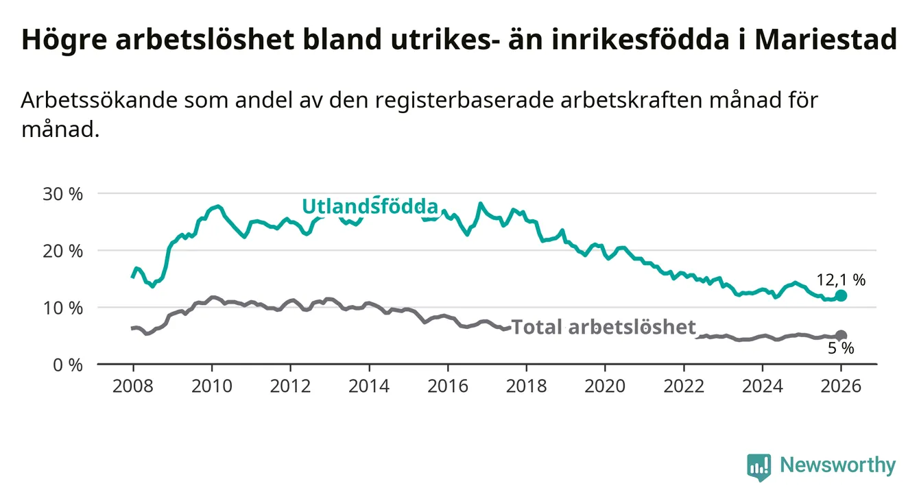 Skillnaden i arbetslöshet mellan utrikesfödda och hela befolkningen är 7,1 procentenheter i Mariestad. Det är en betydligt mindre skillnad än för ett år sedan (−1,5 procentenheter).