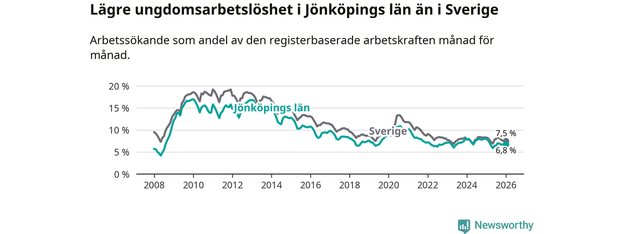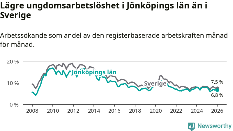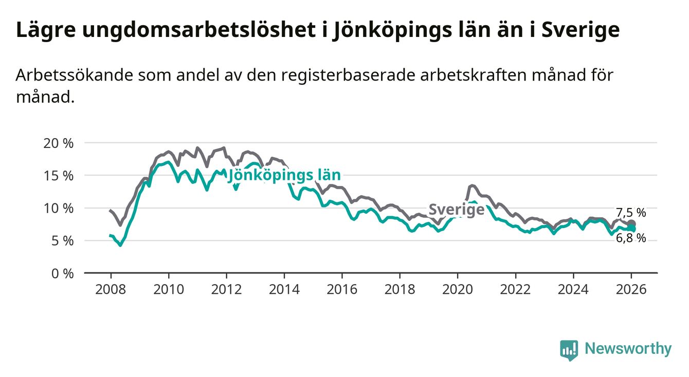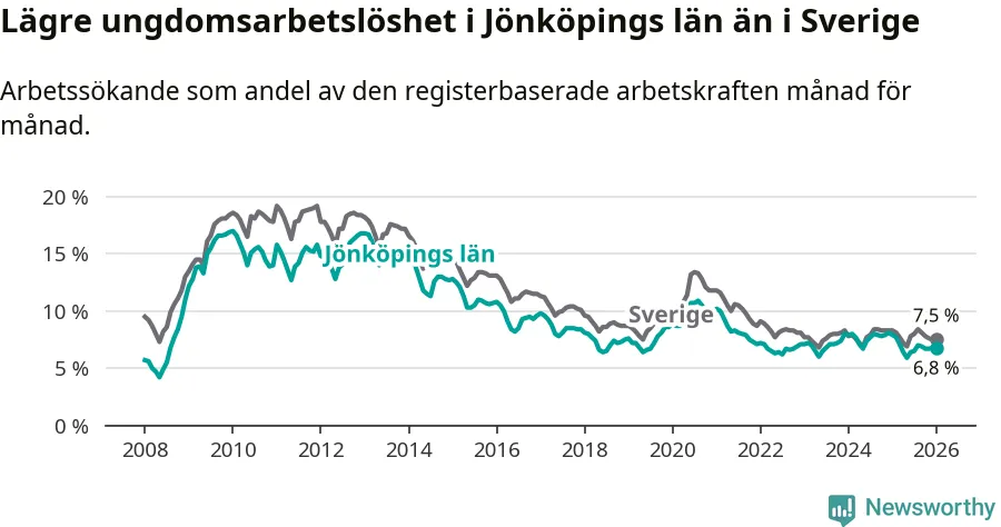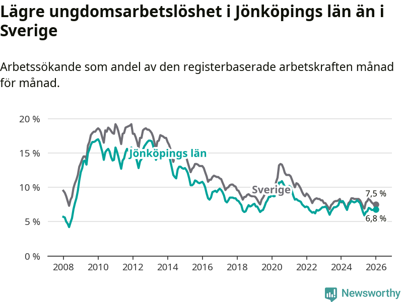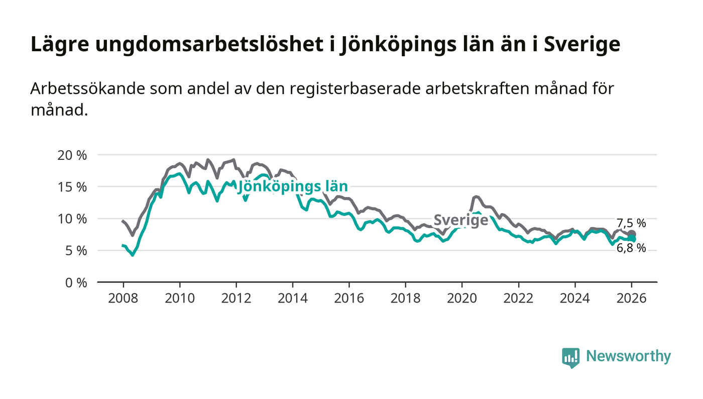 I och med den senaste månadens nedgång har de ungas arbetslöshet i Jönköping sjunkit tolv månader i följd (ner från 7,9 procent i januari 2025 till 6,8 procent nu).
