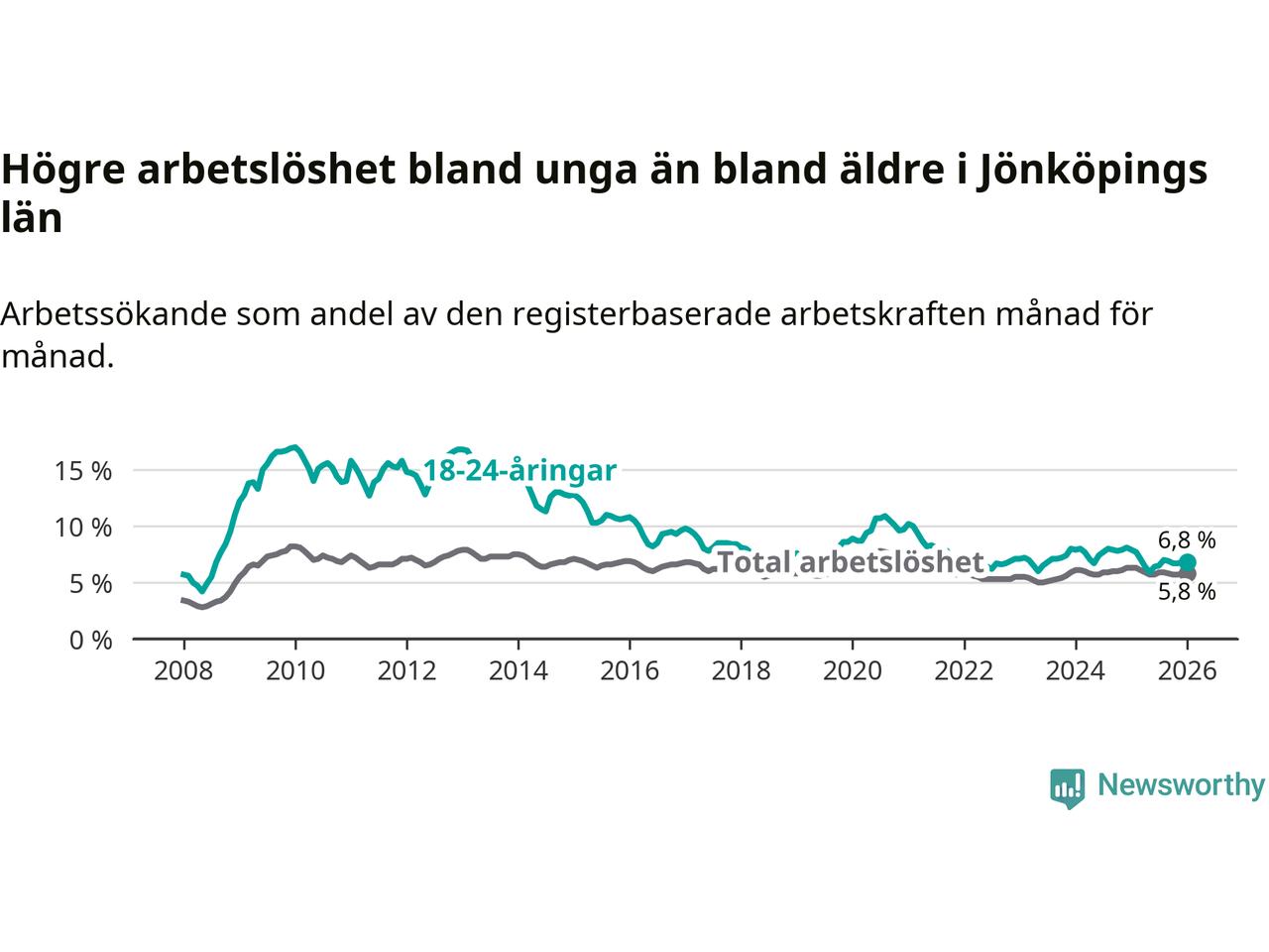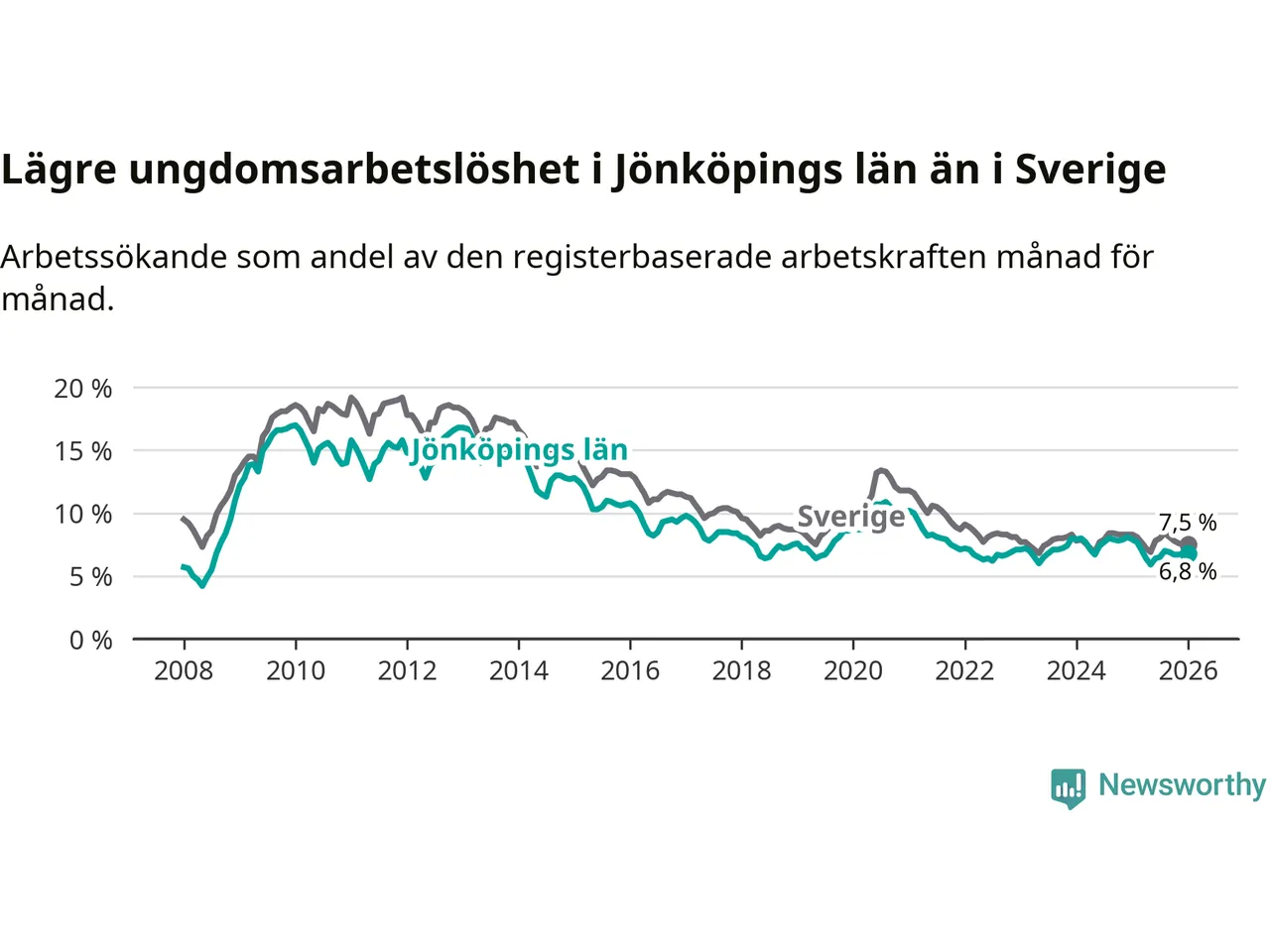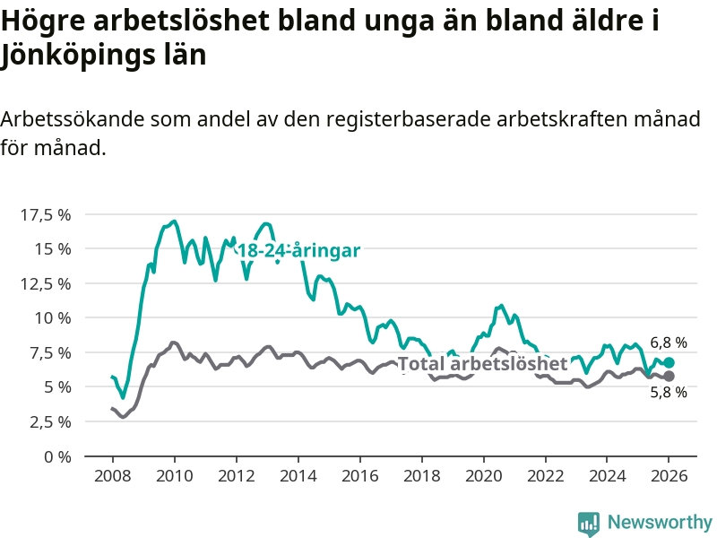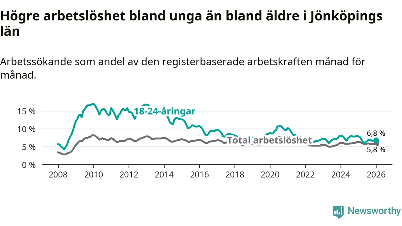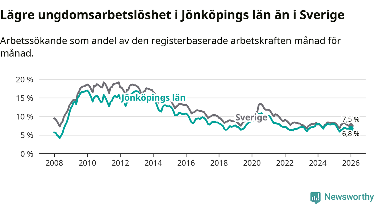 I och med den senaste månadens nedgång har de ungas arbetslöshet i Jönköping sjunkit tolv månader i följd (ner från 7,9 procent i januari 2025 till 6,8 procent nu).