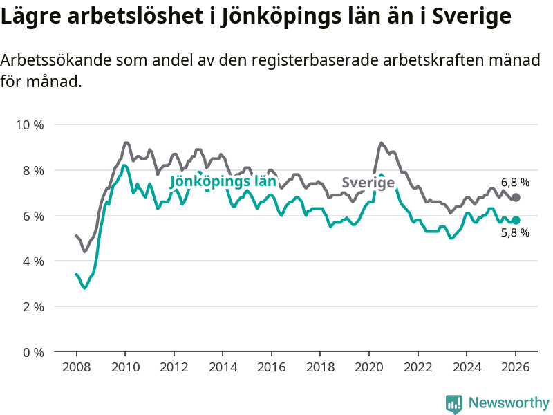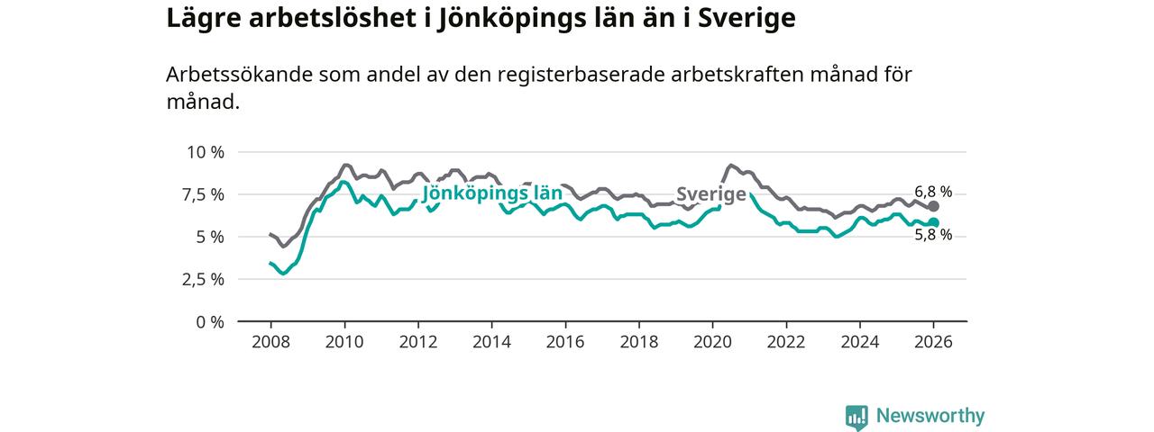 Under januari månad rapporterade Jönköpings län en total arbetslöshet på 5,8 procent. Det är en minskning jämfört med samma tidpunkt i fjol (−0,5 procentenheter). Även i Sverige sjunker arbetslösheten .