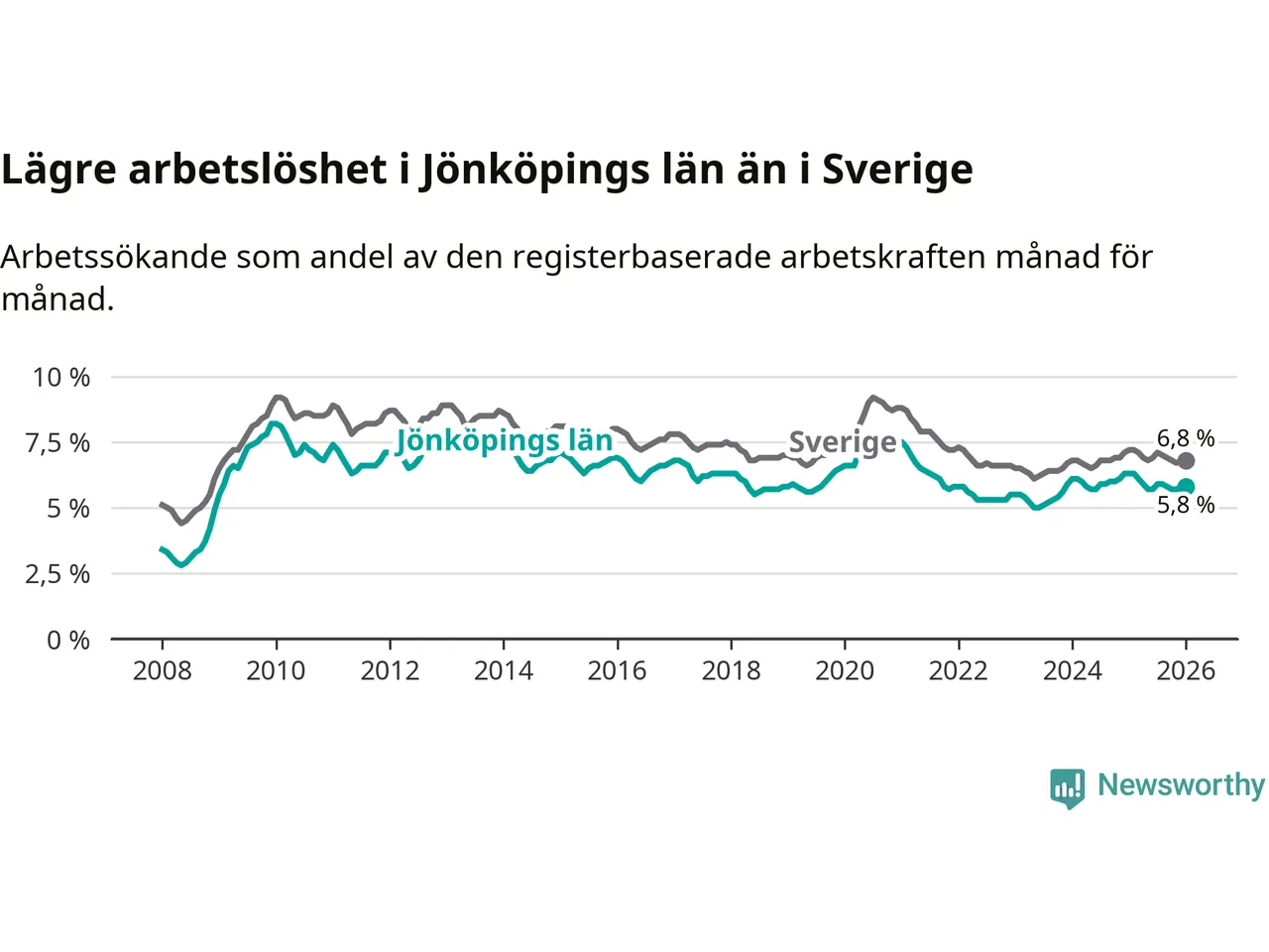 Jönköpings län hade redan tidigare lägre arbetslöshet än snittet i hela Sverige och nu växer klyftan (5,8 procent i länet, jämfört med 6,8 procent i hela riket). Norrbotten har den lägsta arbetslösheten i riket (3,9 procent), medan Skåne har den högsta (8,9 procent). För att Jönköpings län skulle komma ner i samma arbetslöshetsnivå som Norrbotten skulle 3 563 personer behöva sysselsättas.