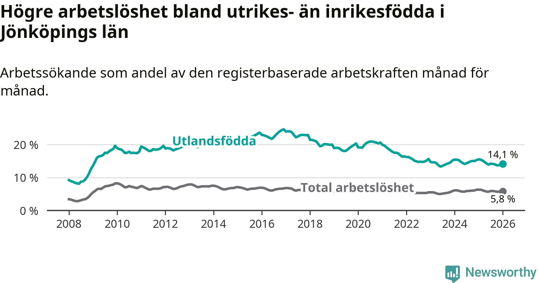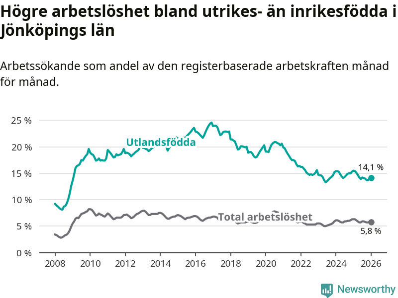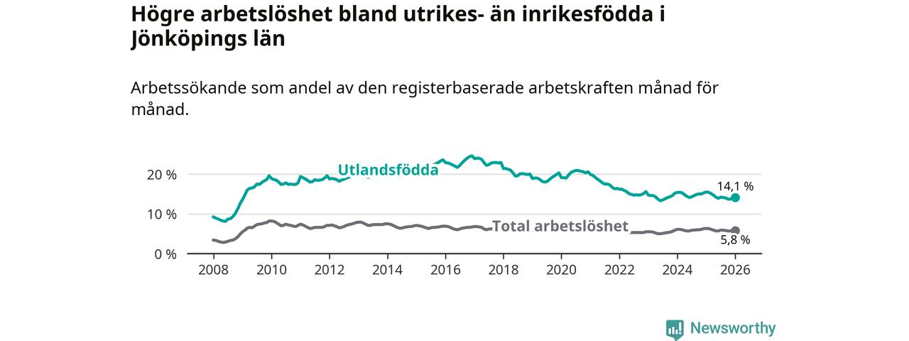 Arbetslösheten bland utlandsfödda var 14,1 procent i Jönköping under januari månad, motsvarande 6 216 av 44 085 personer. Det är 1,4 procentenheter färre än vid samma tidpunkt i fjol (−556 om man räknar personer). Därmed är de utlandsföddas arbetslöshet lägre än vid samma tidpunkt i fjol för elfte månaden i följd. Sedan februari 2025 har arbetslösheten bland utlandsfödda minskat från 15,4 till 14,1 procent.