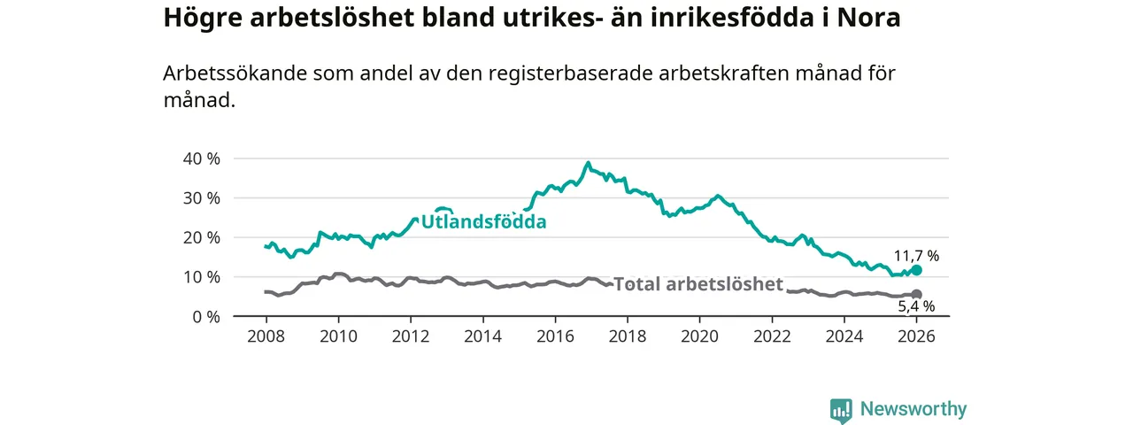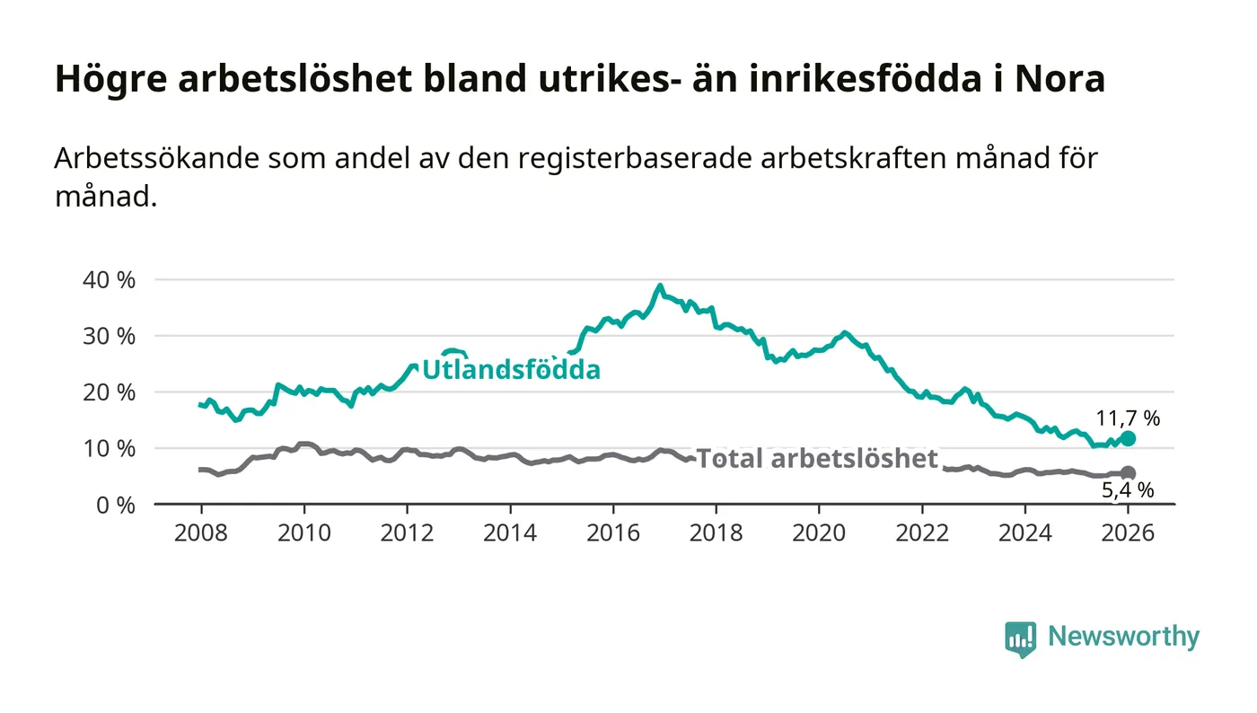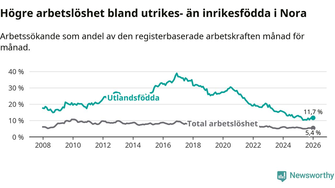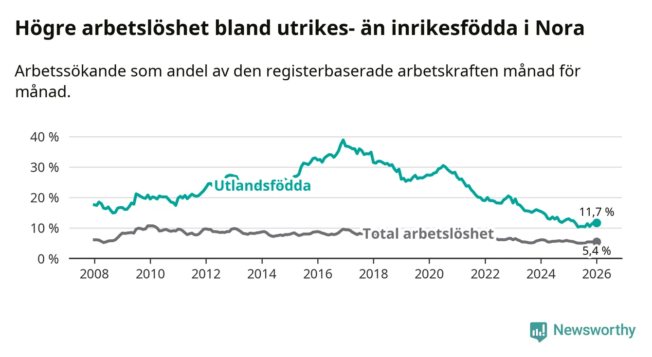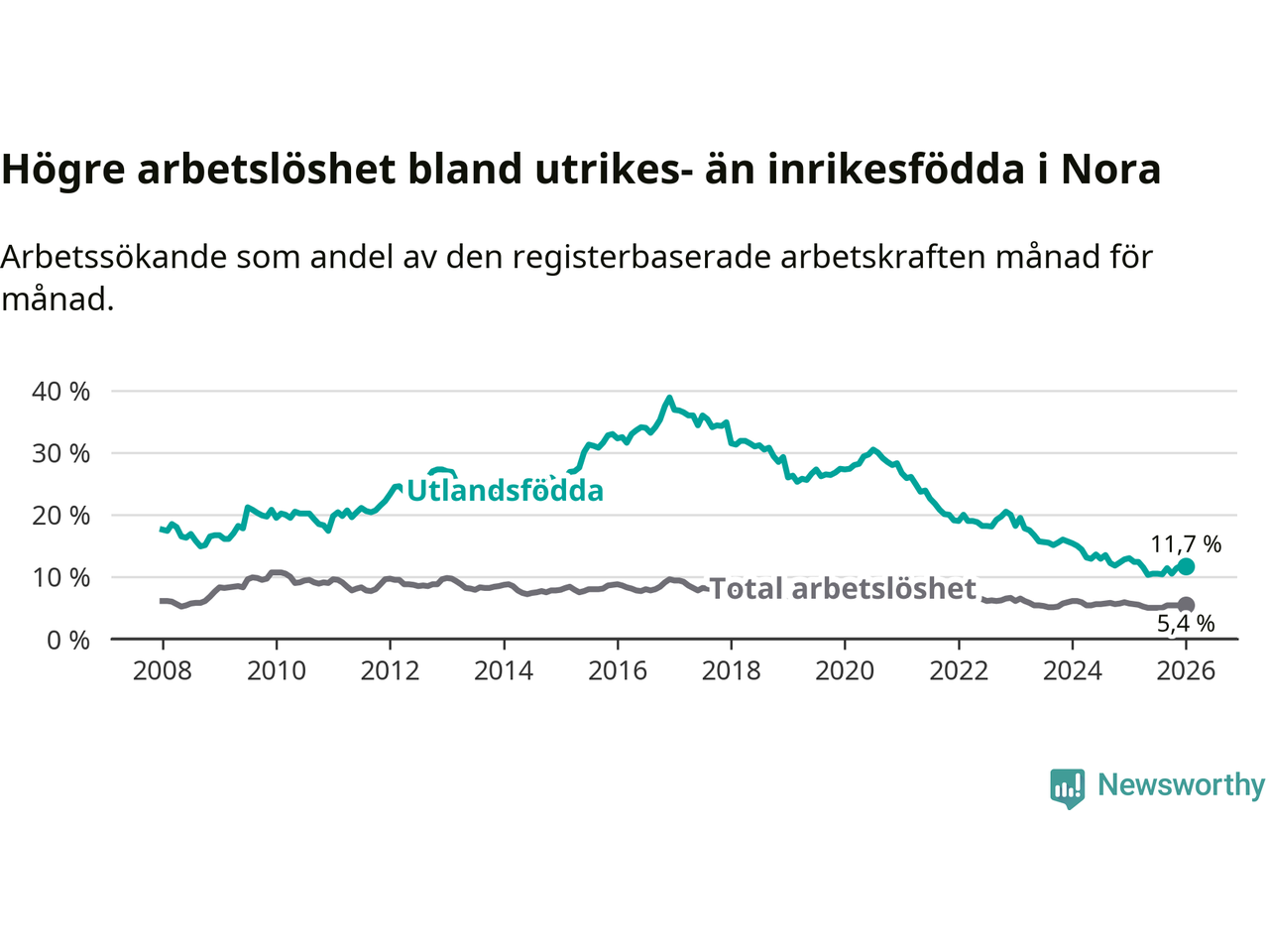 Arbetslösheten bland utlandsfödda var 11,7 procent i Nora under januari månad, motsvarande 84 av 718 personer. Det är 1,3 procentenheter färre än vid samma tidpunkt i fjol (−11 om man räknar personer). Därmed har de utlandsföddas arbetslöshet varit lägre än vid samma tidpunkt i fjol i över tre år i sträck. Sedan december 2022 har arbetslösheten bland utlandsfödda minskat från 20,0 till 11,7 procent.
