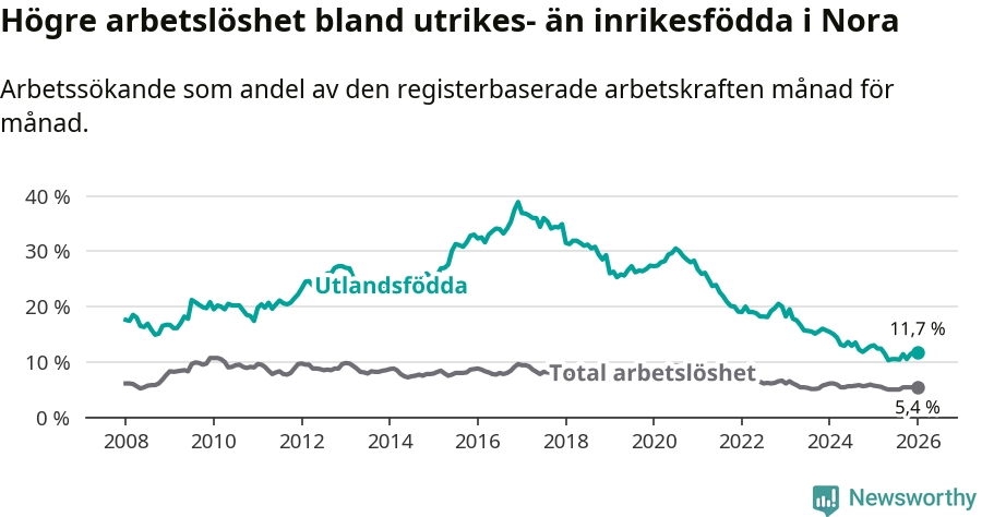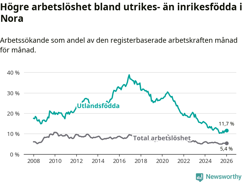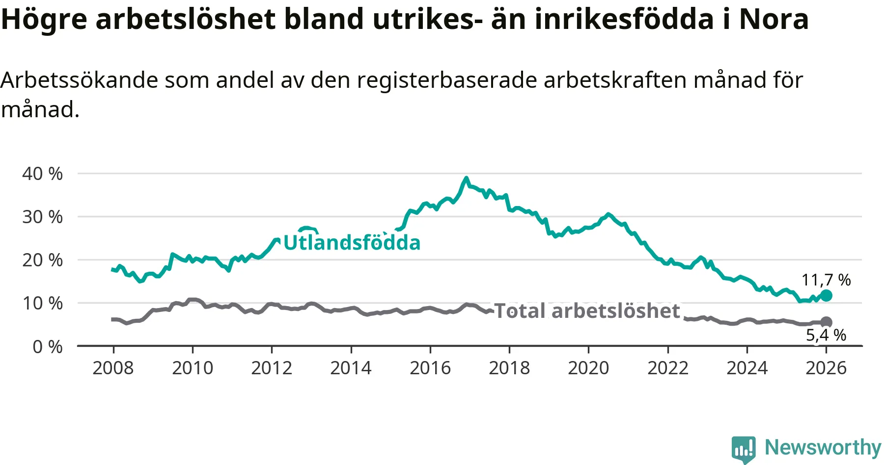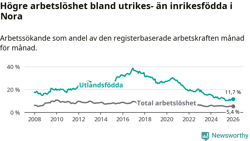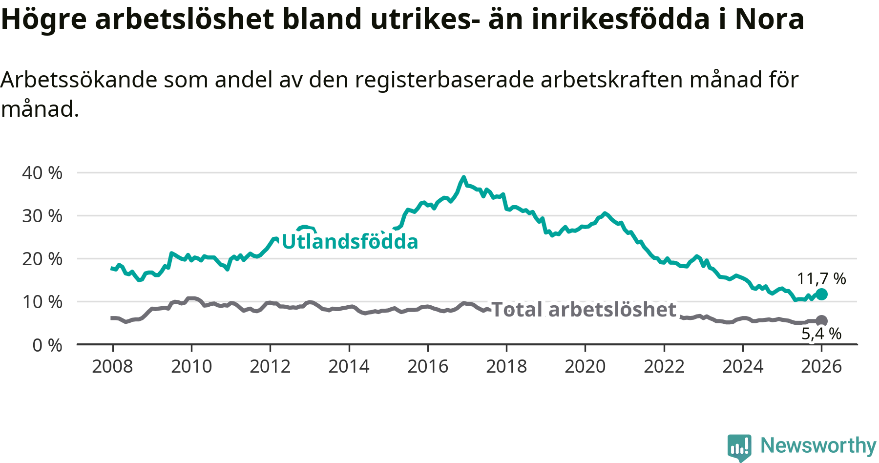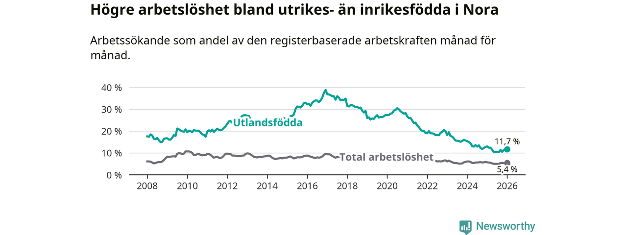 Arbetslösheten bland utlandsfödda var 11,7 procent i Nora under januari månad, motsvarande 84 av 718 personer. Det är 1,3 procentenheter färre än vid samma tidpunkt i fjol (−11 om man räknar personer). Därmed har de utlandsföddas arbetslöshet varit lägre än vid samma tidpunkt i fjol i över tre år i sträck. Sedan december 2022 har arbetslösheten bland utlandsfödda minskat från 20,0 till 11,7 procent.