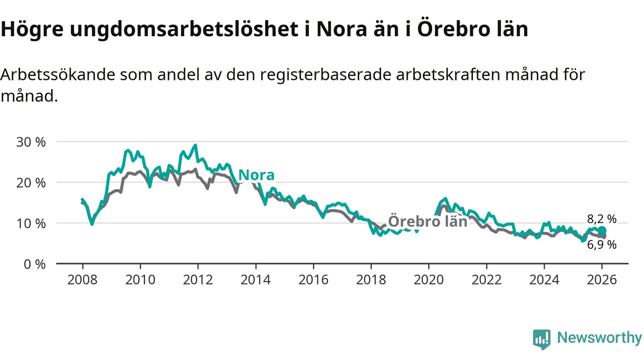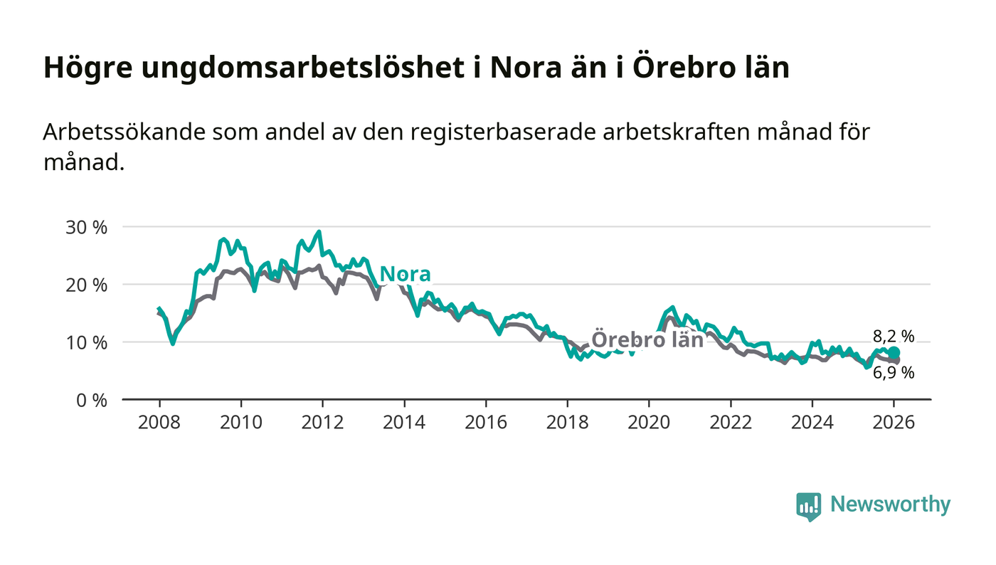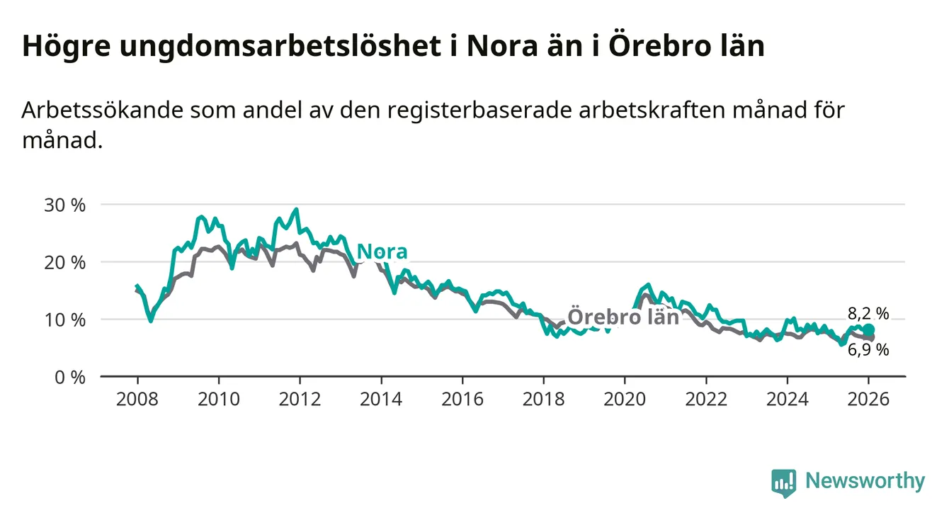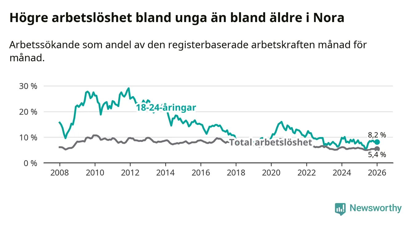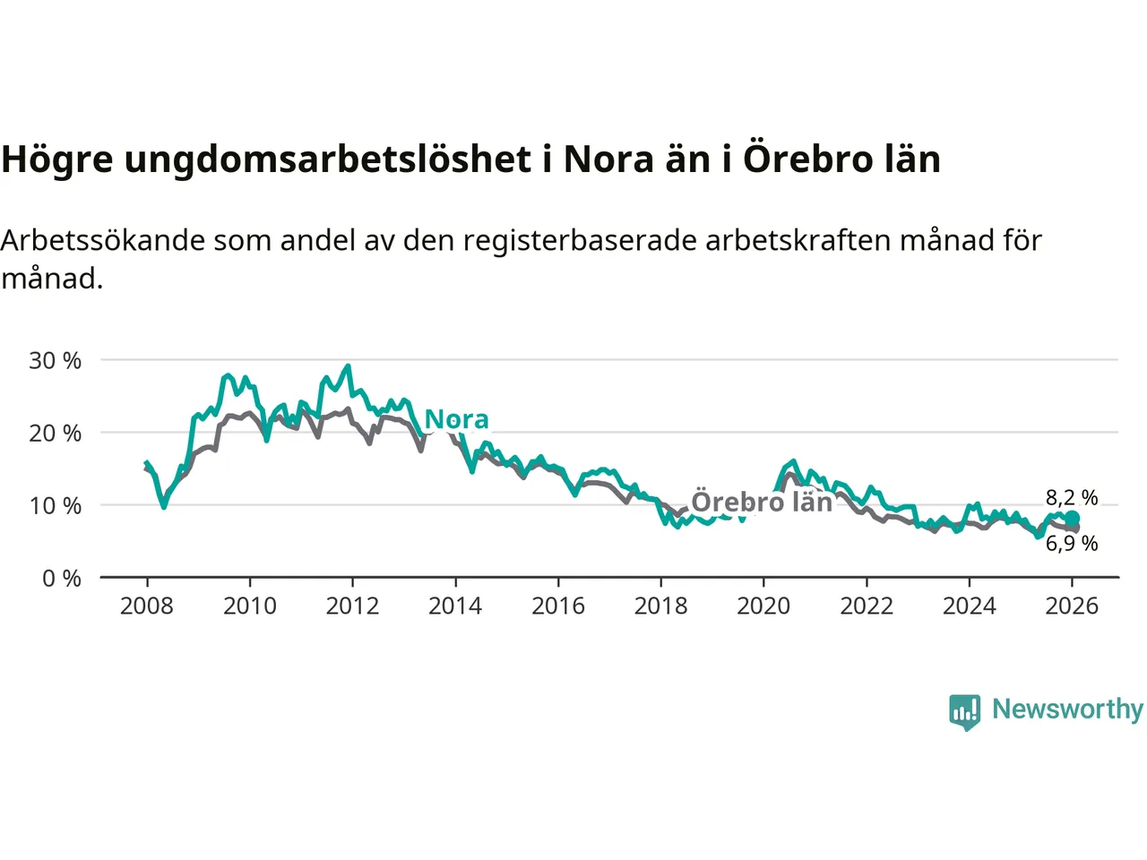 Medan Nora har lägre total arbetslöshet än Örebro, ligger ungdomsarbetslösheten 1,3 procentenheter högre i Nora.