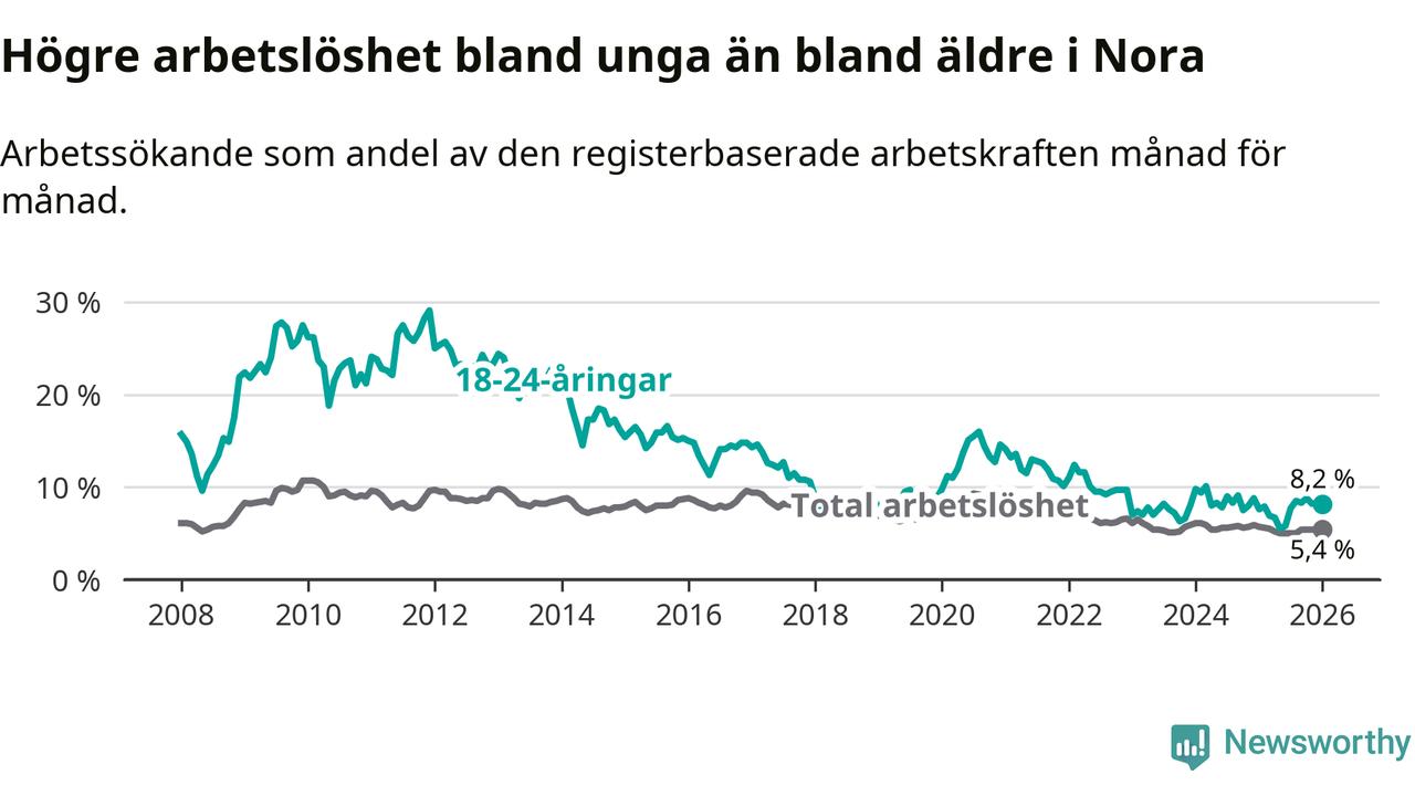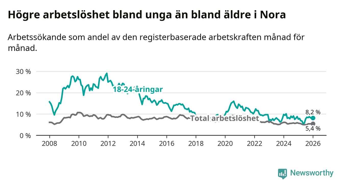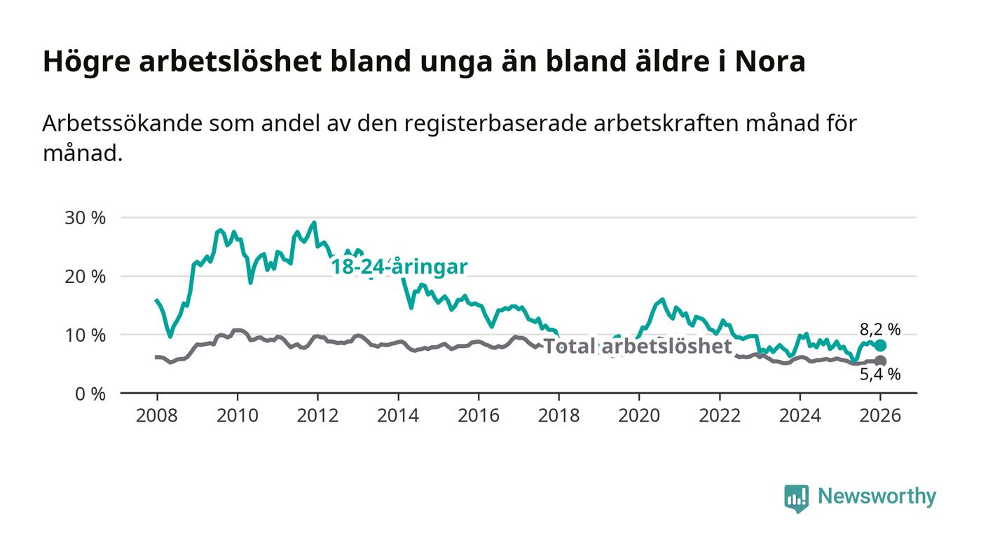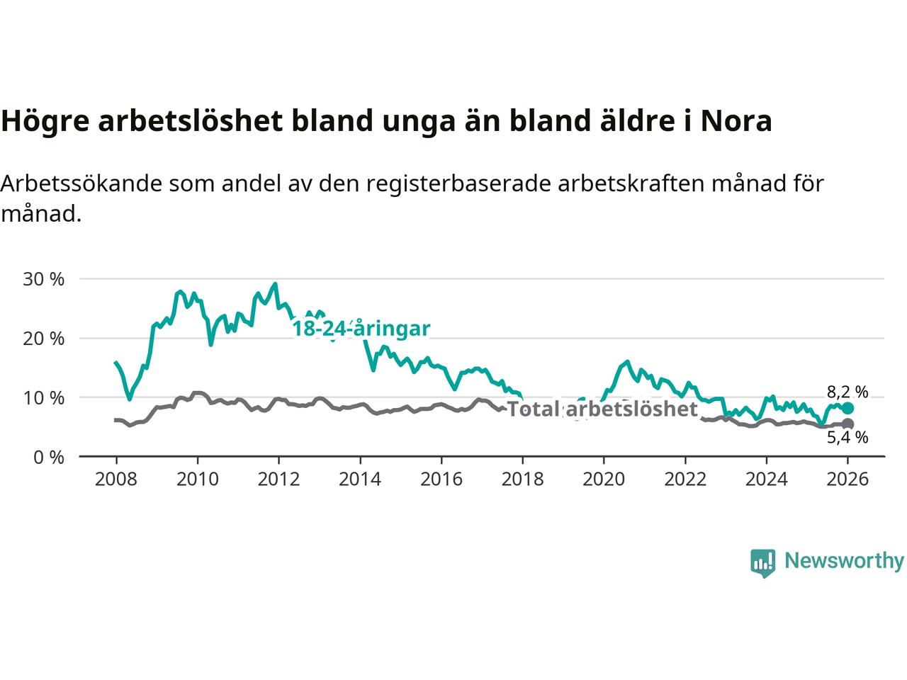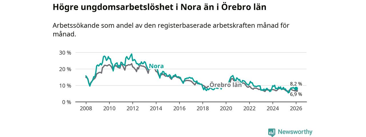 Medan Nora har lägre total arbetslöshet än Örebro, ligger ungdomsarbetslösheten 1,3 procentenheter högre i Nora.