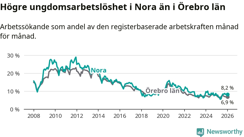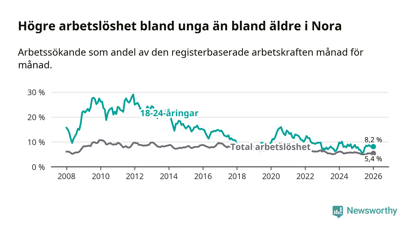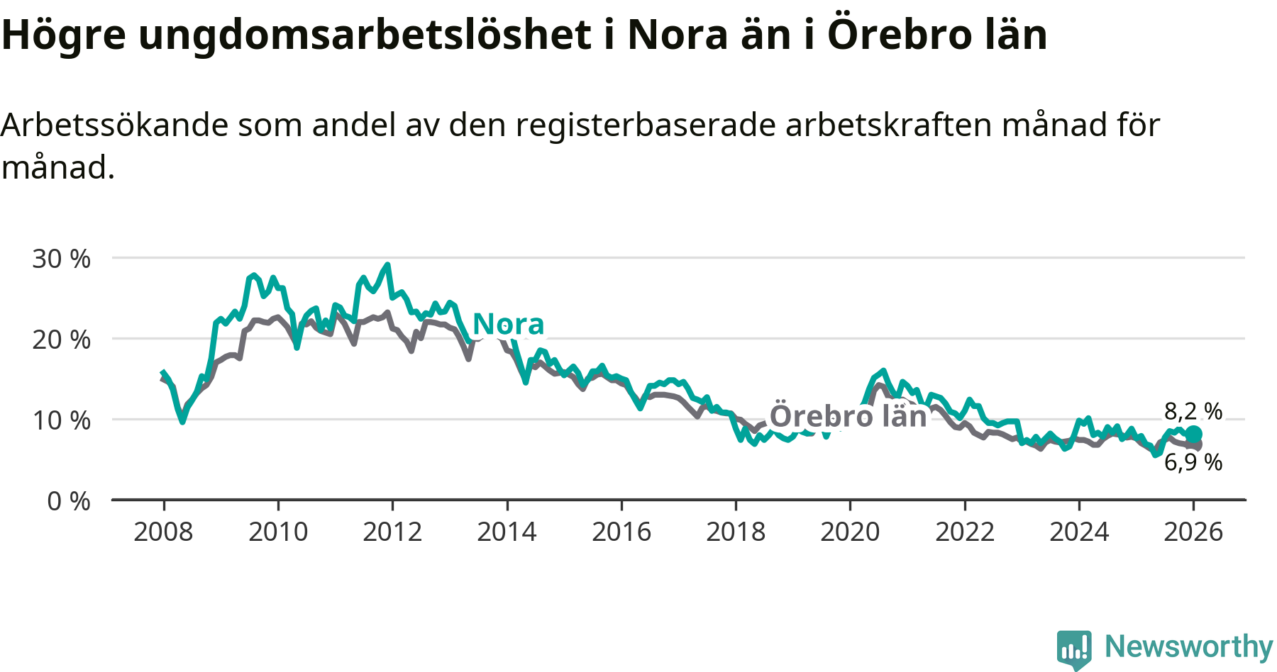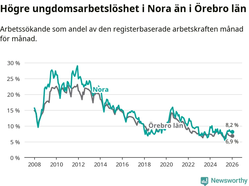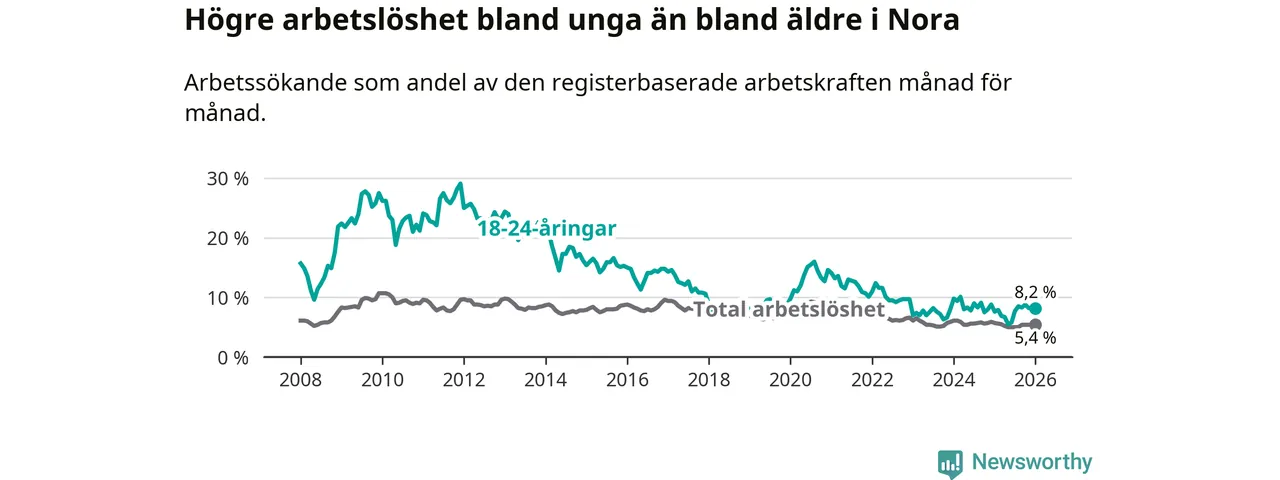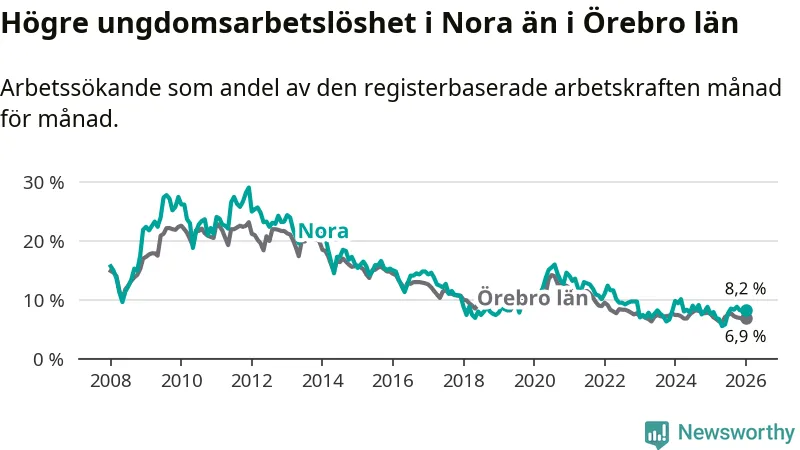 Medan Nora har lägre total arbetslöshet än Örebro, ligger ungdomsarbetslösheten 1,3 procentenheter högre i Nora.