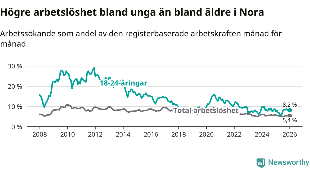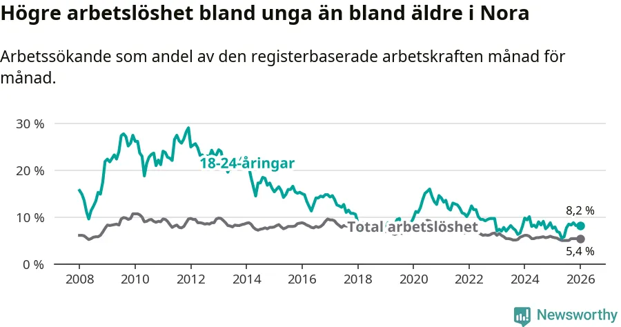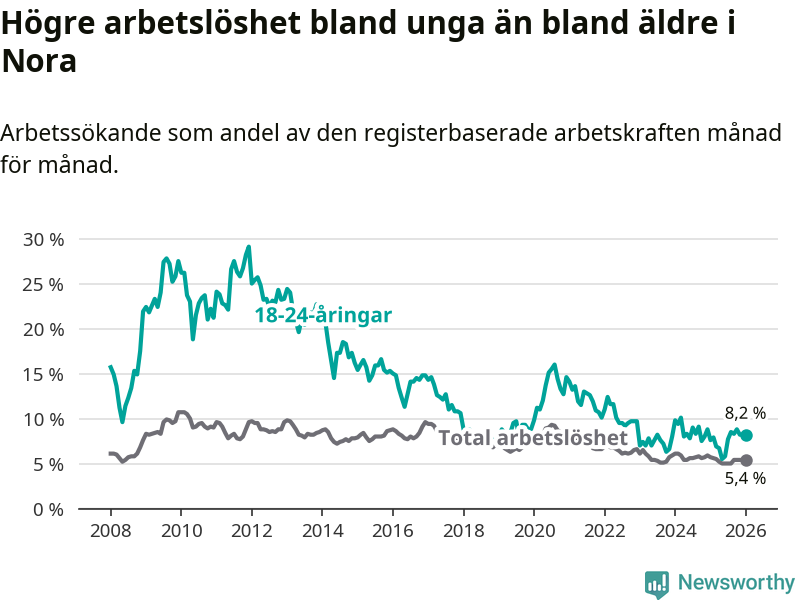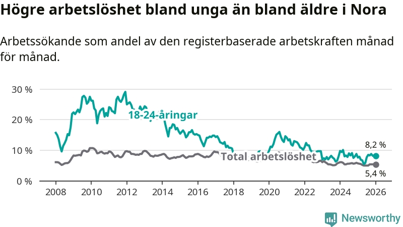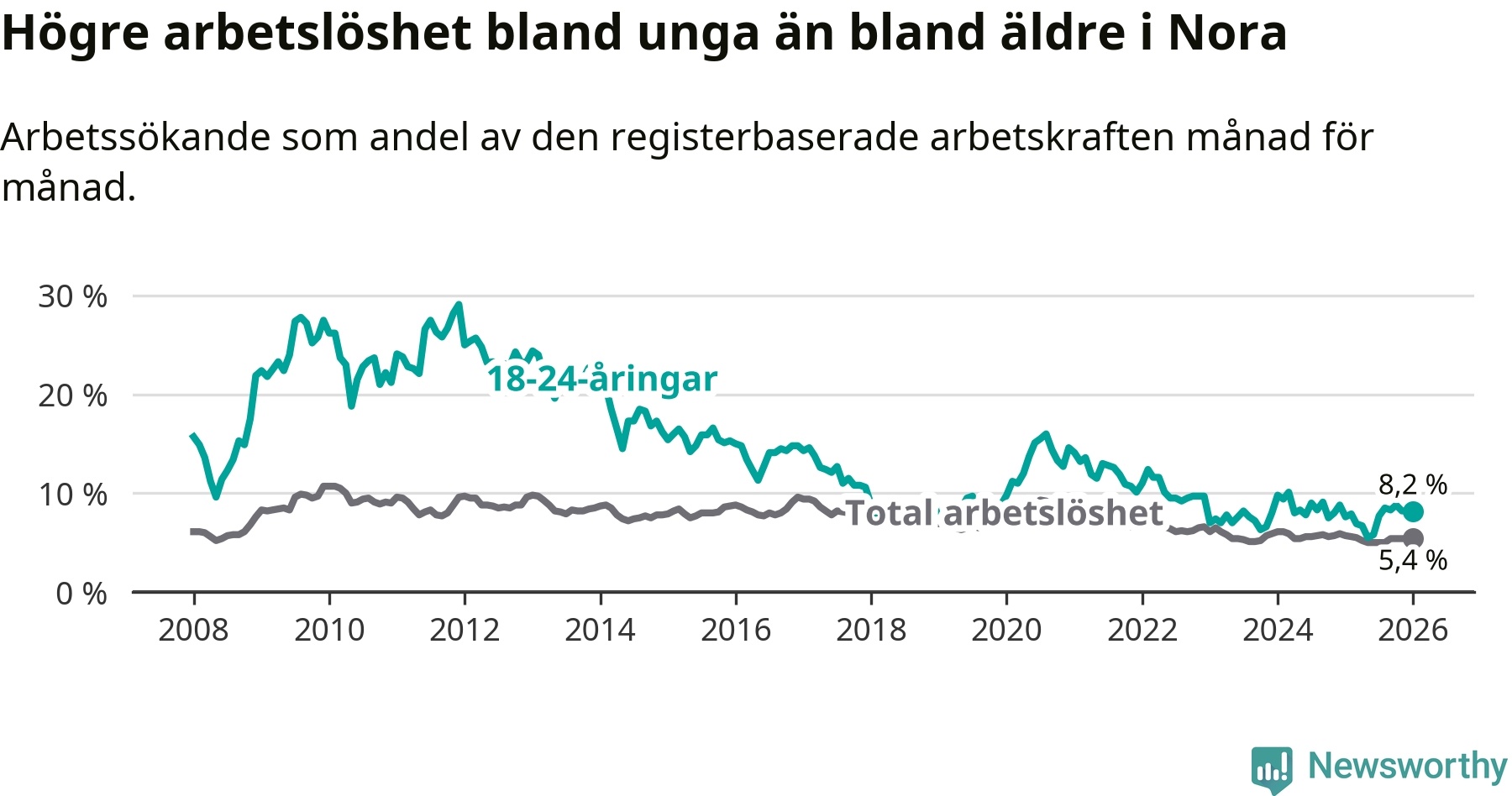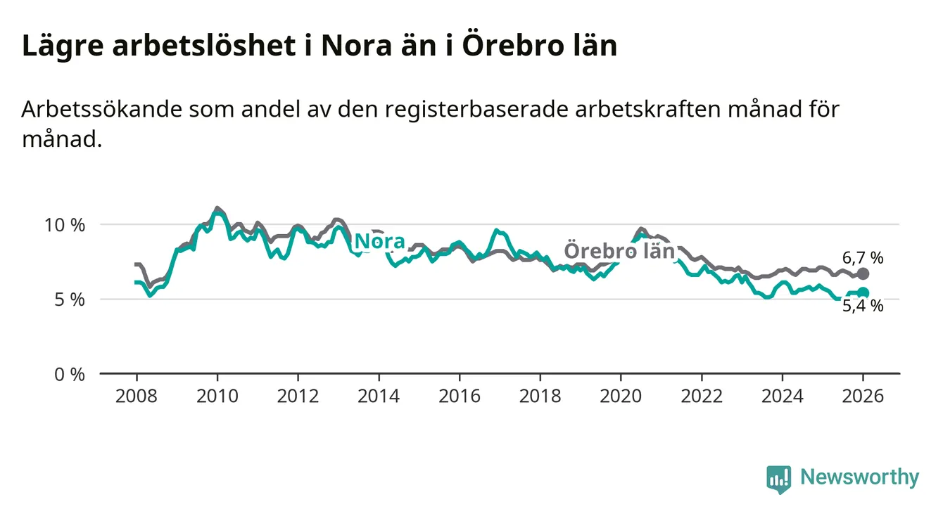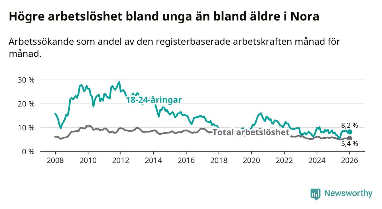 Medan Nora har lägre total arbetslöshet än Örebro, ligger ungdomsarbetslösheten 1,3 procentenheter högre i Nora.