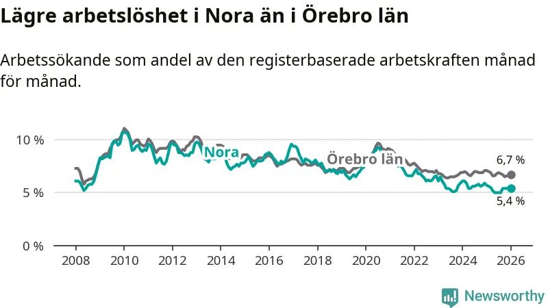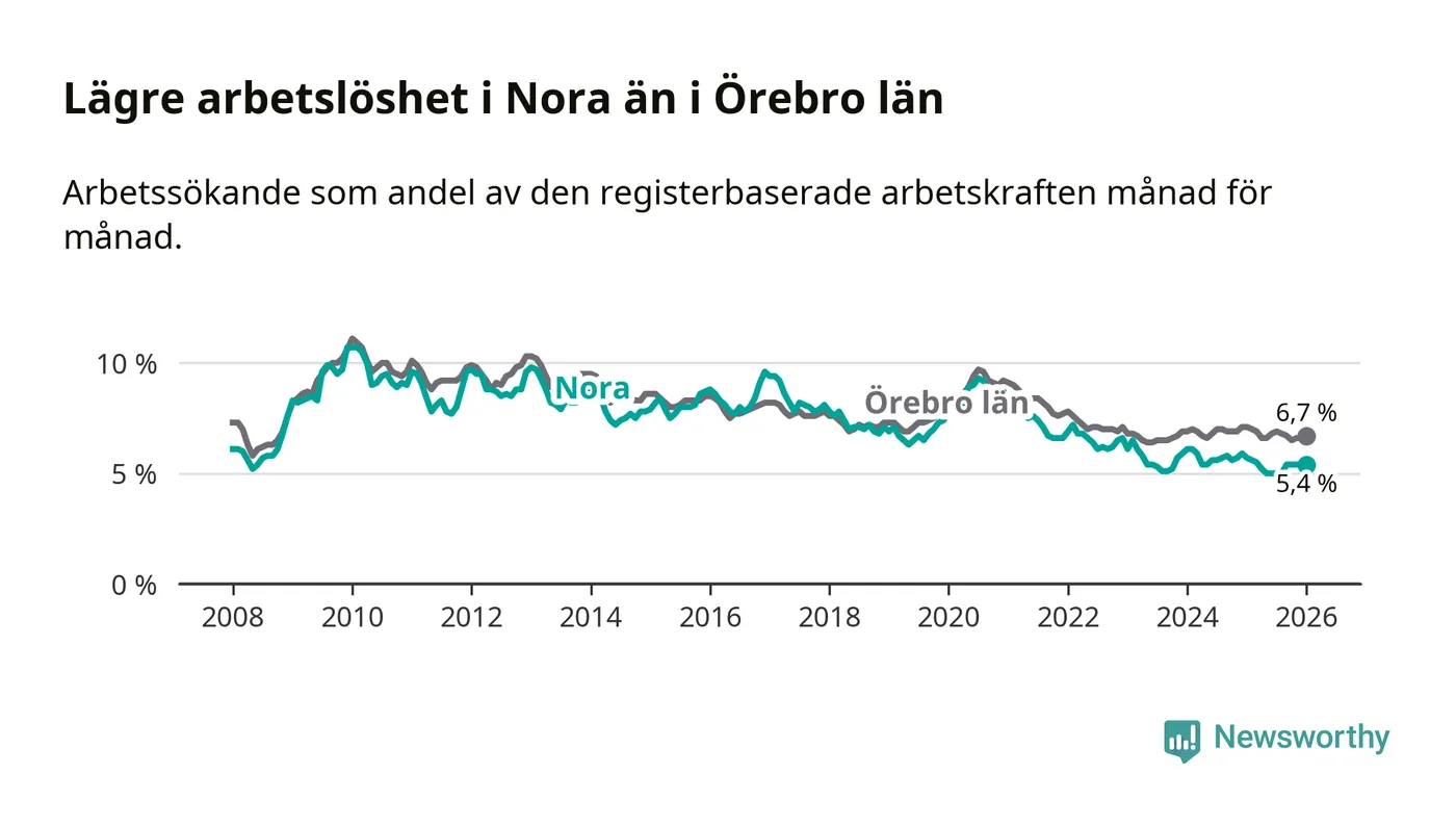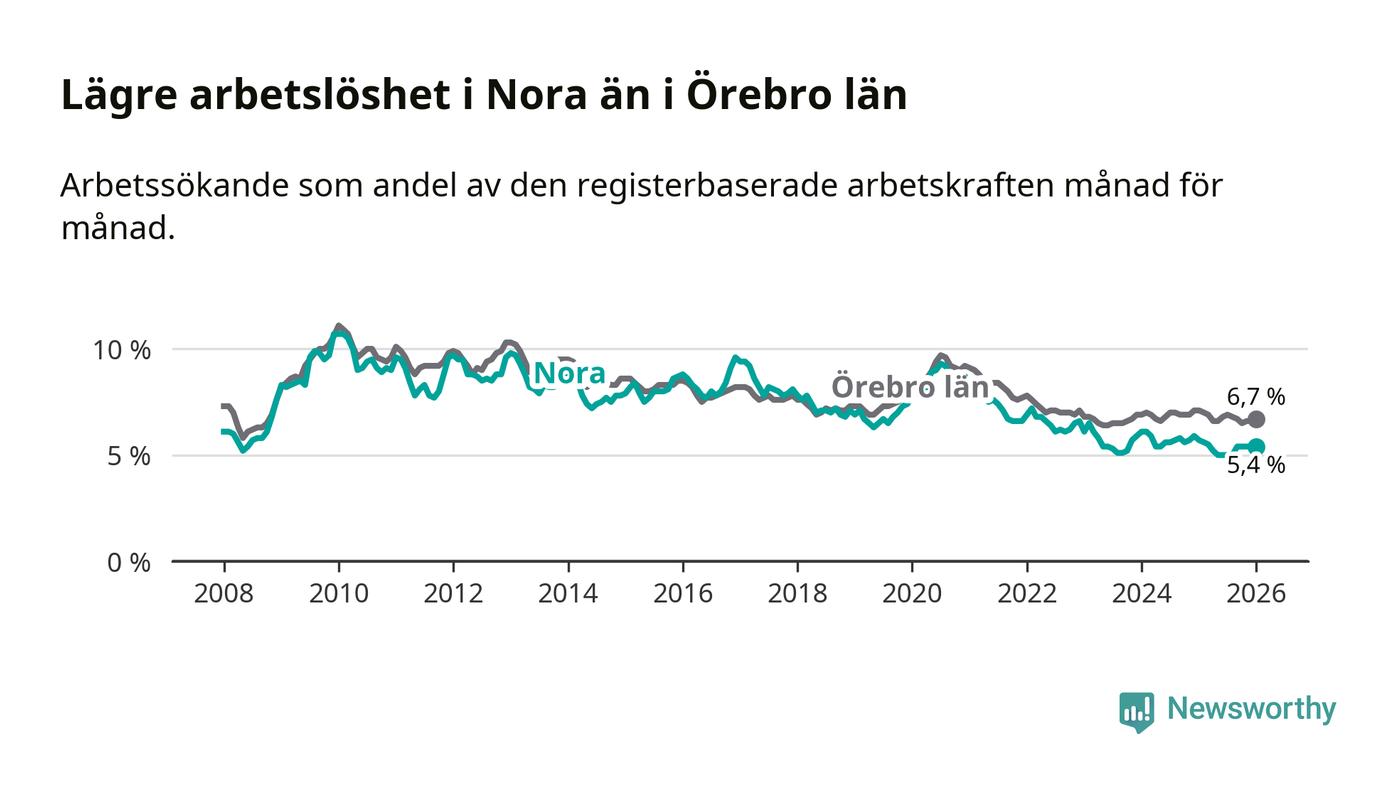Nora hade redan tidigare lägre arbetslöshet än snittet i hela Örebro län och nu växer klyftan (5,4 procent i kommunen, jämfört med 6,7 procent i hela länet). Askersund och Lekeberg har den lägsta arbetslösheten i länet (4,1 procent), medan Ljusnarsberg har den högsta (7,6 procent). För att Nora skulle komma ner i samma arbetslöshetsnivå som Askersund och Lekeberg skulle 62 personer behöva sysselsättas.