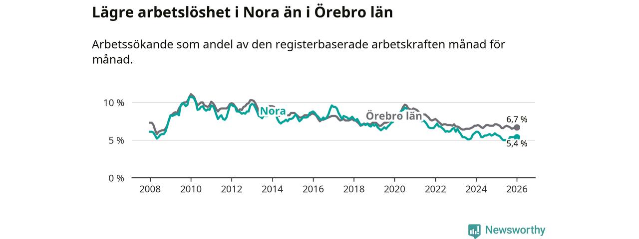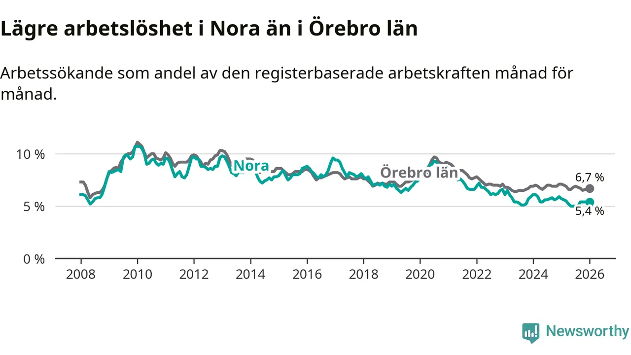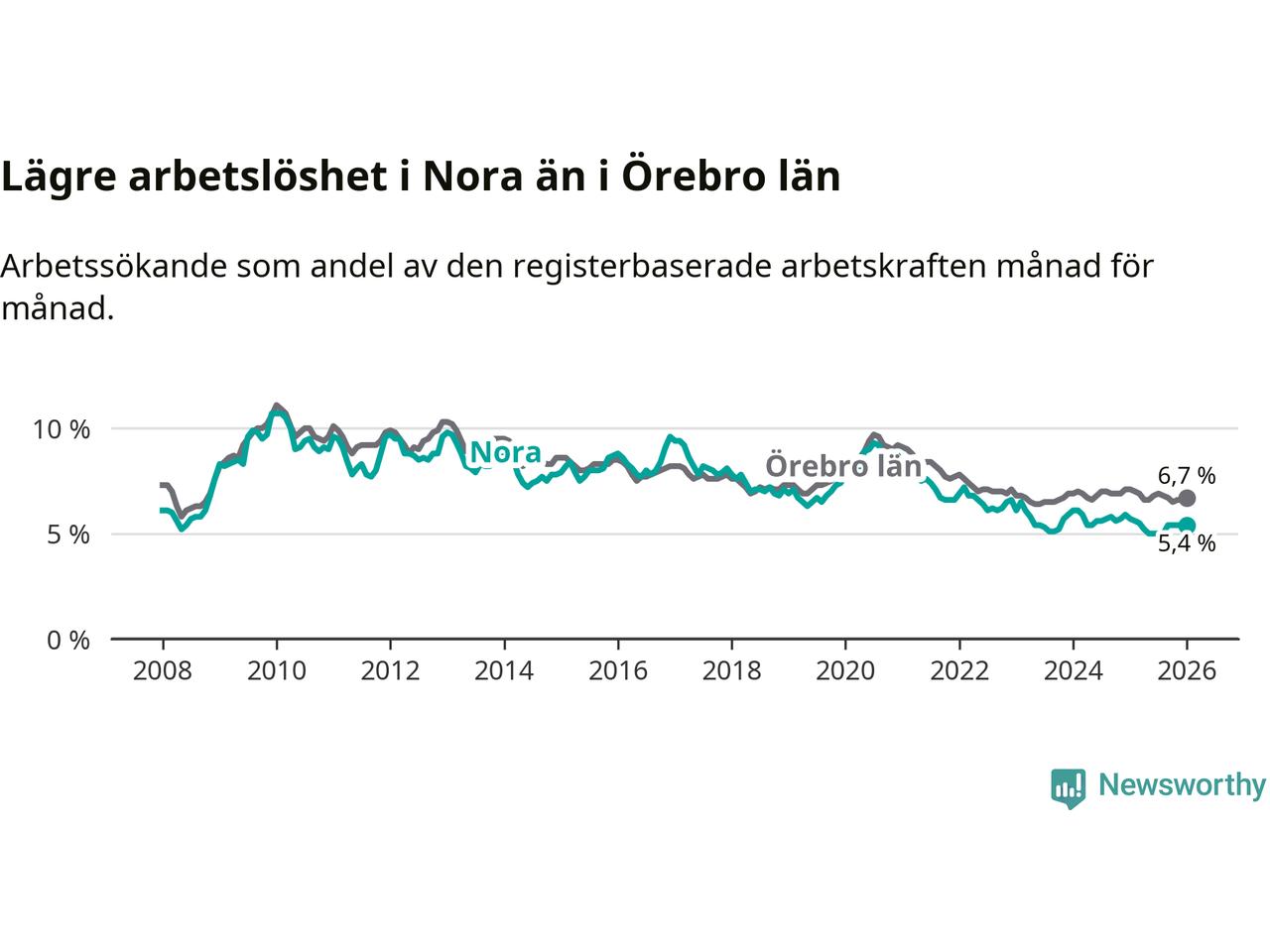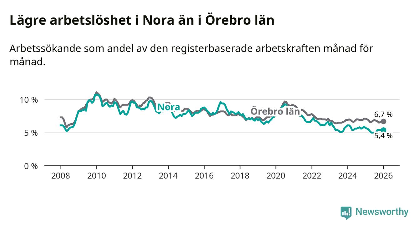Under januari månad rapporterade Nora kommun en total arbetslöshet på 5,4 procent. Det är en minskning jämfört med samma tidpunkt i fjol (−0,3 procentenheter). Även i Örebro län sjunker arbetslösheten .