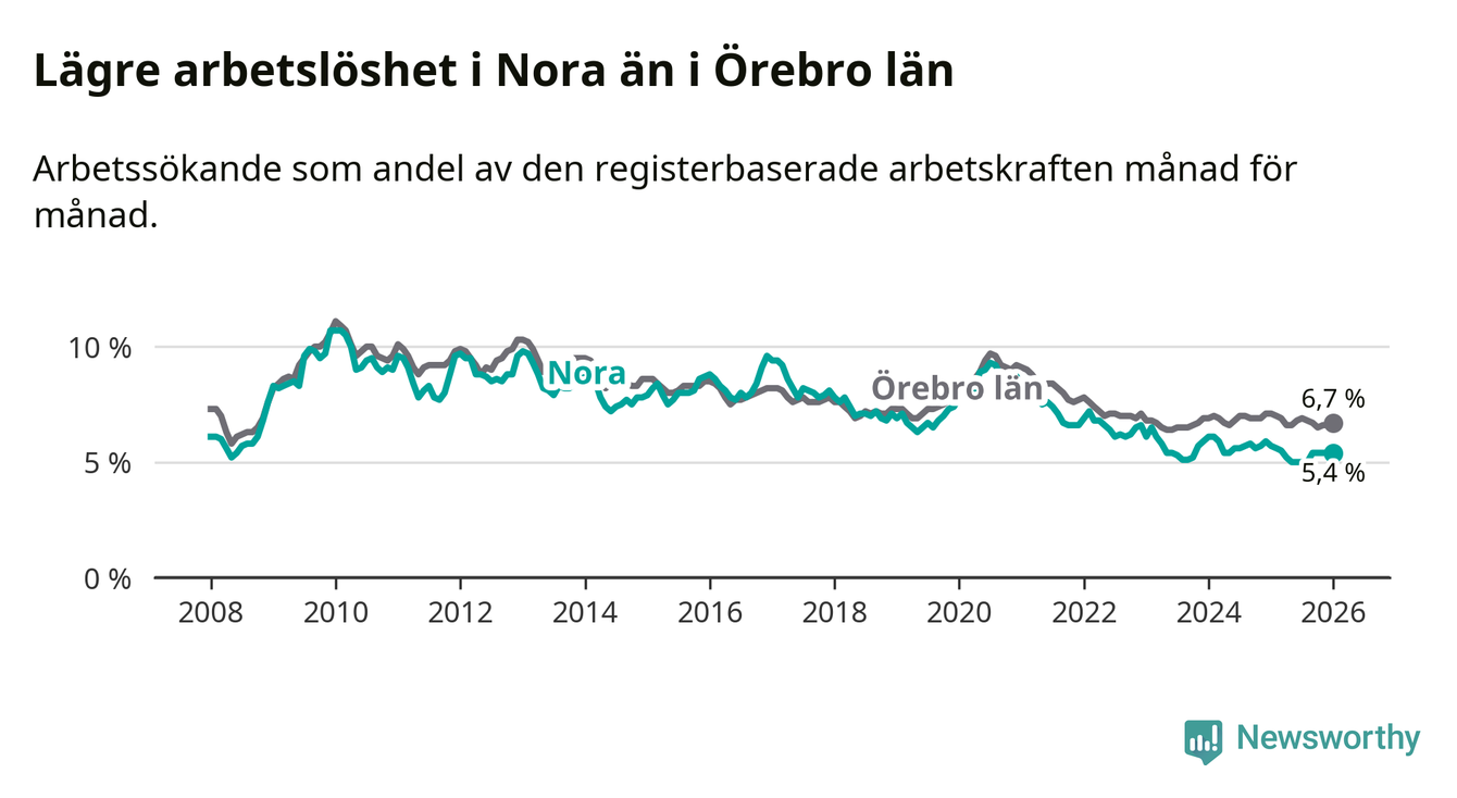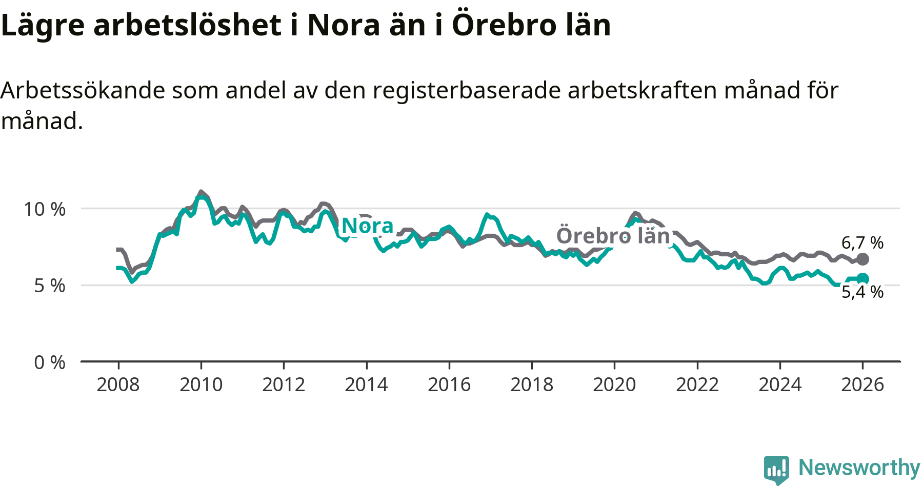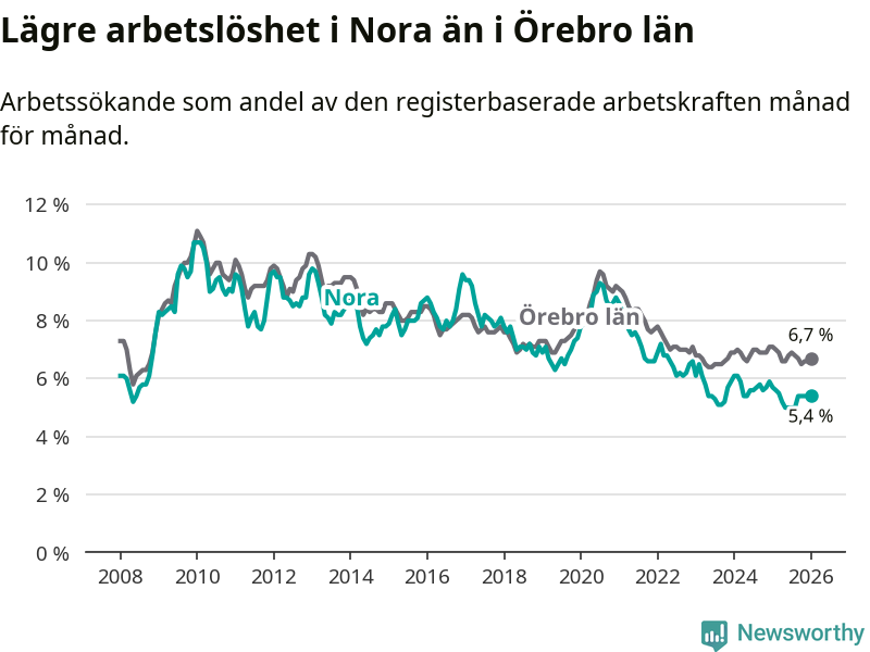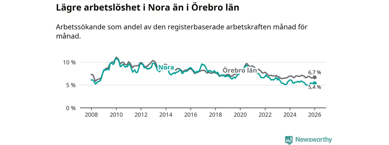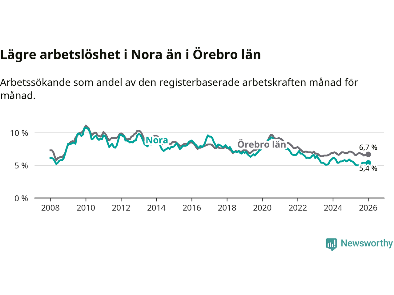 Under januari månad rapporterade Nora kommun en total arbetslöshet på 5,4 procent. Det är en minskning jämfört med samma tidpunkt i fjol (−0,3 procentenheter). Även i Örebro län sjunker arbetslösheten .