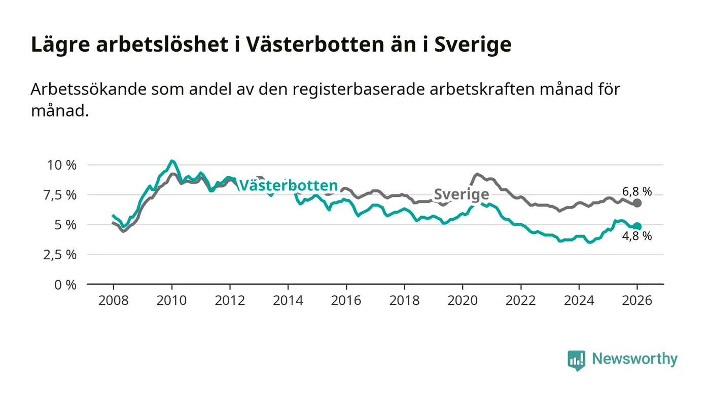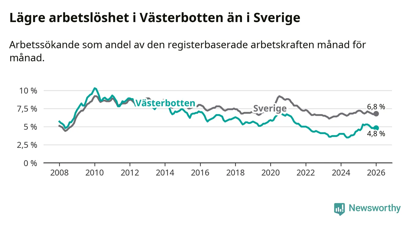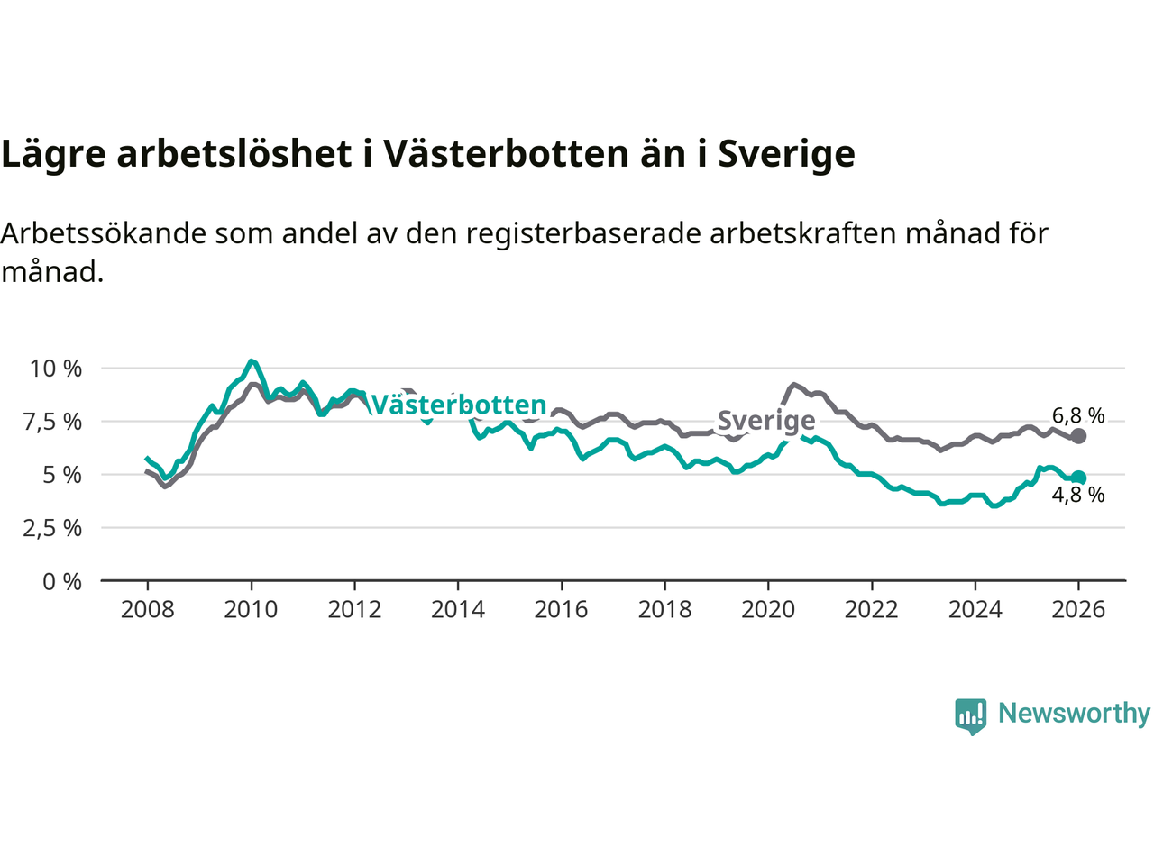 Även om arbetslösheten i Västerbotten alltså ökar, så ligger den fortfarande under snittet i hela Sverige (4,8 procent i länet, jämfört med 6,8 procent i hela riket). Norrbotten har den lägsta arbetslösheten i riket (3,9 procent), medan Skåne har den högsta (8,9 procent). För att Västerbotten skulle komma ner i samma arbetslöshetsnivå som Norrbotten skulle 1 283 personer behöva sysselsättas.