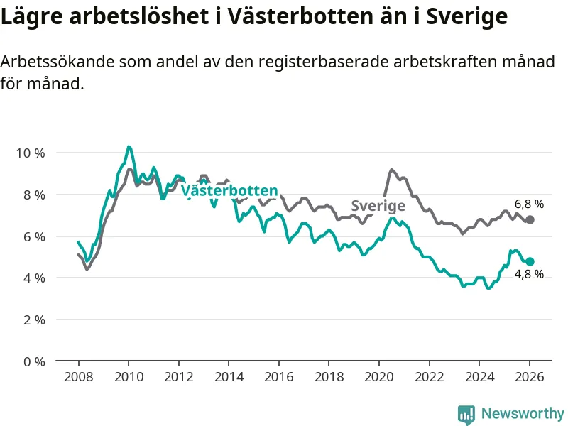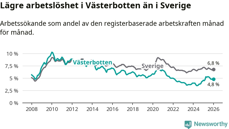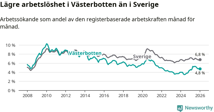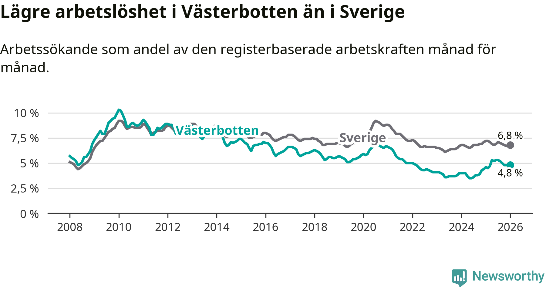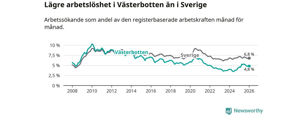 Även om arbetslösheten i Västerbotten alltså ökar, så ligger den fortfarande under snittet i hela Sverige (4,8 procent i länet, jämfört med 6,8 procent i hela riket). Norrbotten har den lägsta arbetslösheten i riket (3,9 procent), medan Skåne har den högsta (8,9 procent). För att Västerbotten skulle komma ner i samma arbetslöshetsnivå som Norrbotten skulle 1 283 personer behöva sysselsättas.