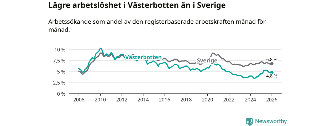 Under januari månad rapporterade Västerbottens län en total arbetslöshet på 4,8 procent. Det är en ökning jämfört med samma tidpunkt i fjol (+0,2 procentenheter). I Sverige däremot sjunker arbetslösheten .