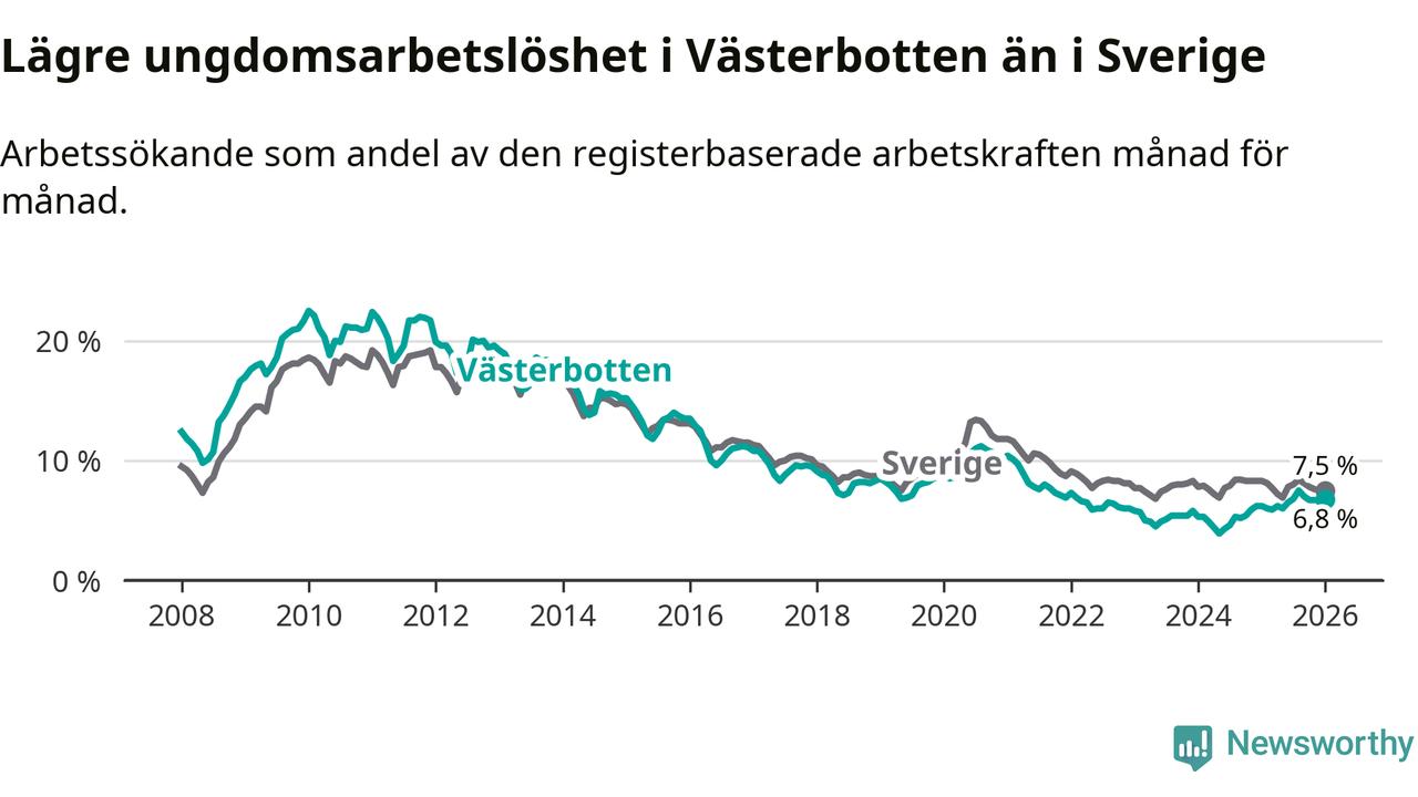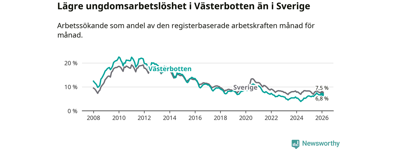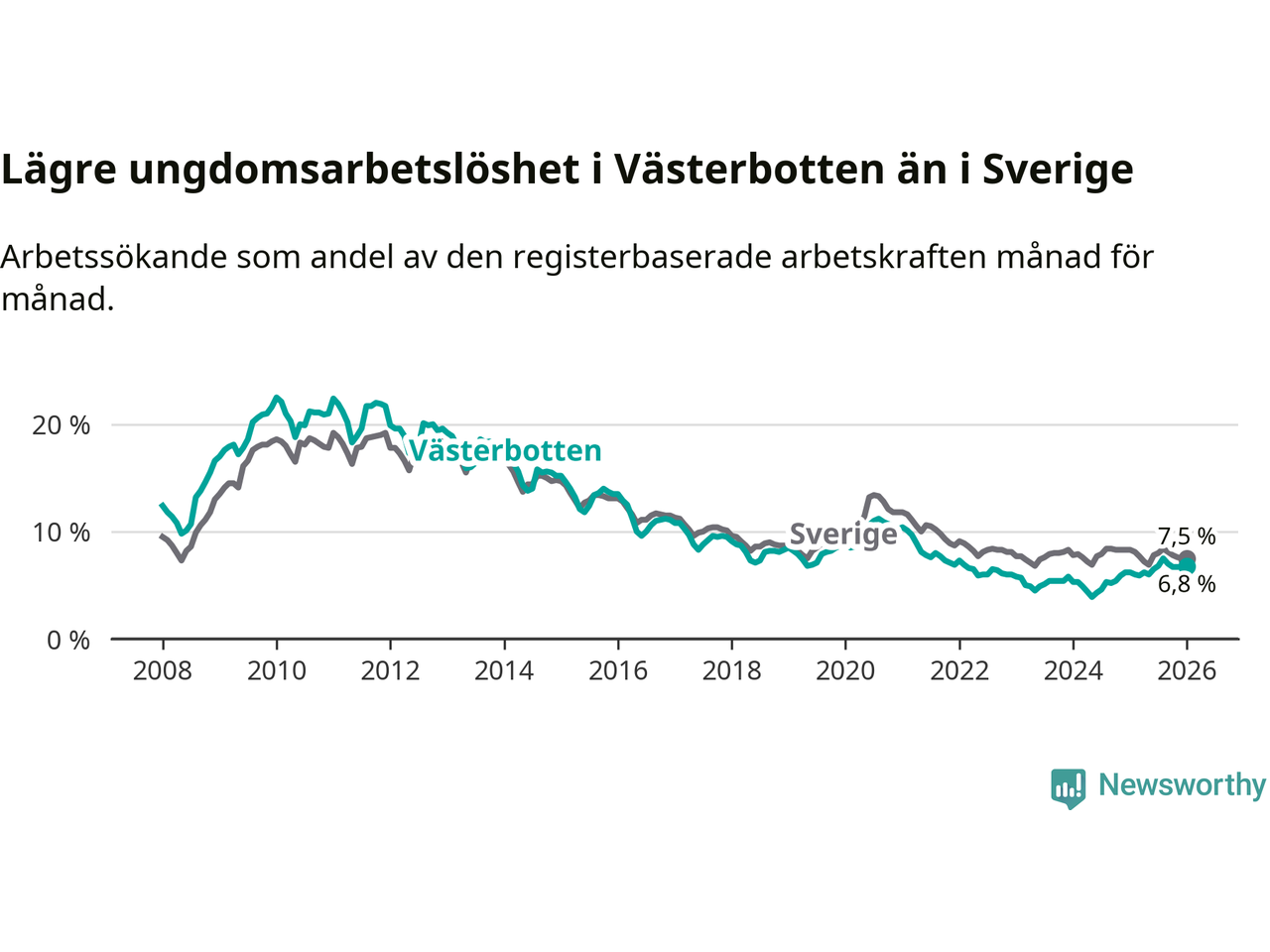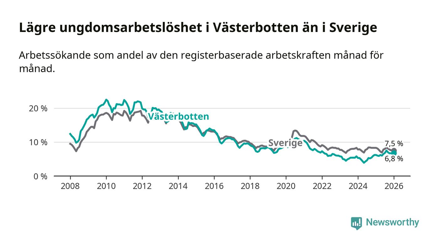 Precis som den totala arbetslösheten ligger ungdomsarbetslösheten i Västerbotten lägre än i Sverige som helhet. Skillnaden mellan länet och riket är 0,7 procentenheter.