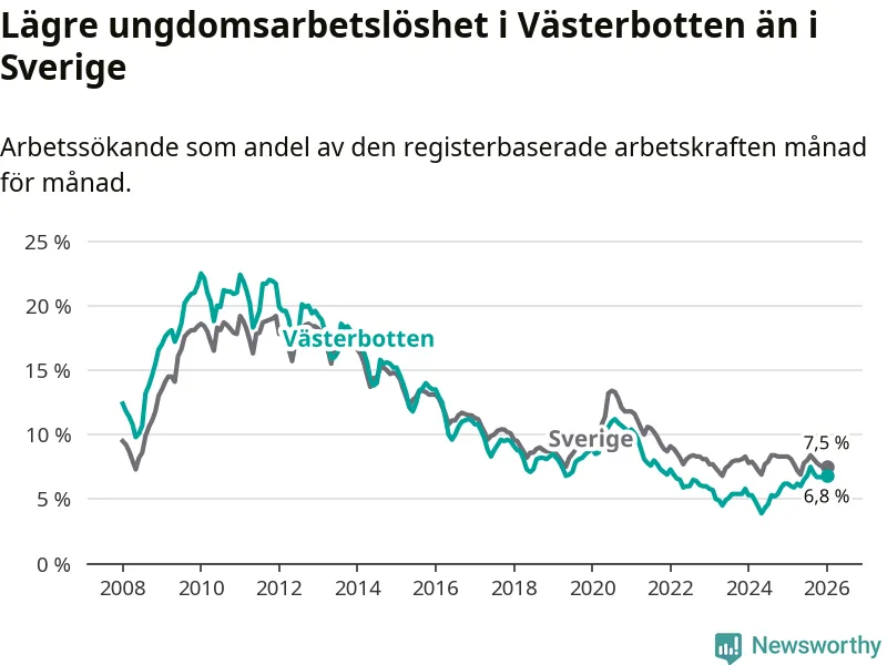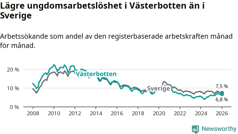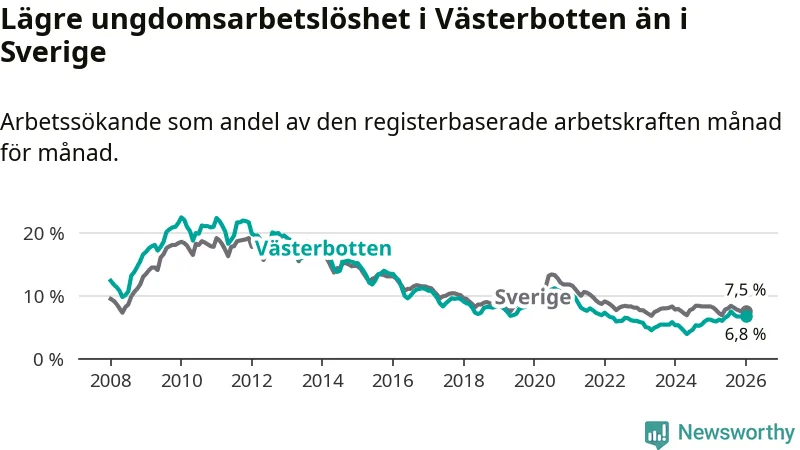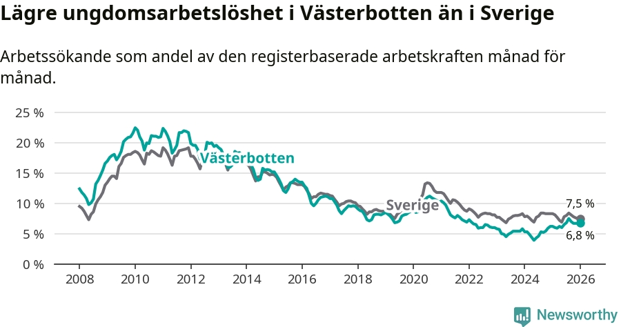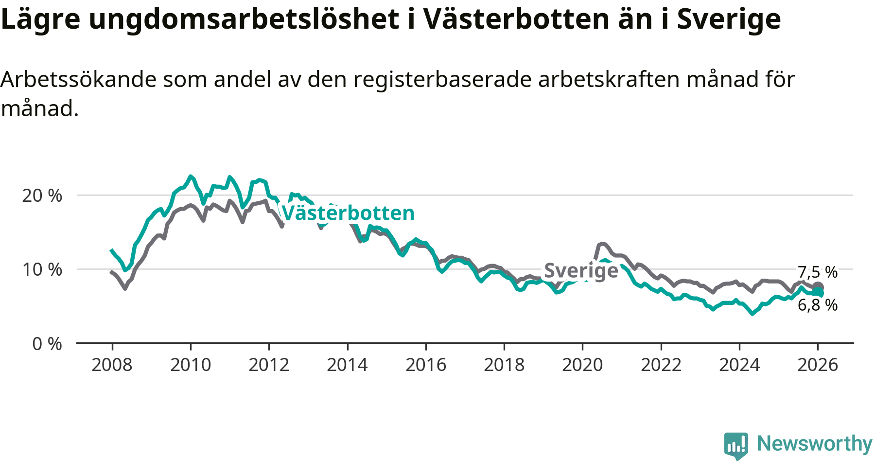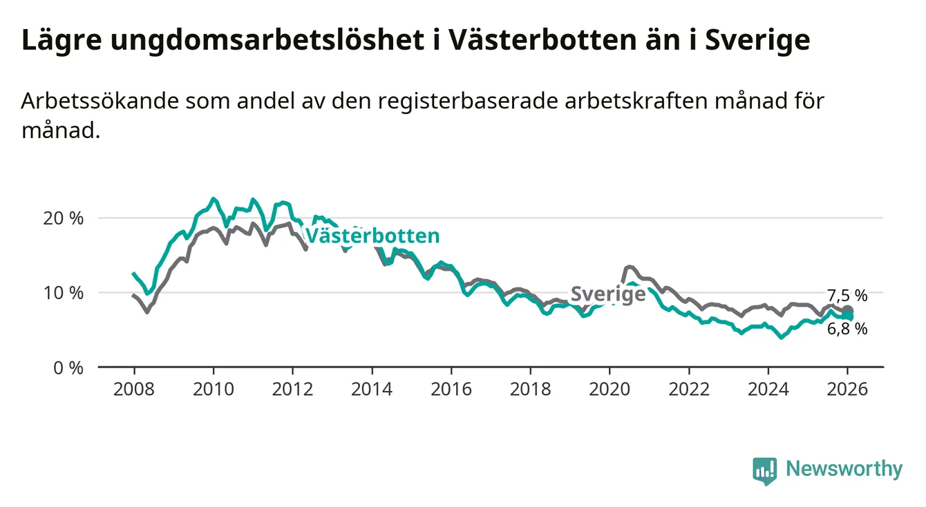Precis som den totala arbetslösheten ligger ungdomsarbetslösheten i Västerbotten lägre än i Sverige som helhet. Skillnaden mellan länet och riket är 0,7 procentenheter.