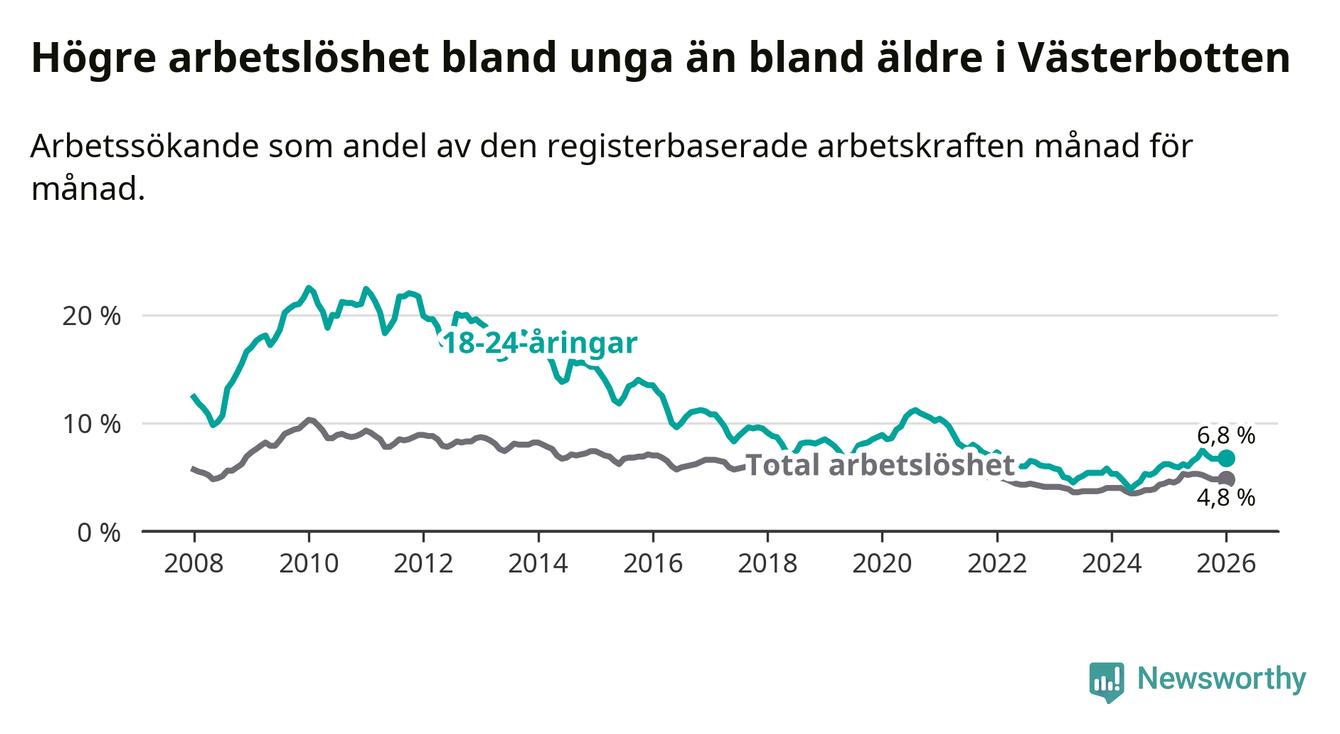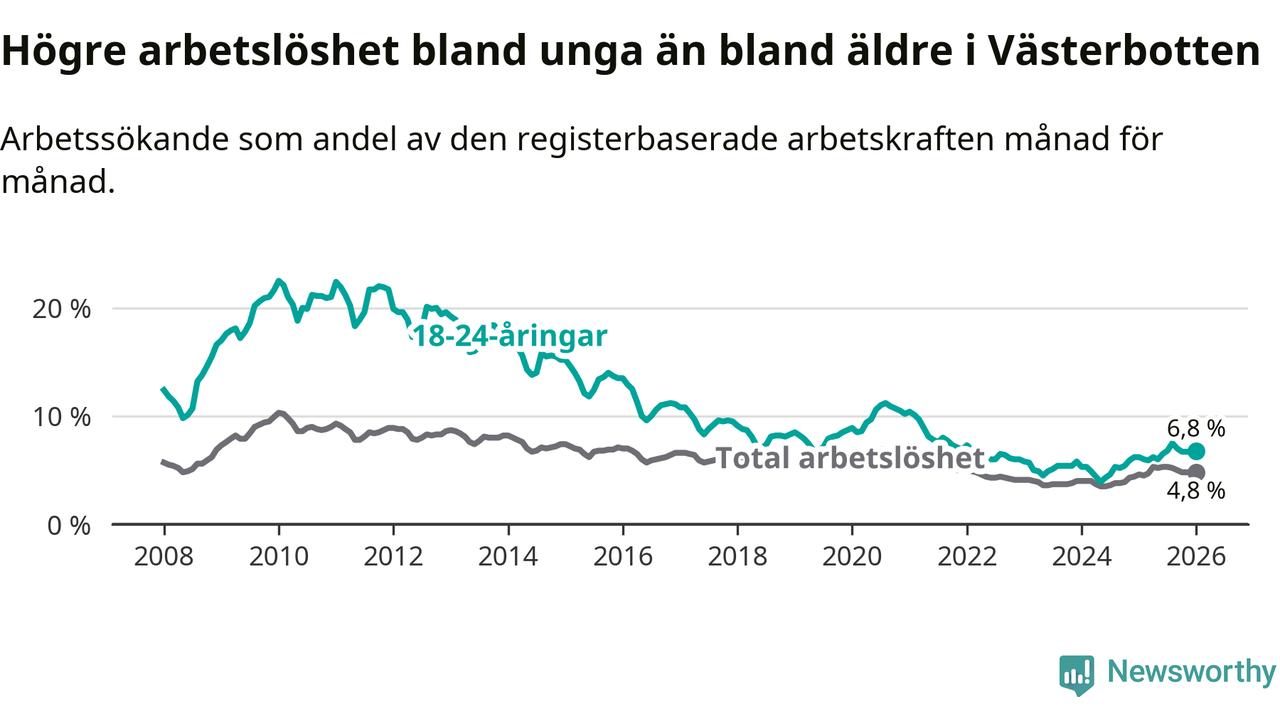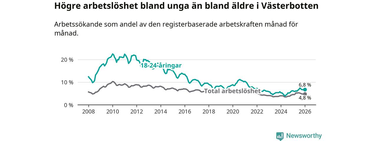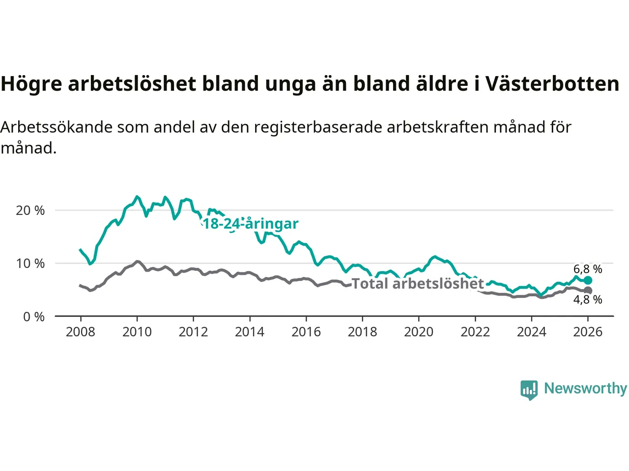 I och med den senaste månadens uppgång har de ungas arbetslöshet i Västerbotten stigit 15 månader i följd (upp från 5,4 procent i oktober 2024 till 6,8 procent nu).