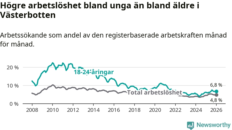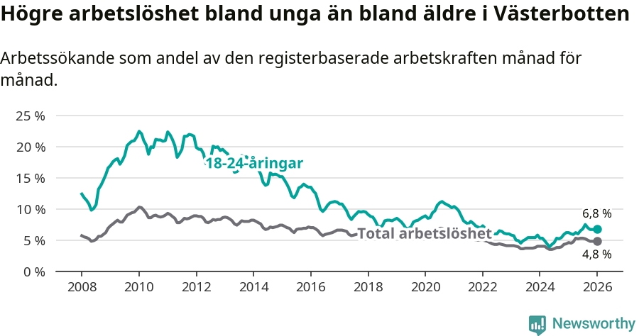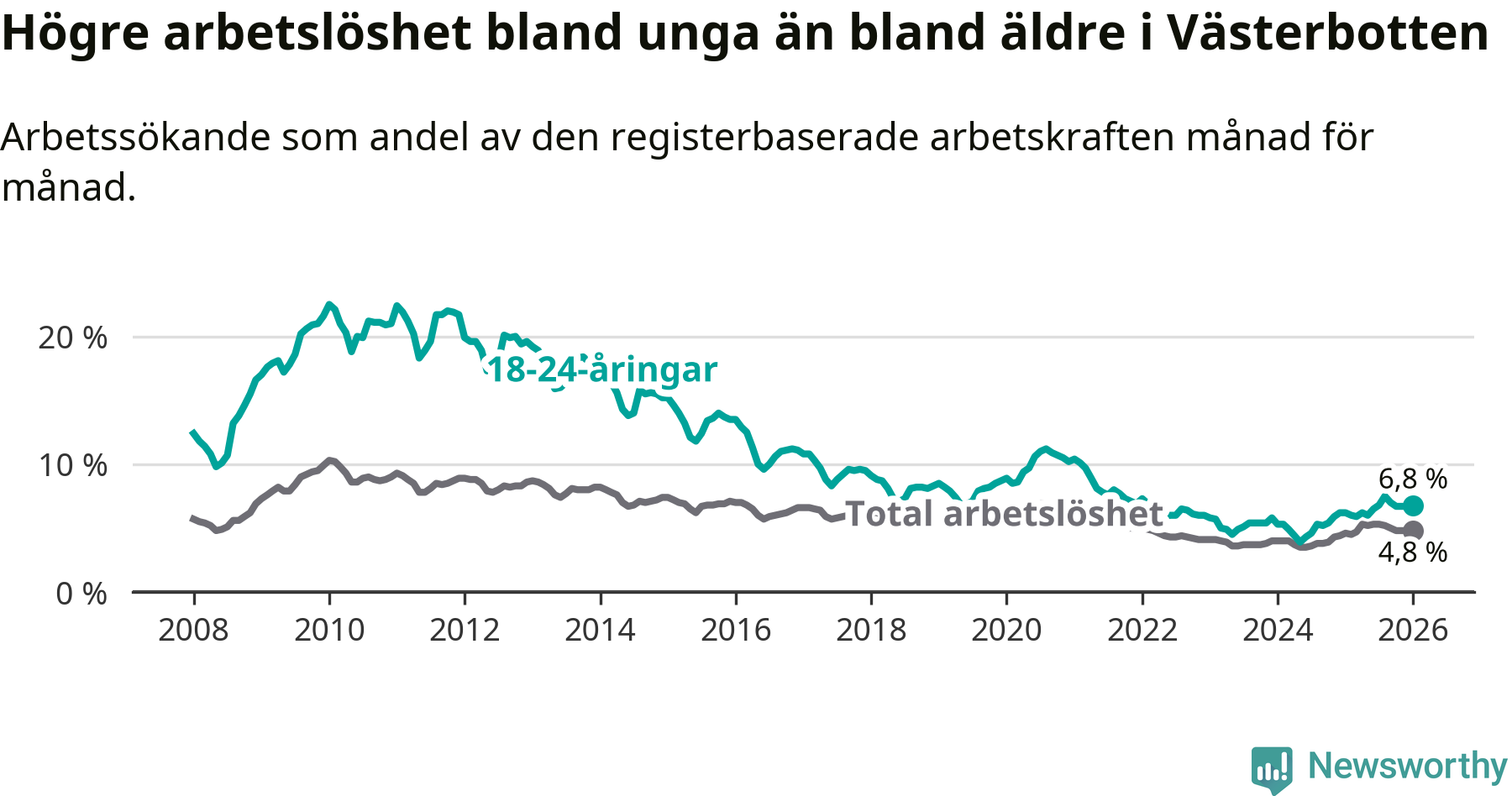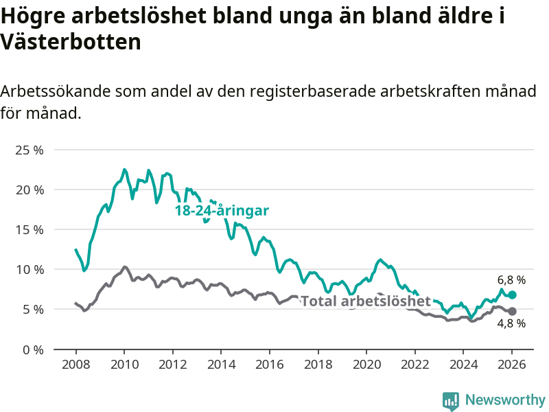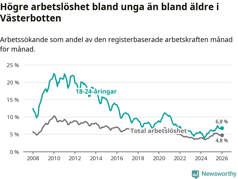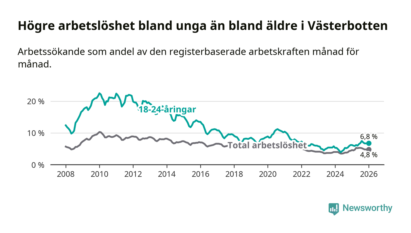 I och med den senaste månadens uppgång har de ungas arbetslöshet i Västerbotten stigit 15 månader i följd (upp från 5,4 procent i oktober 2024 till 6,8 procent nu).