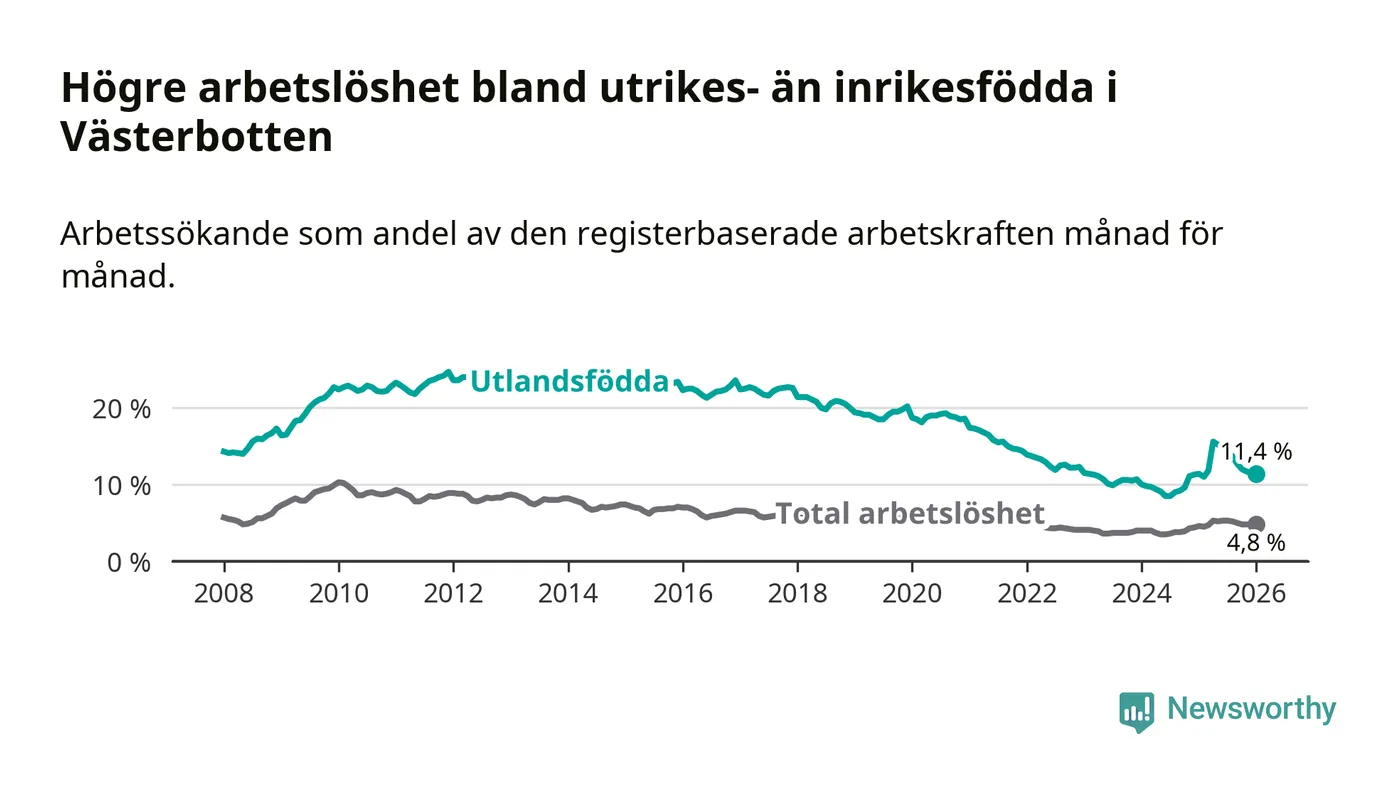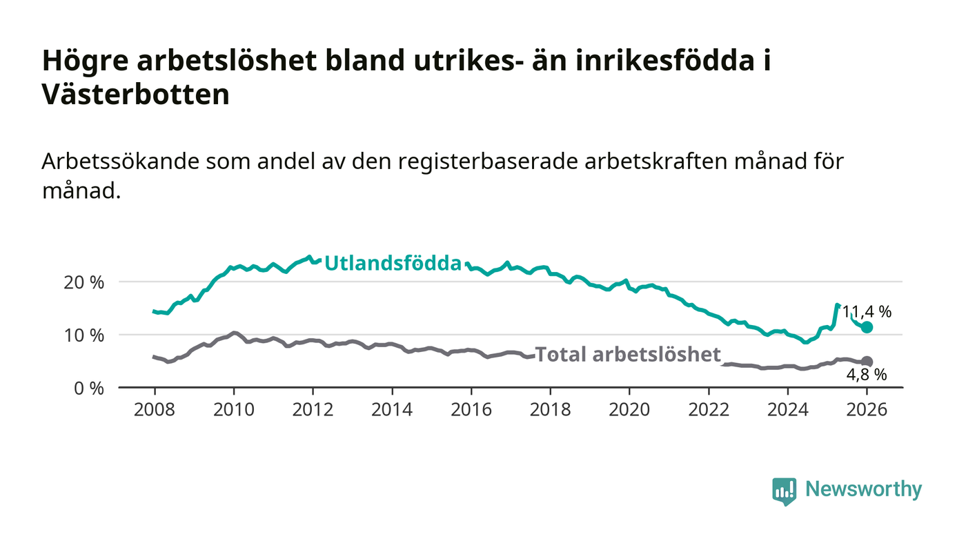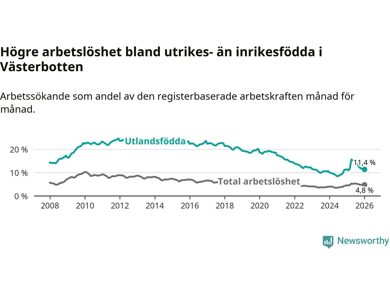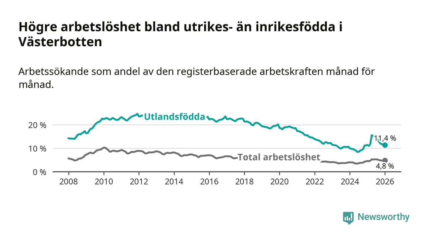 Arbetslösheten bland utlandsfödda var 11,4 procent i Västerbotten under januari månad, motsvarande 2 572 av 22 561 personer. Det är i stort sett lika stor andel som i fjol.