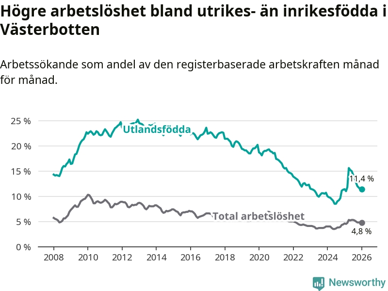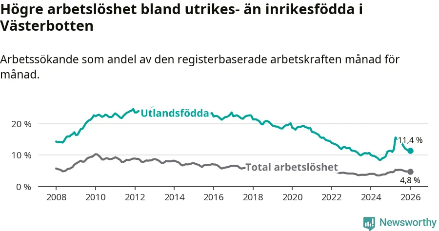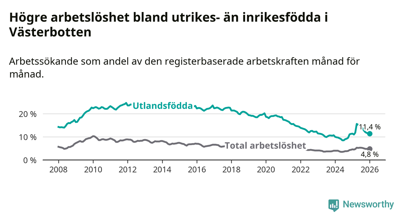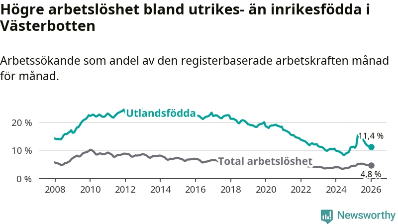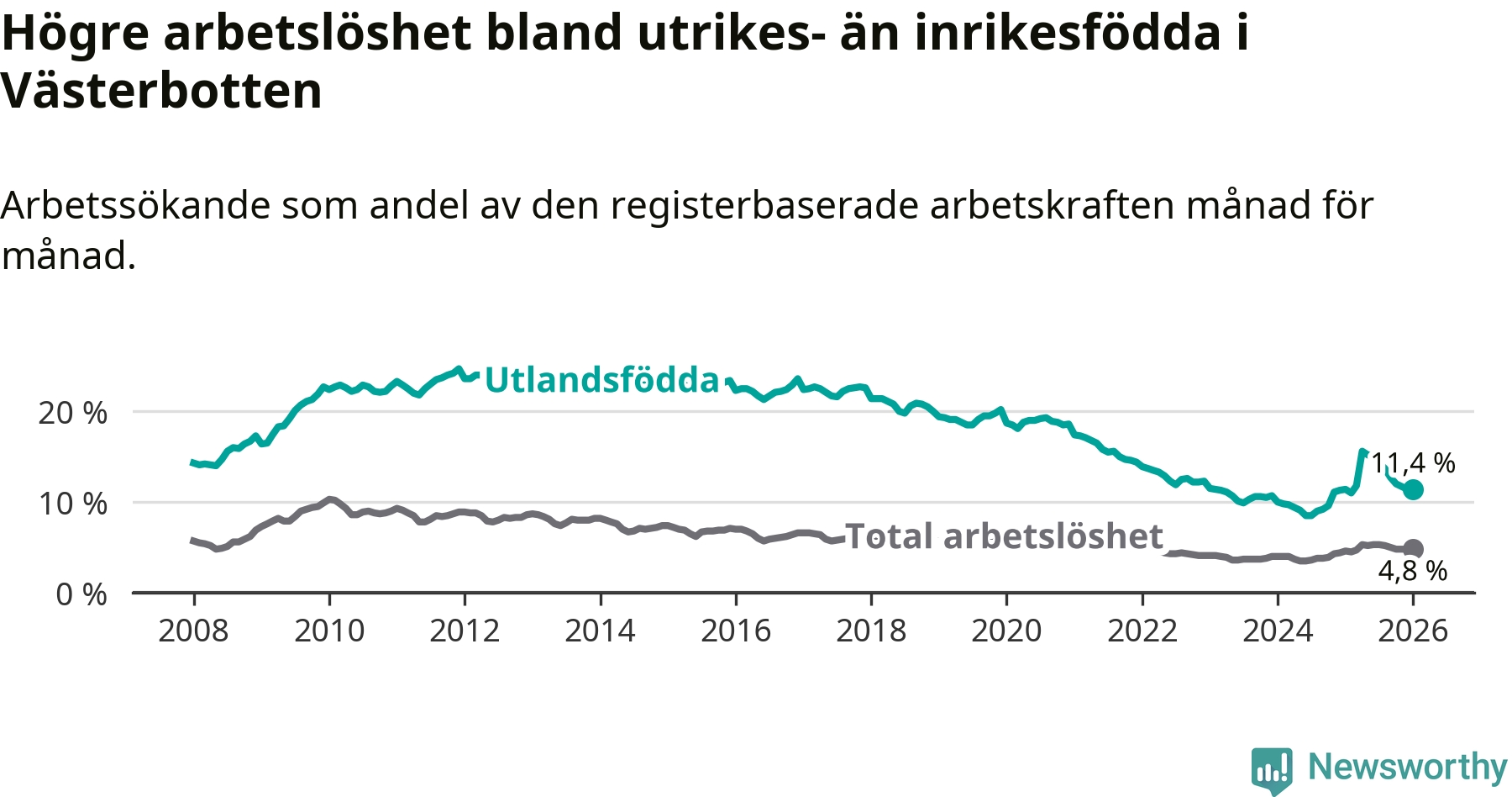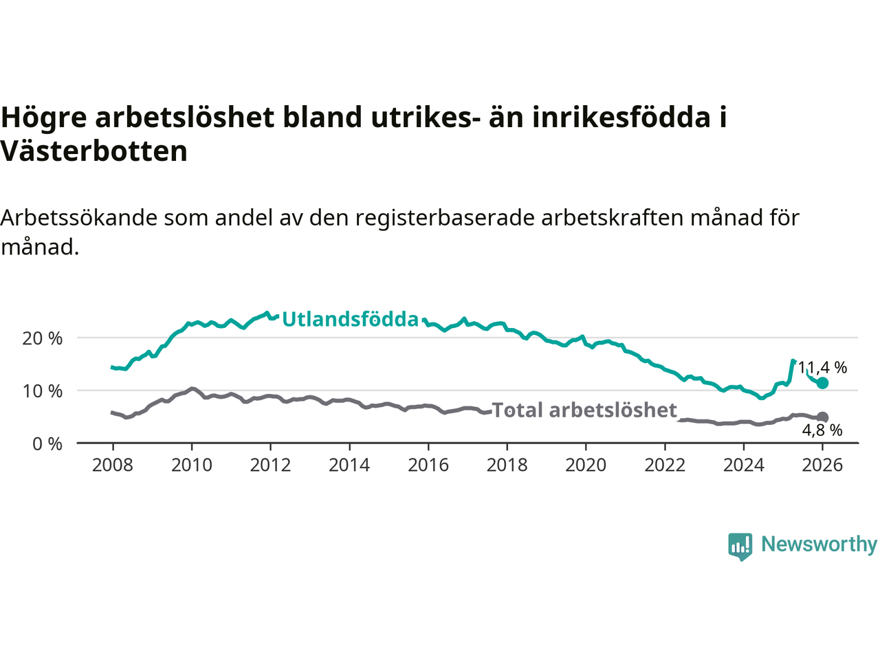 Arbetslösheten bland utlandsfödda var 11,4 procent i Västerbotten under januari månad, motsvarande 2 572 av 22 561 personer. Det är i stort sett lika stor andel som i fjol.