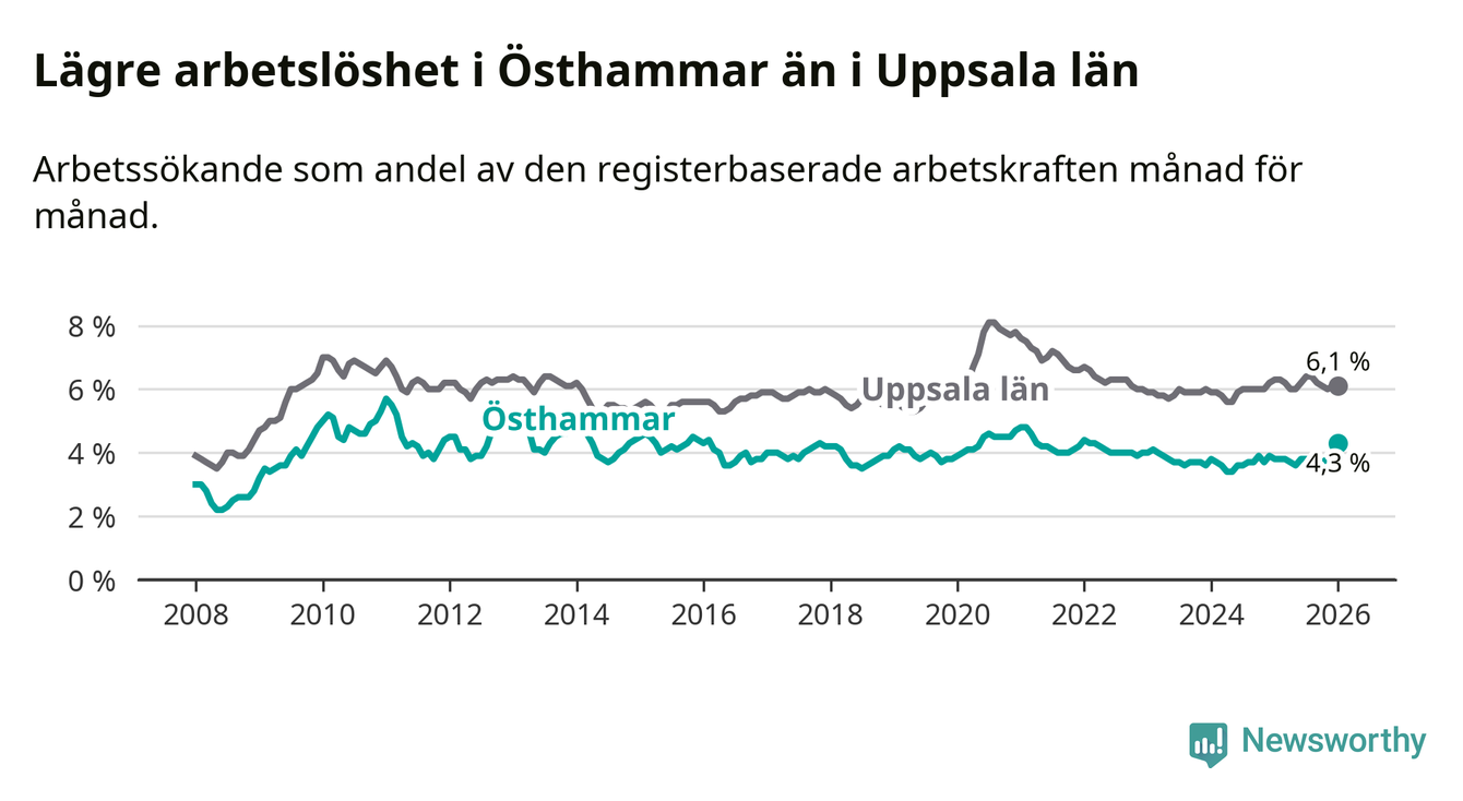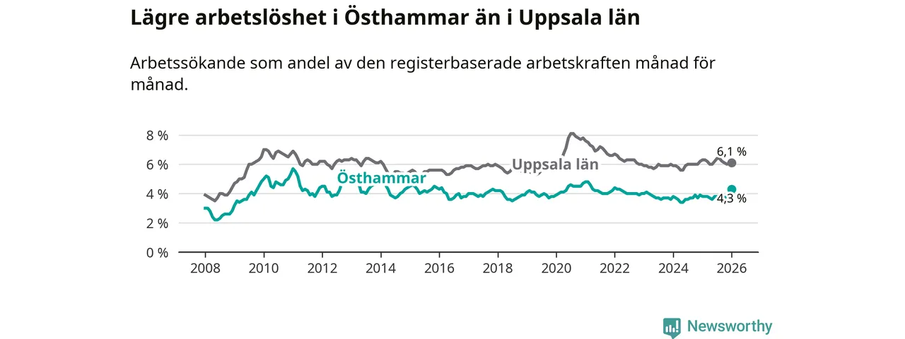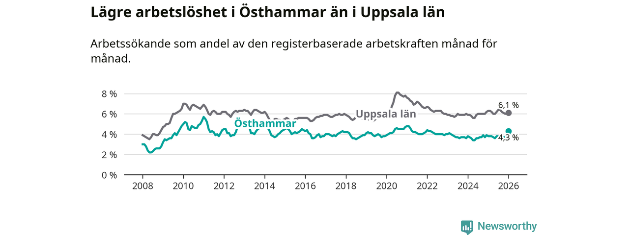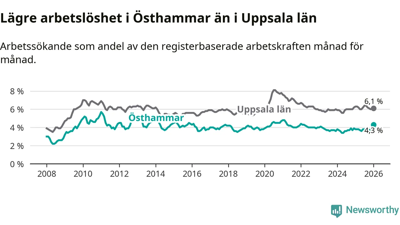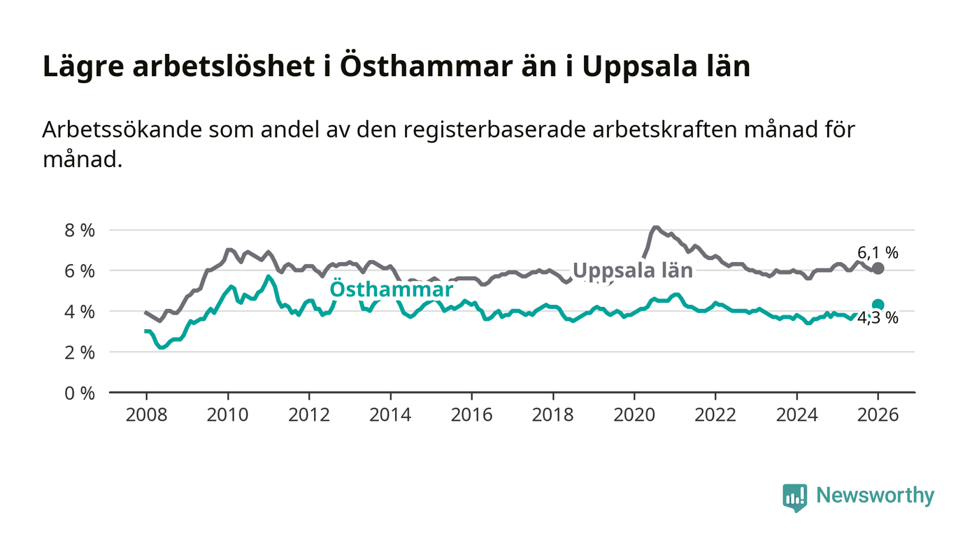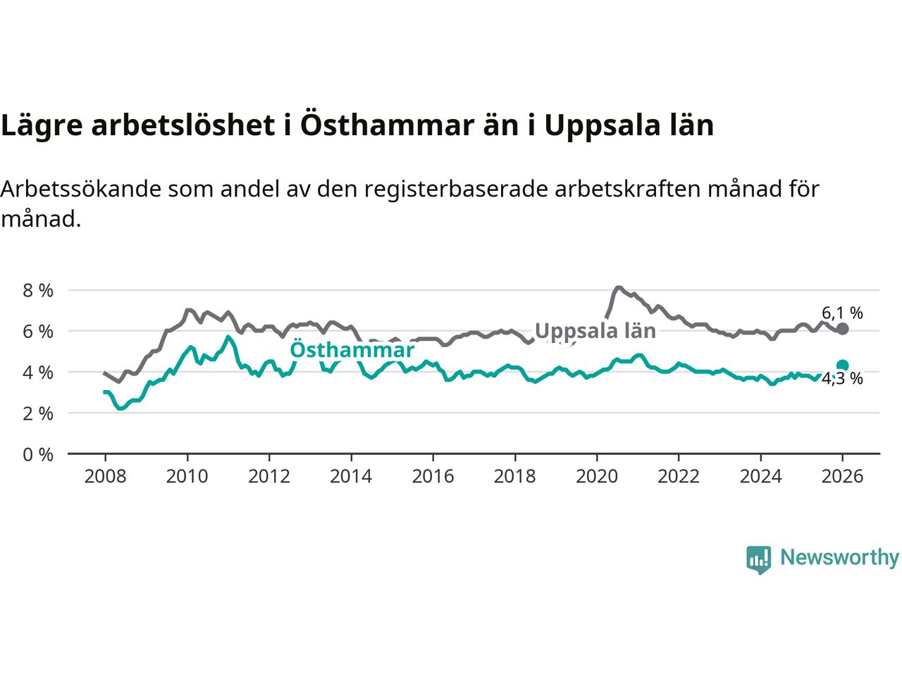 Under januari månad rapporterade Östhammars kommun en total arbetslöshet på 4,3 procent. Det är en ökning jämfört med samma tidpunkt i fjol (+0,5 procentenheter). I Uppsala län däremot sjunker arbetslösheten .