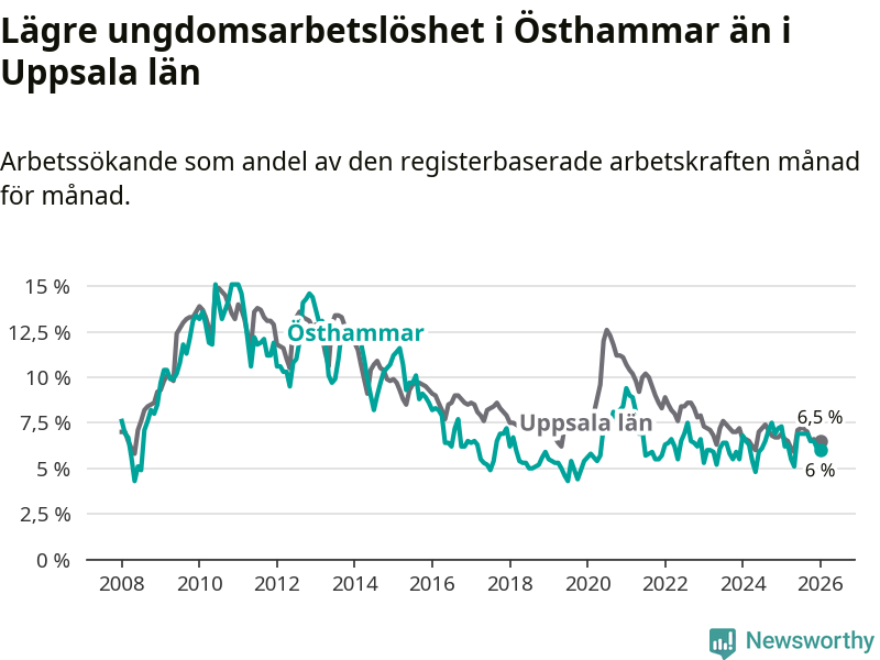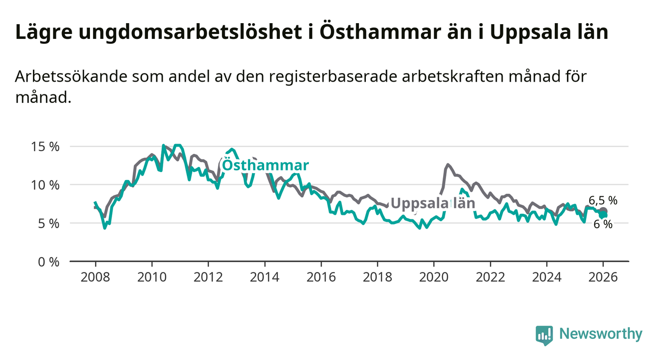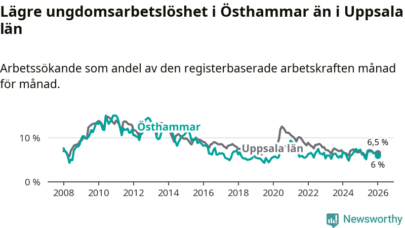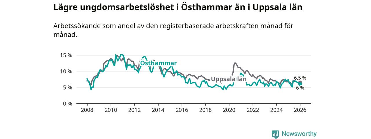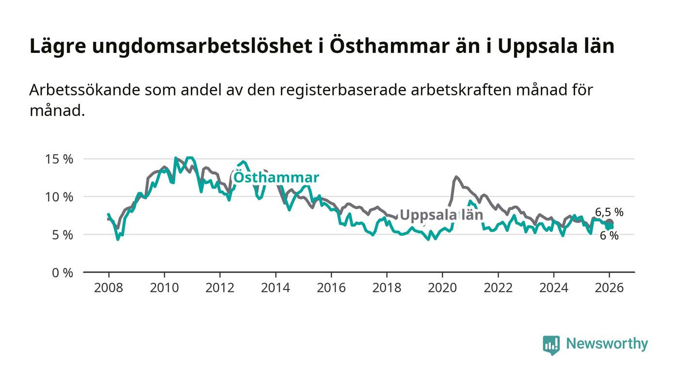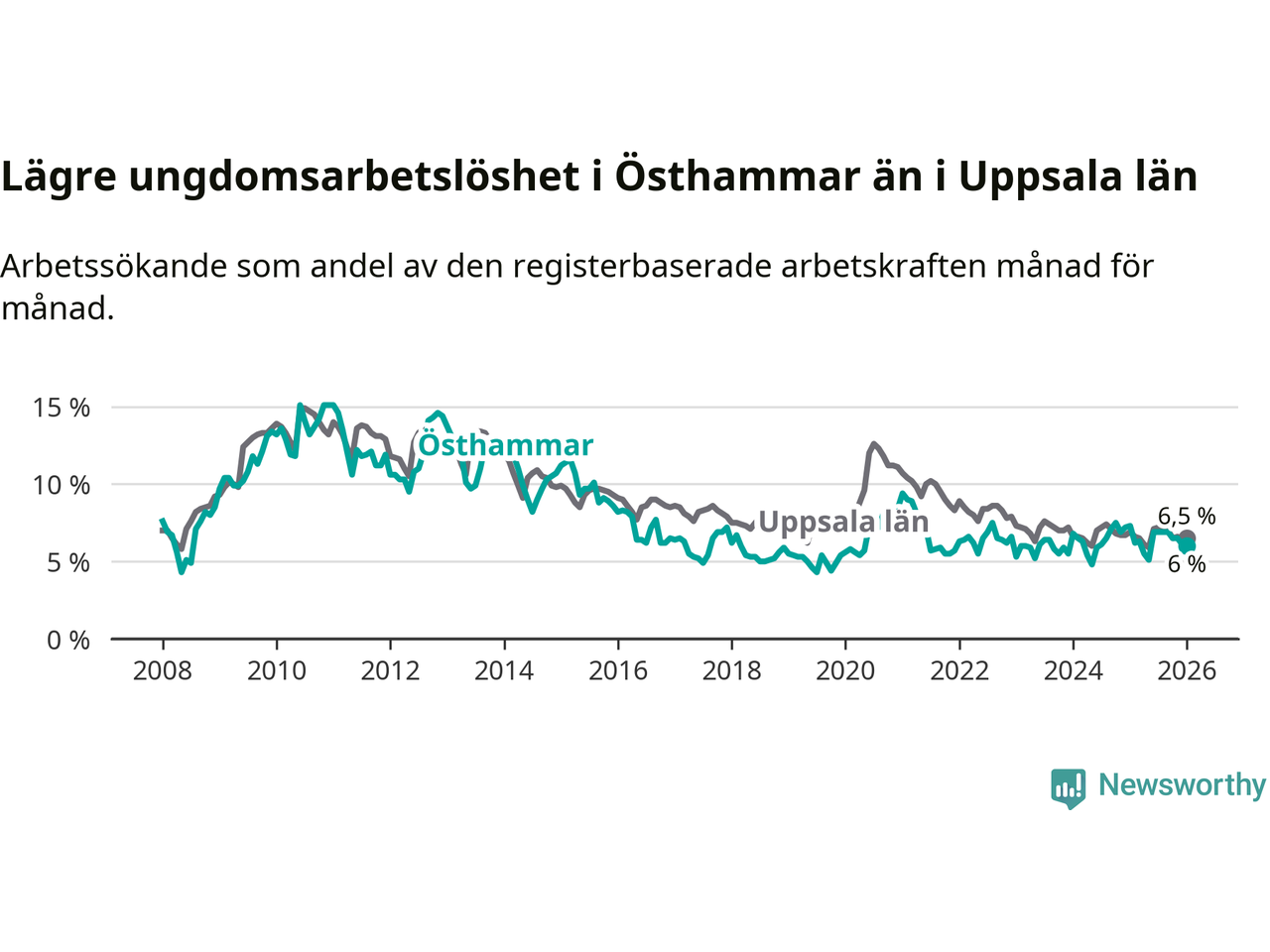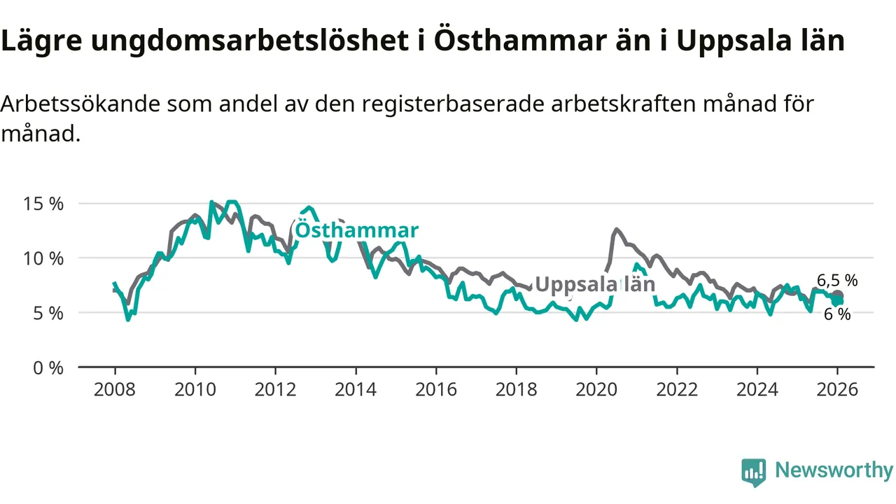 Precis som den totala arbetslösheten ligger ungdomsarbetslösheten i Östhammar lägre än i Uppsala som helhet. Skillnaden mellan kommunen och länet är 0,5 procentenheter.