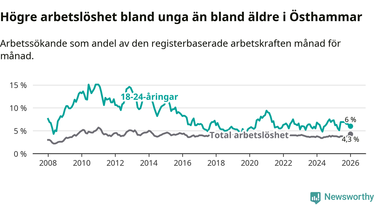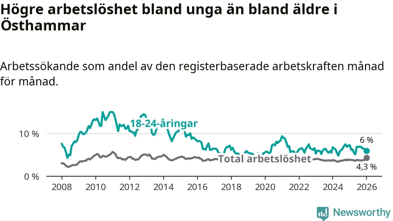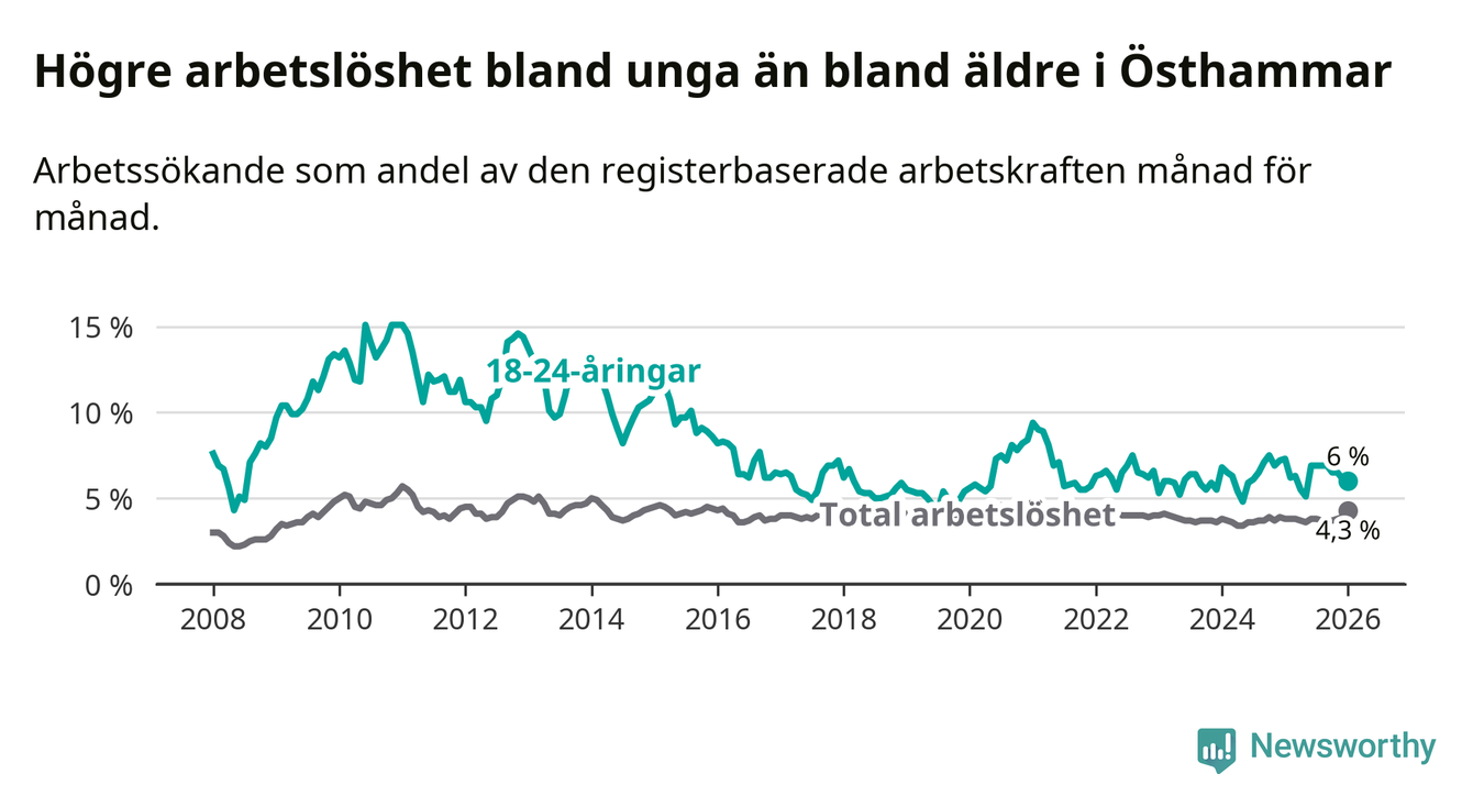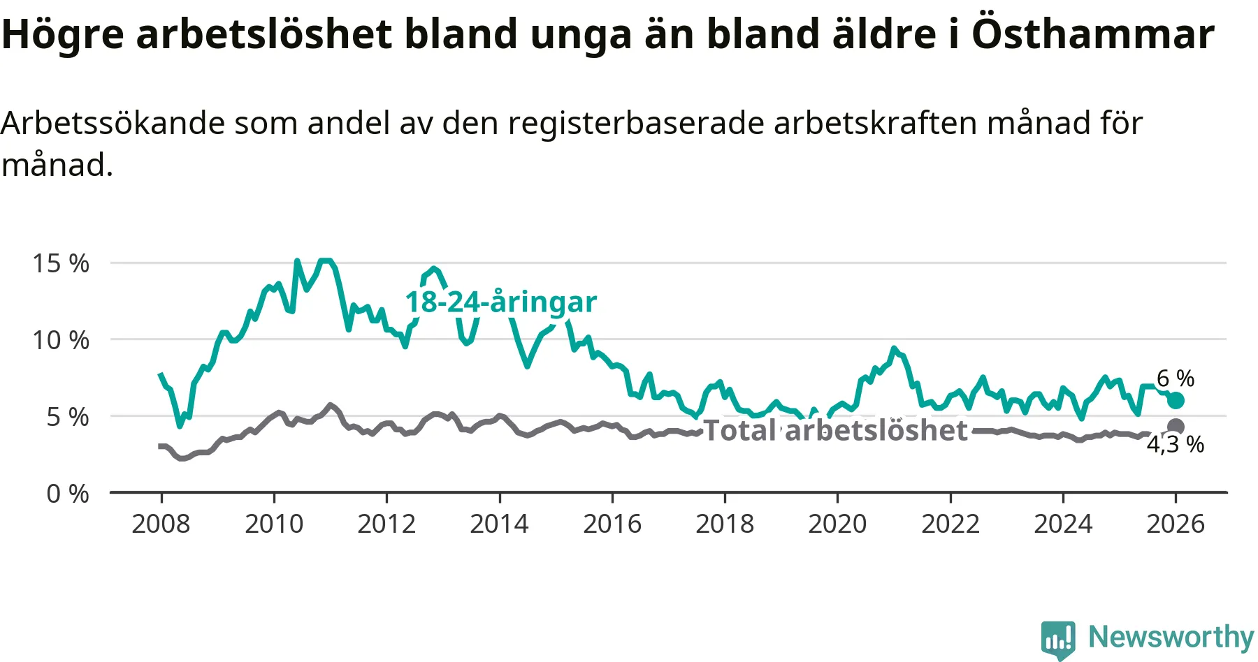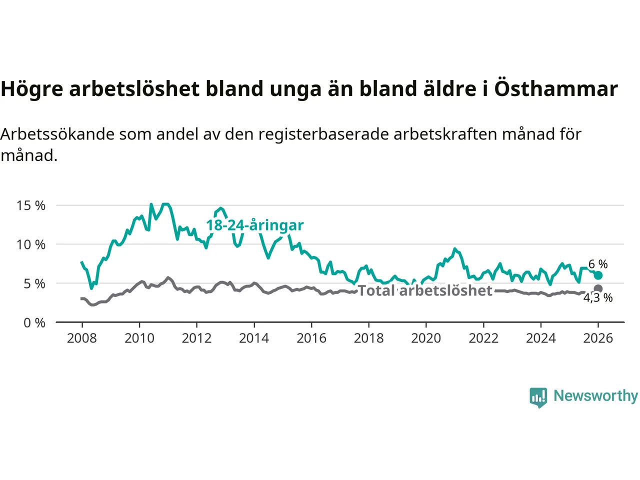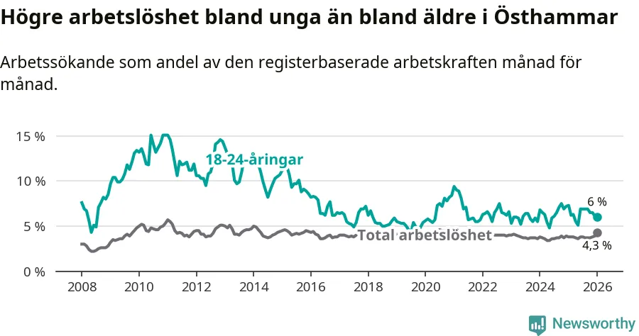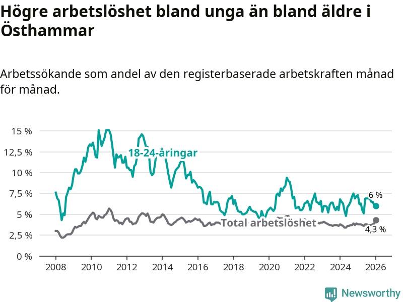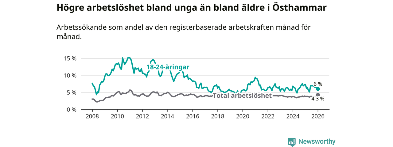 Till skillnad från den totala arbetslösheten sjunker arbetslösheten bland unga (−1,3 procentenheter). I januari var 6,0 procent av 18–24-åringarna inskrivna som arbetssökande (motsvarande 60 personer). Mäter vi antalet inskrivna ser vi en minskning med tio personer på ett års sikt.
