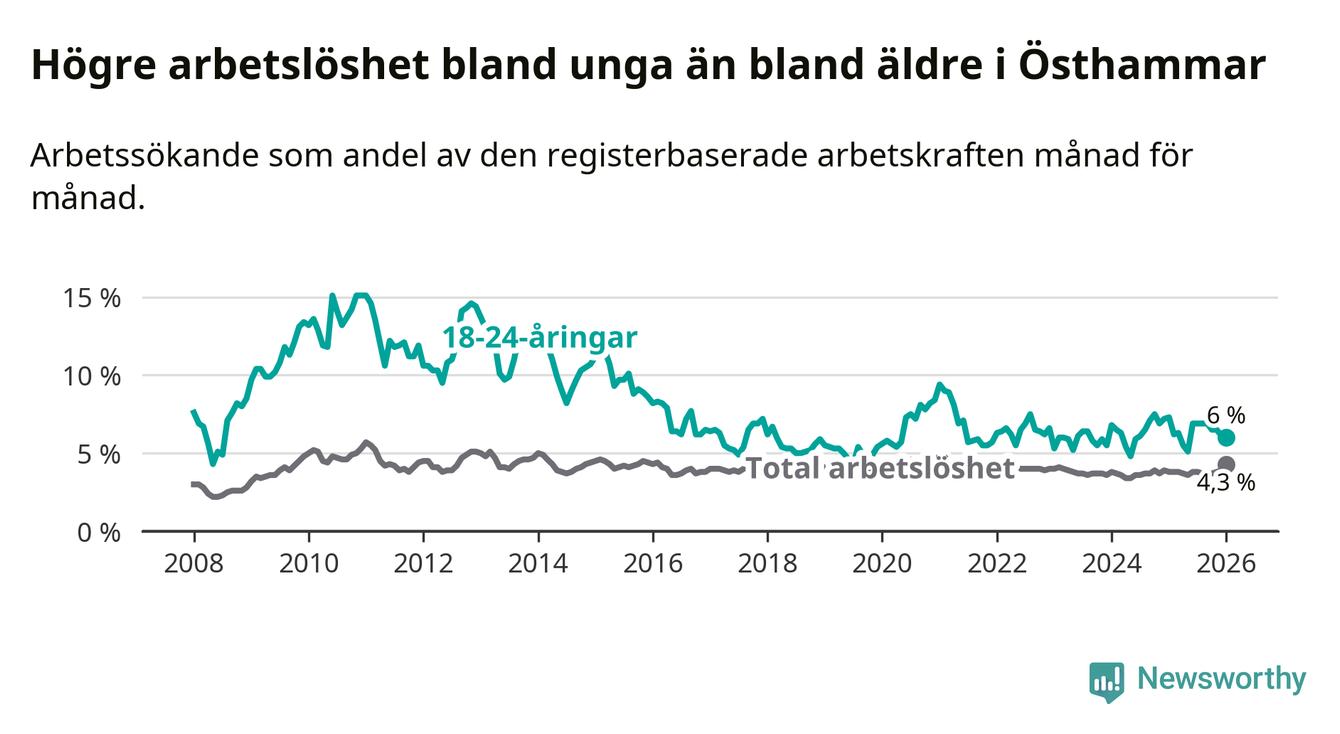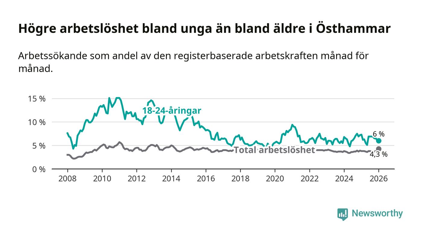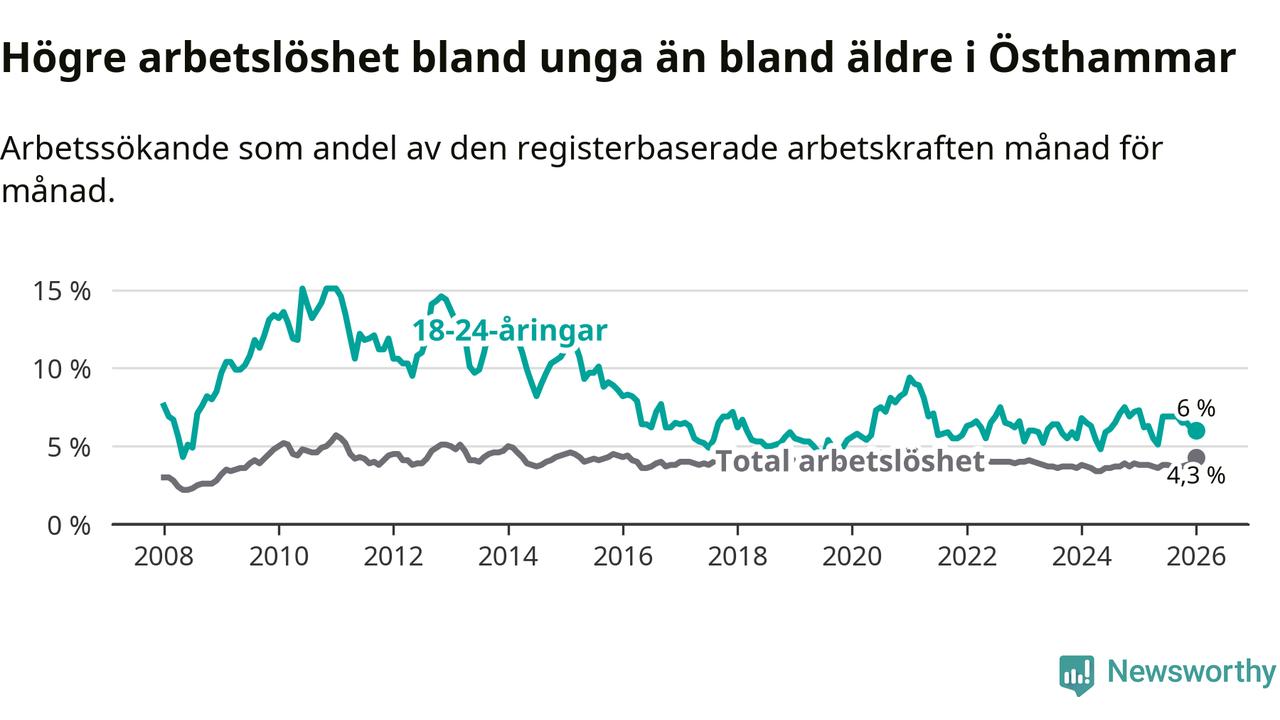 Sett till antalet personer betyder det att 444 av 10 326 invånare i åldern 16 till 661 år i Östhammars kommun var inskrivna som arbetssökande (53 fler än i januari i fjol).