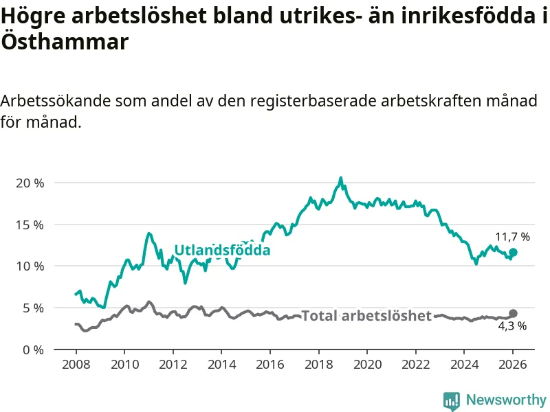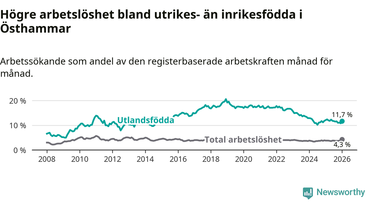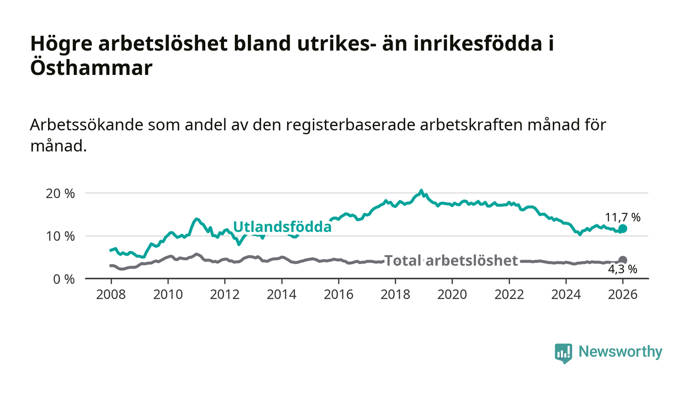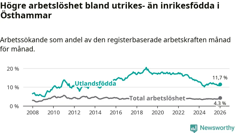 Skillnaden i arbetslöshet mellan utrikesfödda och hela befolkningen är 7,4 procentenheter i Östhammar. Det är en mindre skillnad än för ett år sedan (−0,9 procentenheter).