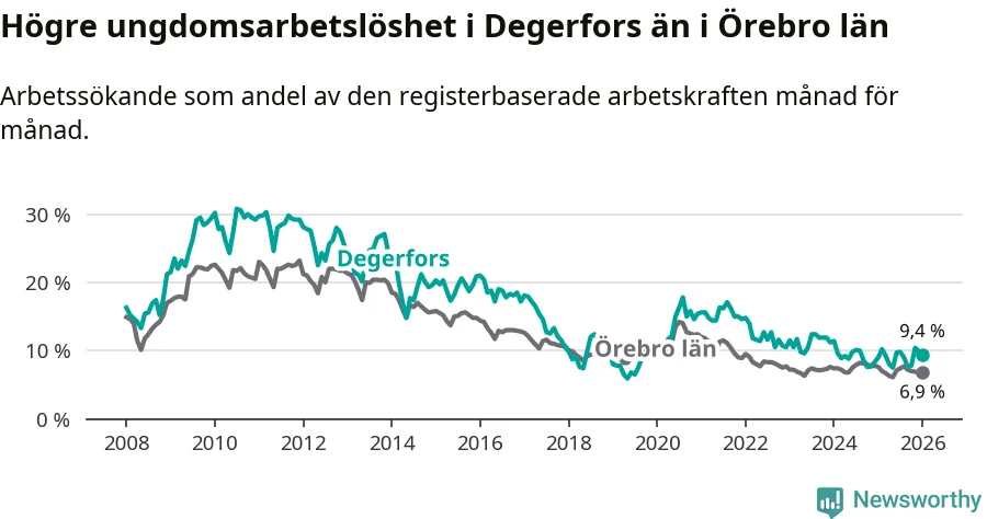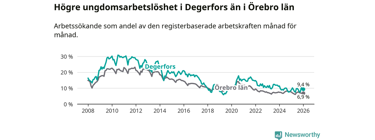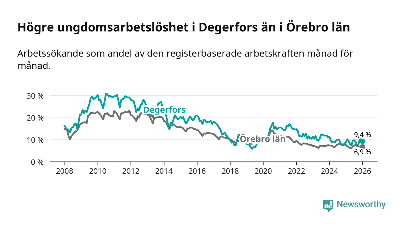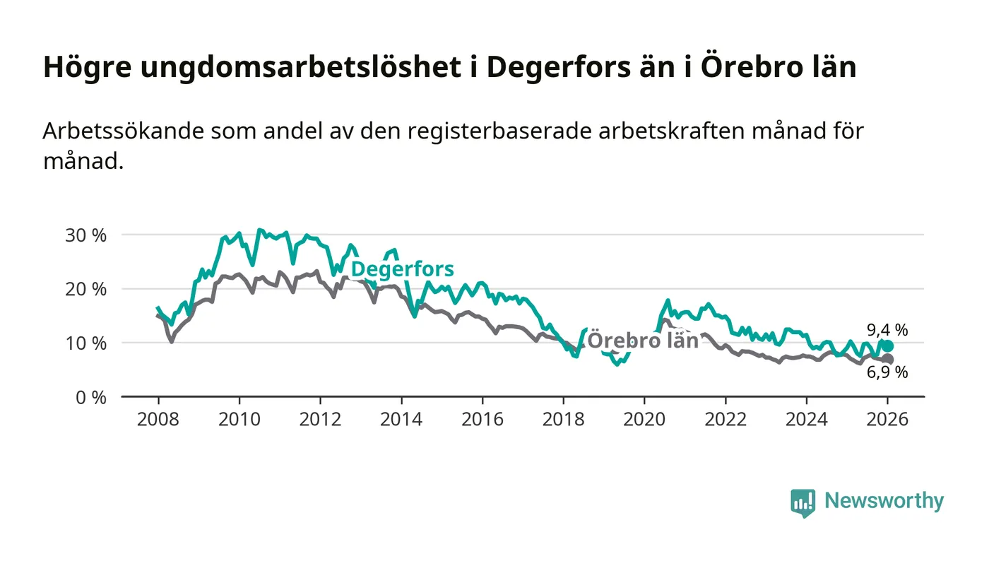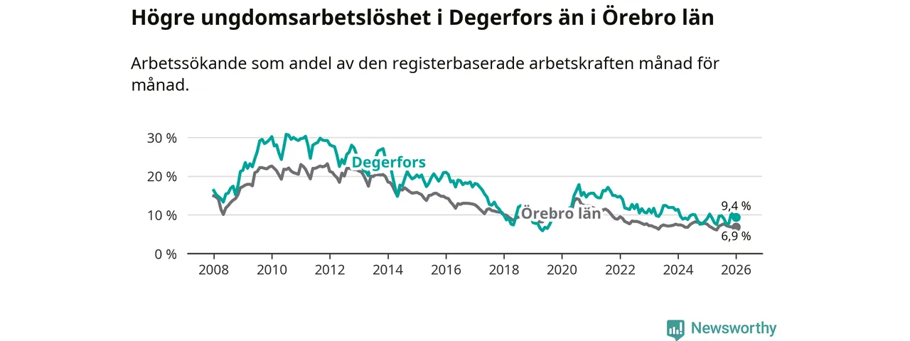 Precis som den totala arbetslösheten ligger ungdomsarbetslösheten i Degerfors högre än i Örebro som helhet. Skillnaden mellan kommunen och länet är 2,5 procentenheter.