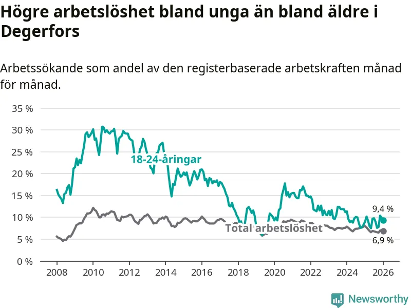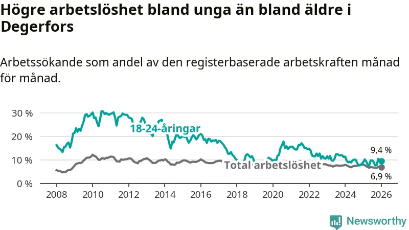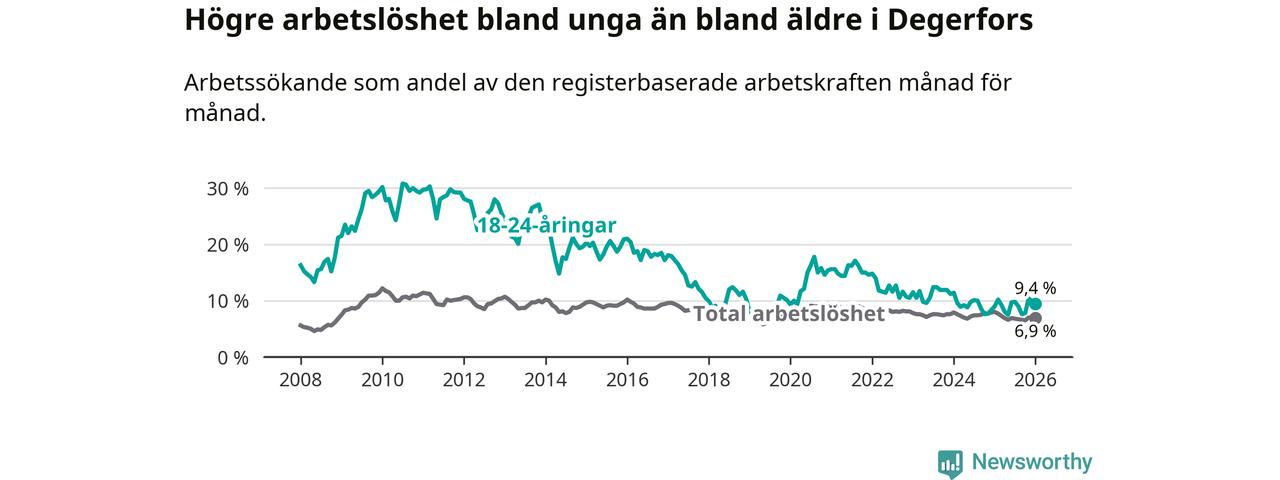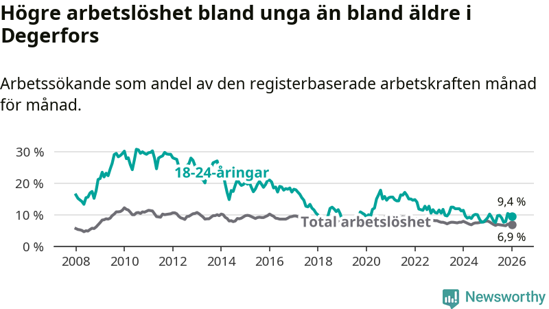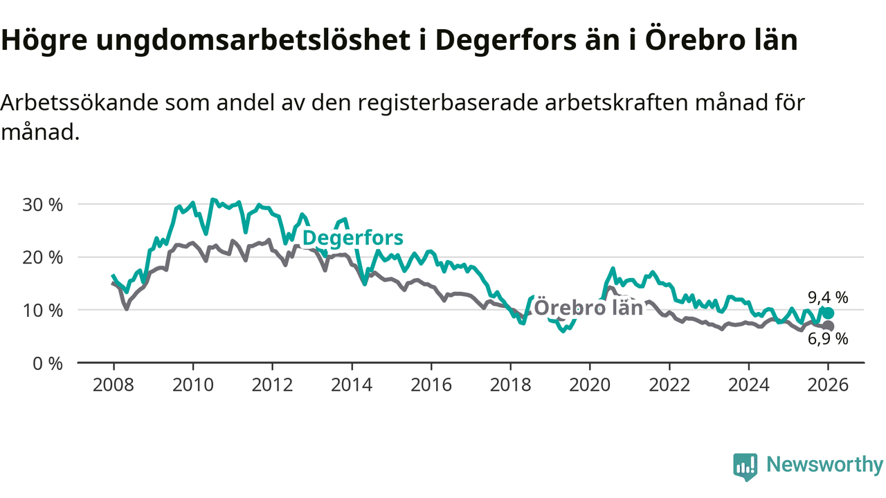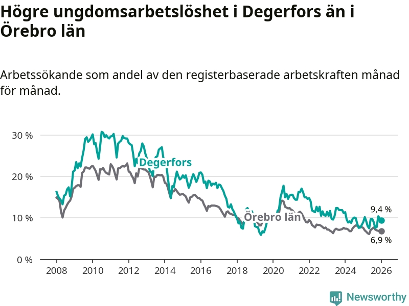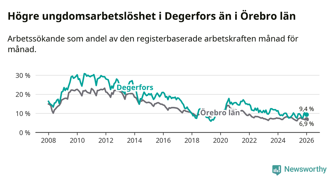 Precis som den totala arbetslösheten ligger ungdomsarbetslösheten i Degerfors högre än i Örebro som helhet. Skillnaden mellan kommunen och länet är 2,5 procentenheter.