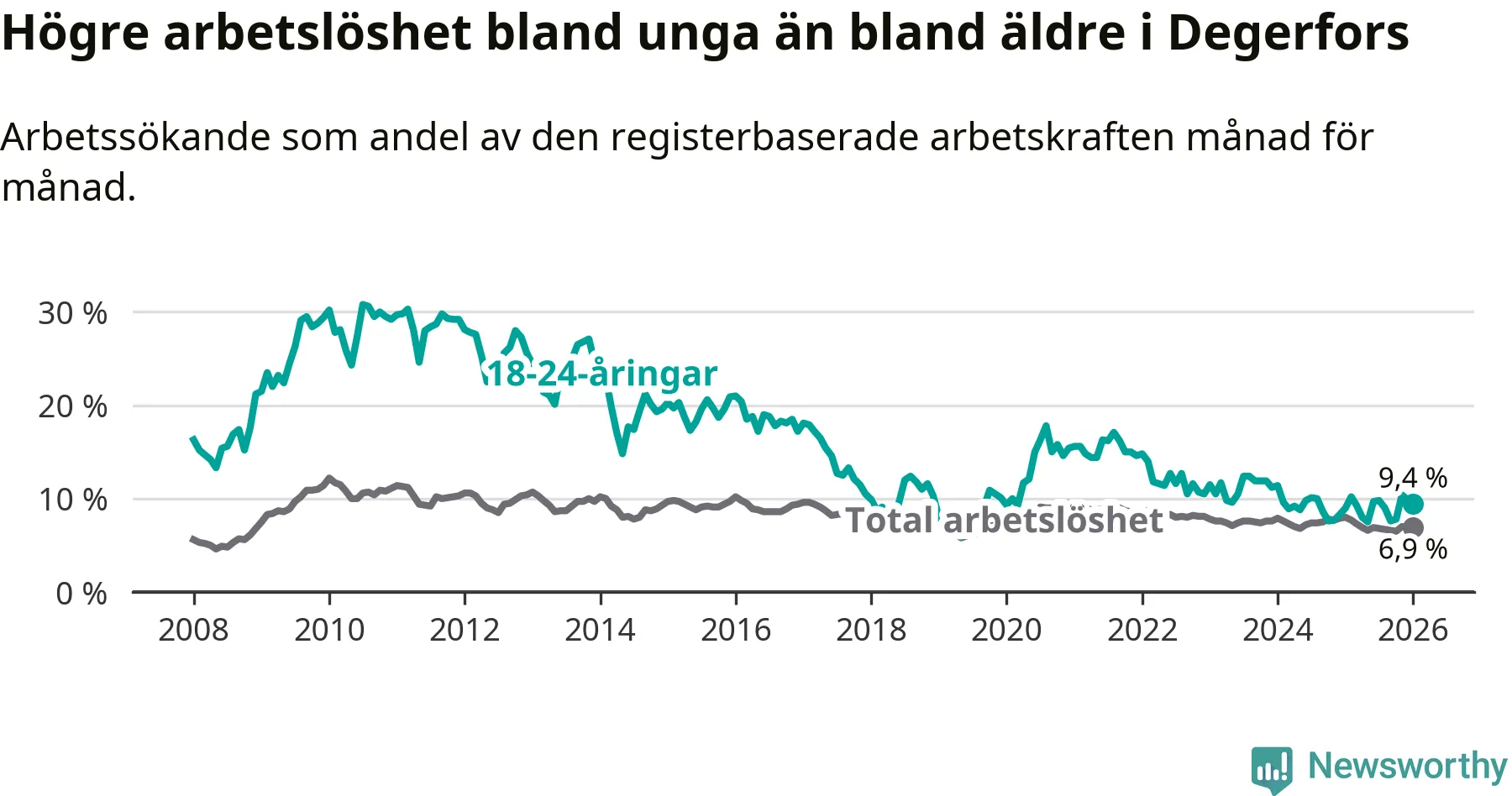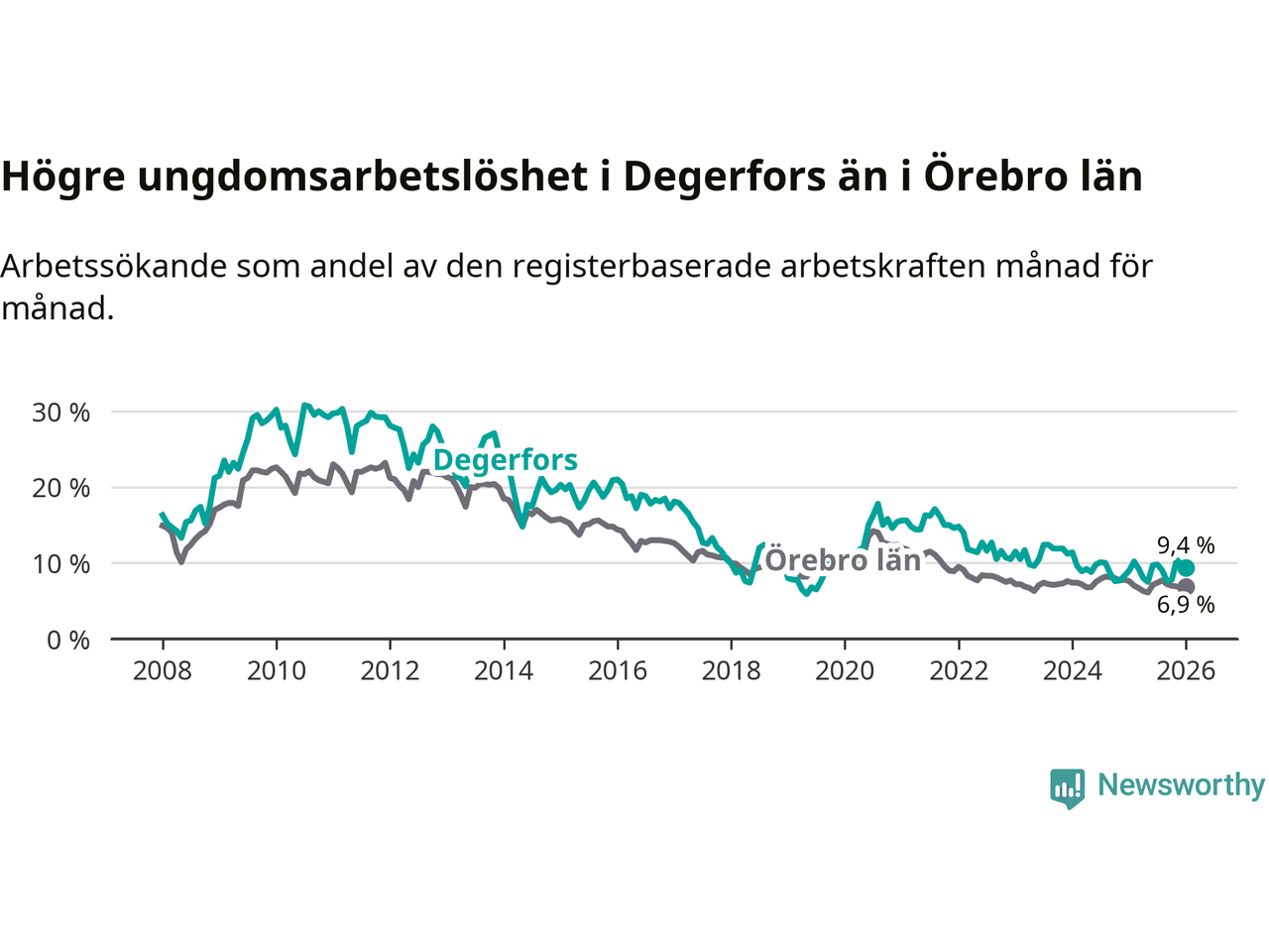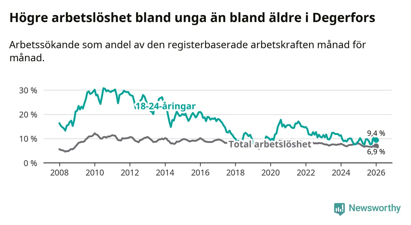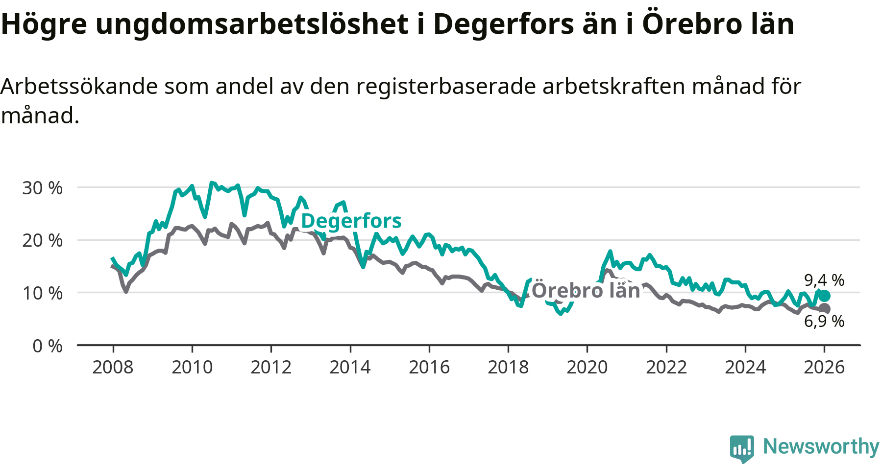 Precis som den totala arbetslösheten ligger ungdomsarbetslösheten i Degerfors högre än i Örebro som helhet. Skillnaden mellan kommunen och länet är 2,5 procentenheter.