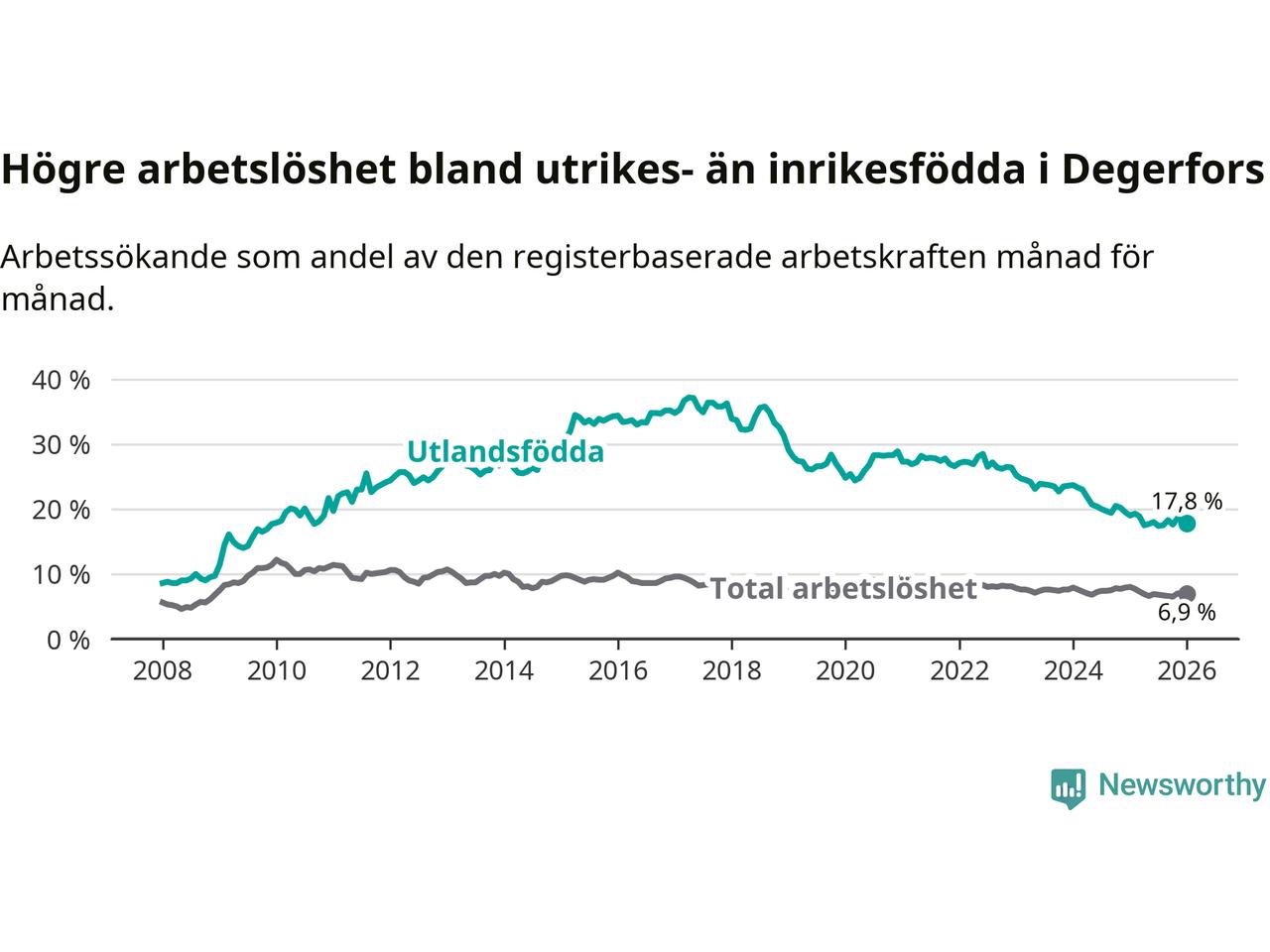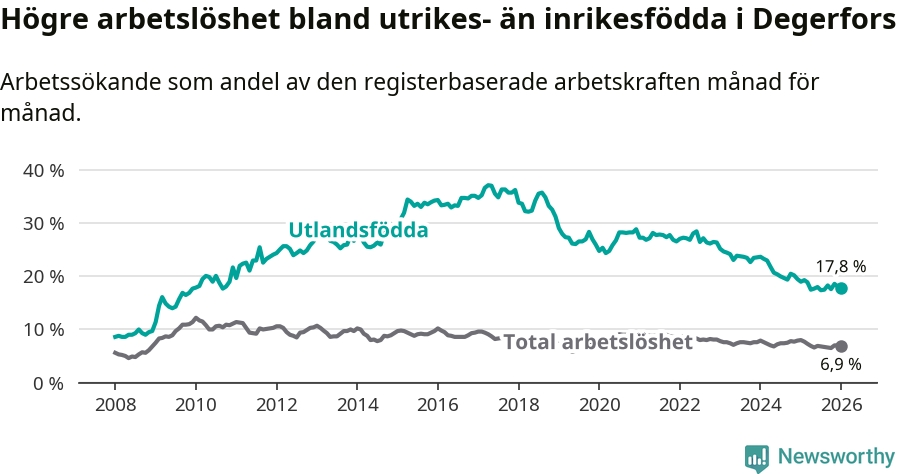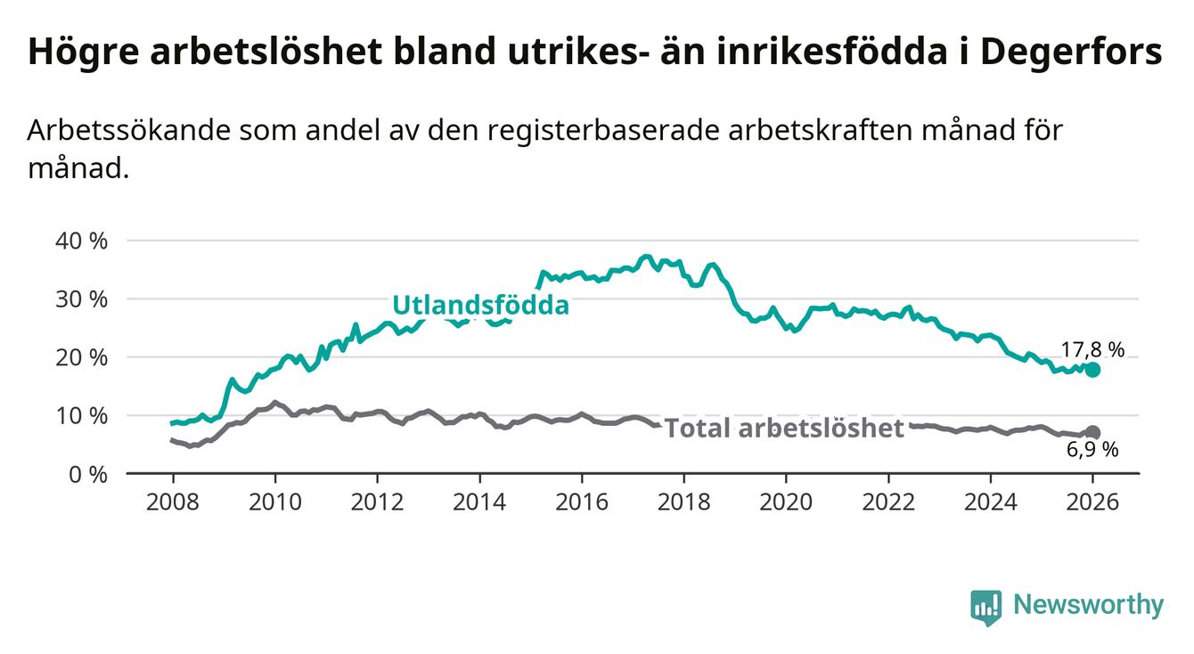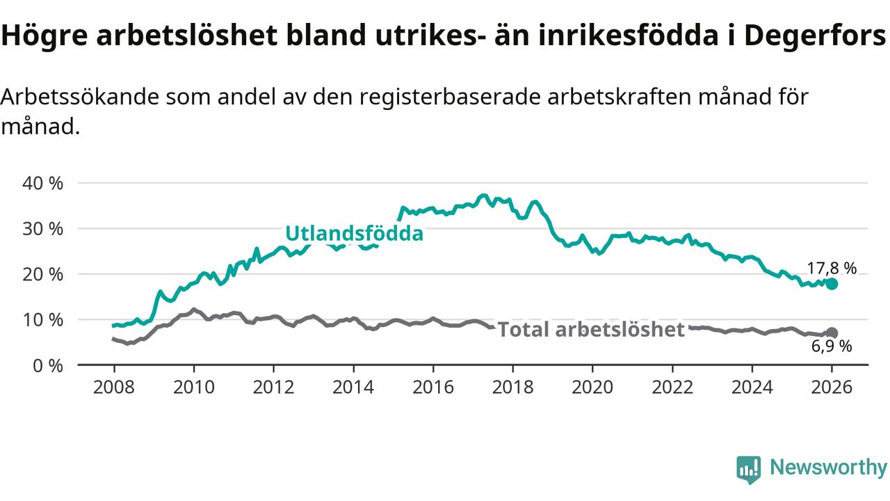Arbetslösheten bland utlandsfödda var 17,8 procent i Degerfors under januari månad, motsvarande 122 av 685 personer. Det är 1,2 procentenheter färre än vid samma tidpunkt i fjol (−6 om man räknar personer). Därmed har de utlandsföddas arbetslöshet varit lägre än vid samma tidpunkt i fjol i över tre år i sträck. Sedan juni 2022 har arbetslösheten bland utlandsfödda minskat från 28,5 till 17,8 procent.
