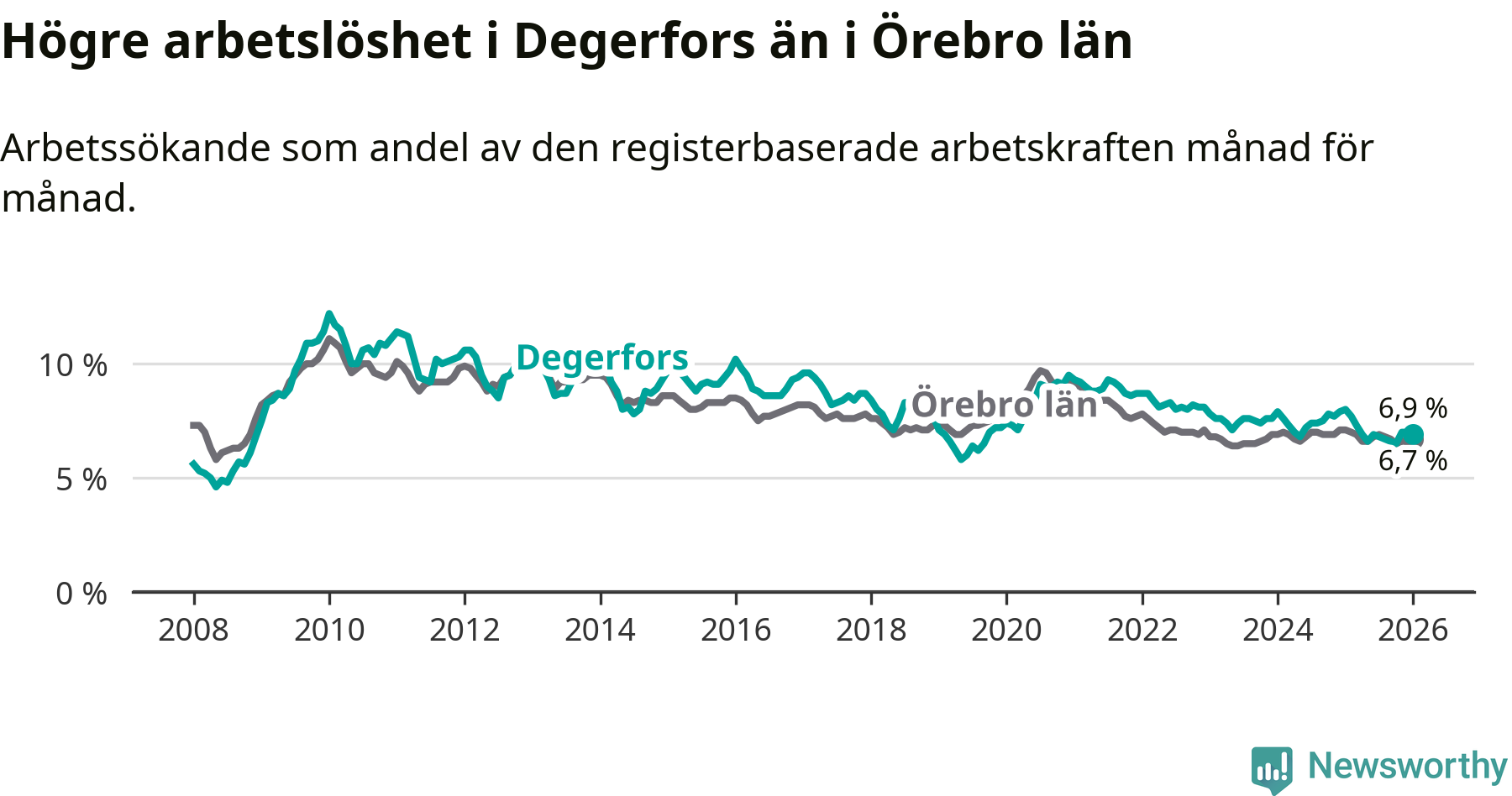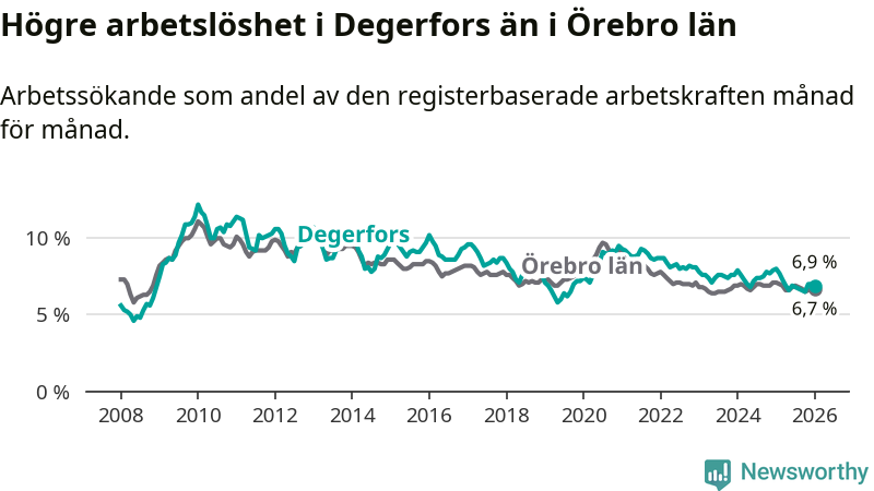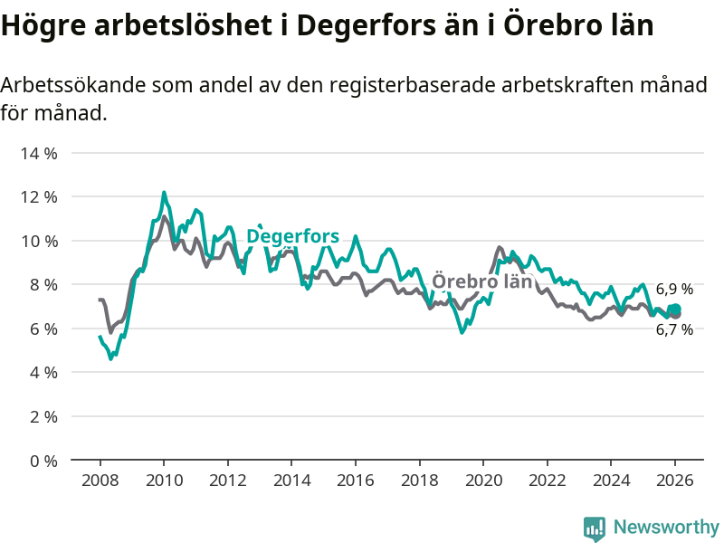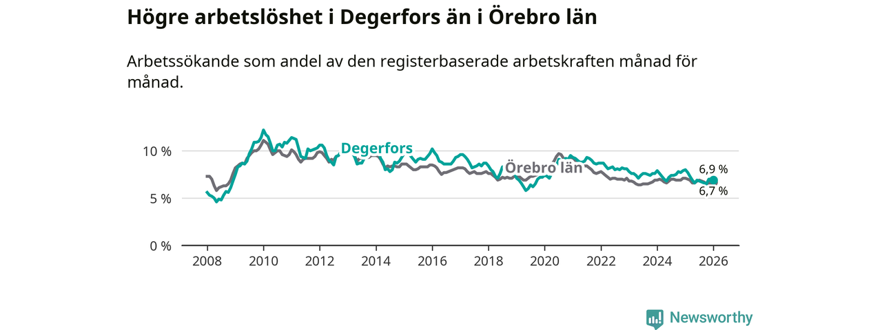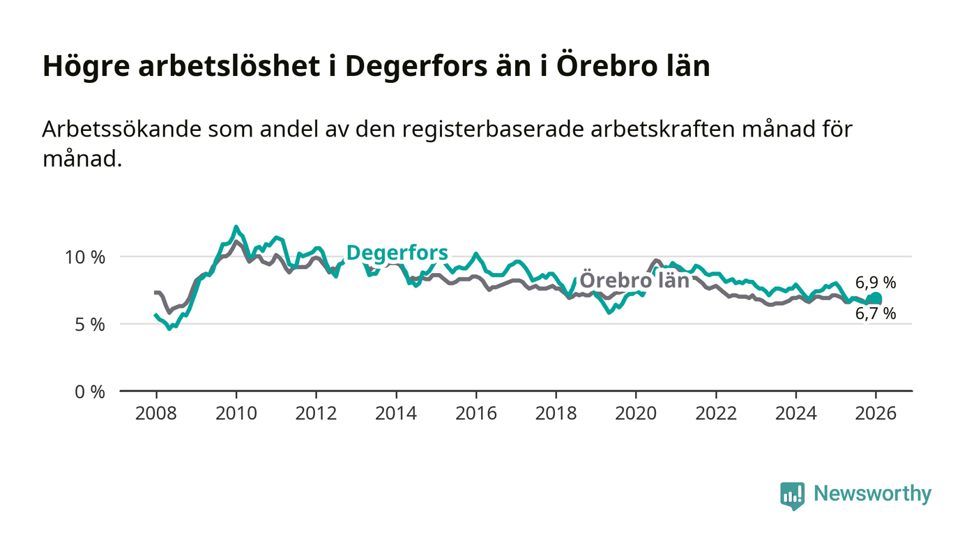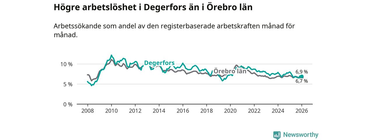 Under januari månad rapporterade Degerfors kommun en total arbetslöshet på 6,9 procent. Det är en minskning jämfört med samma tidpunkt i fjol (−1,1 procentenheter). Även i Örebro län sjunker arbetslösheten .