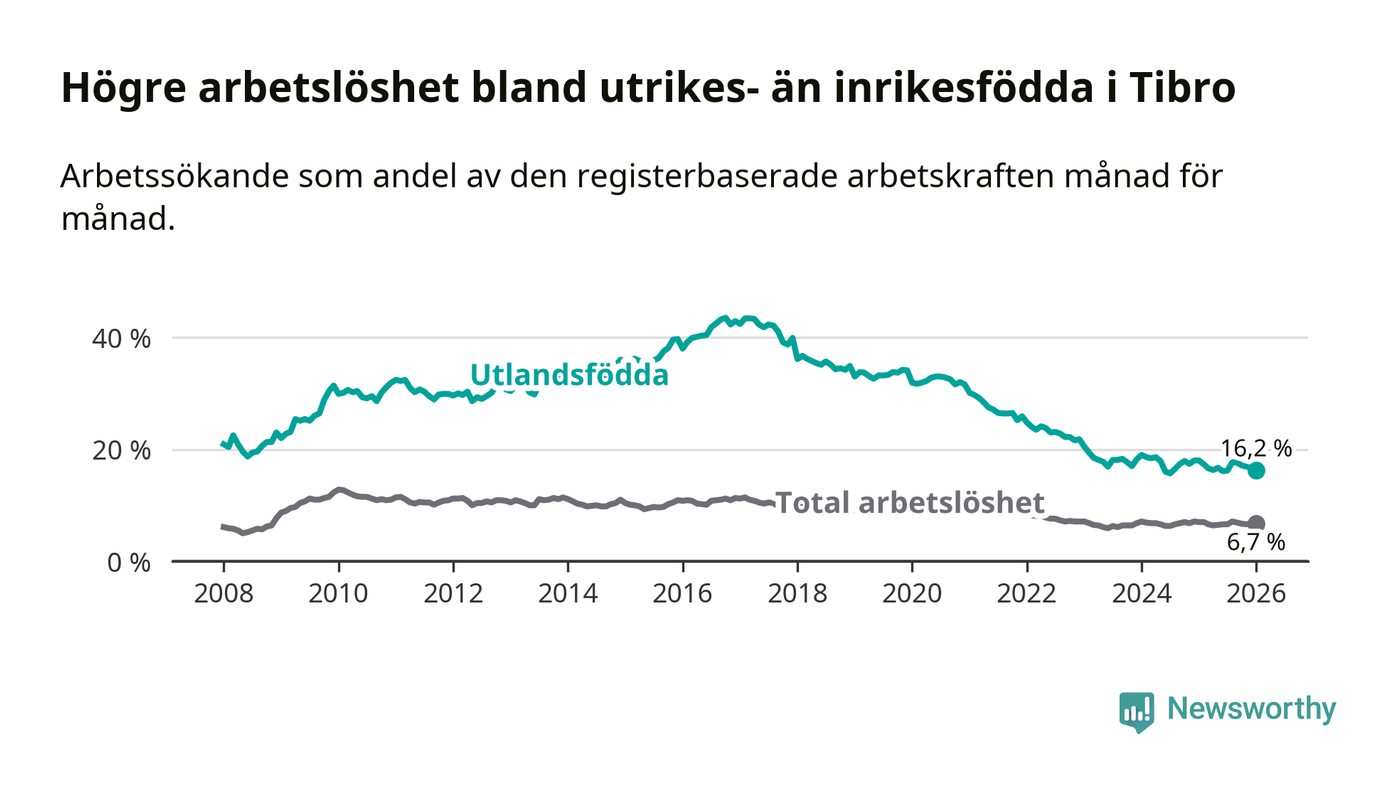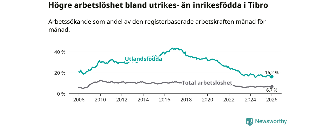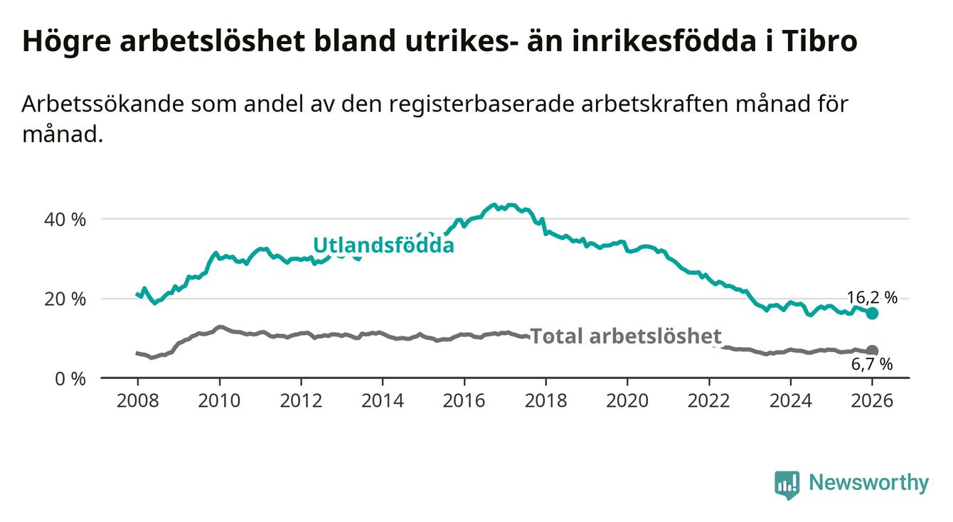 Arbetslösheten bland utlandsfödda var 16,2 procent i Tibro under januari månad, motsvarande 174 av 1 074 personer. Det är 1,8 procentenheter färre än vid samma tidpunkt i fjol (−21 om man räknar personer).