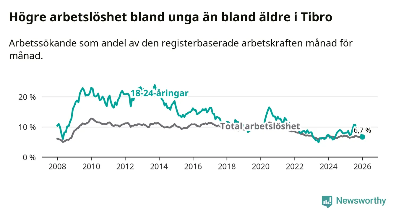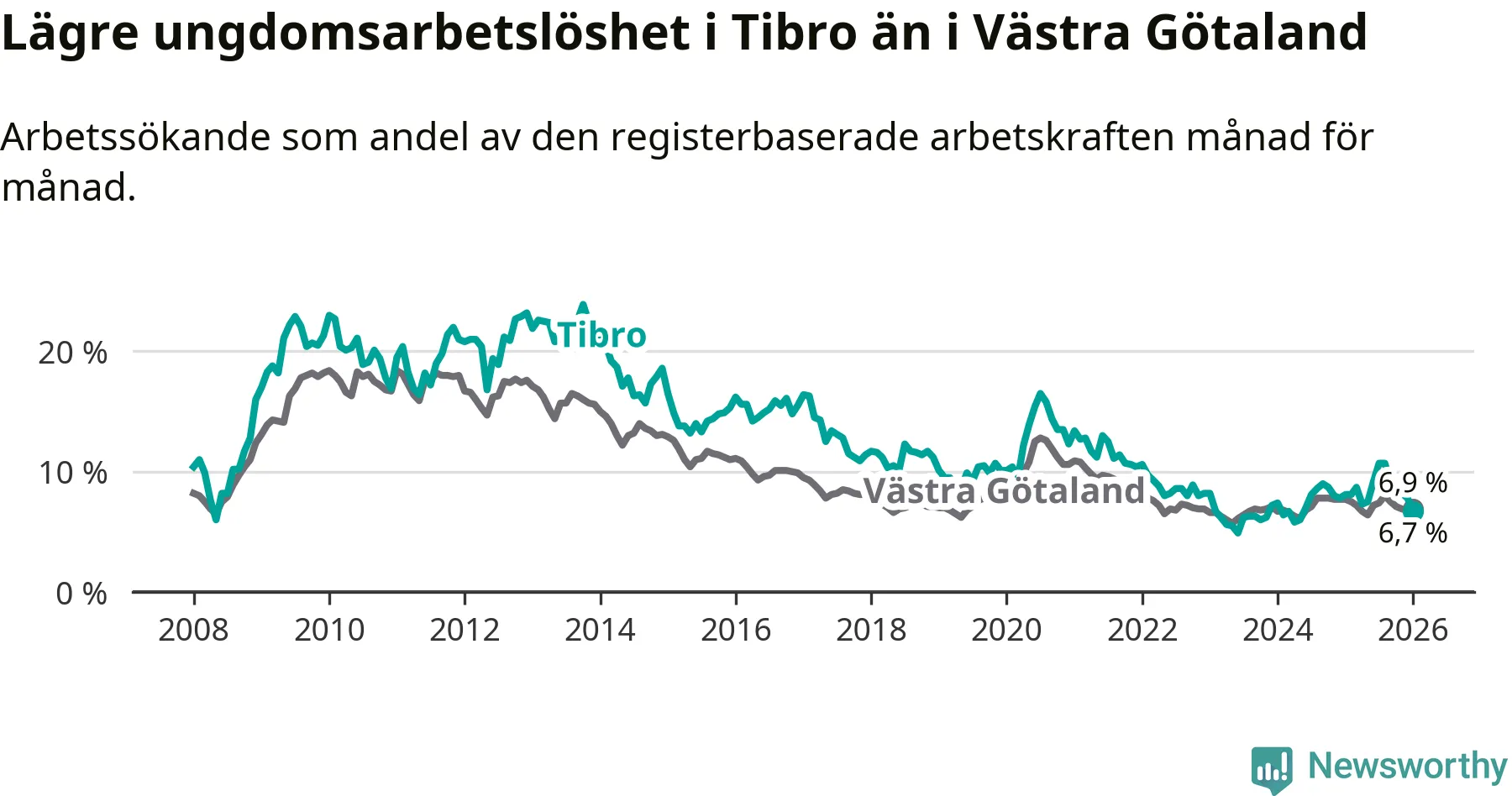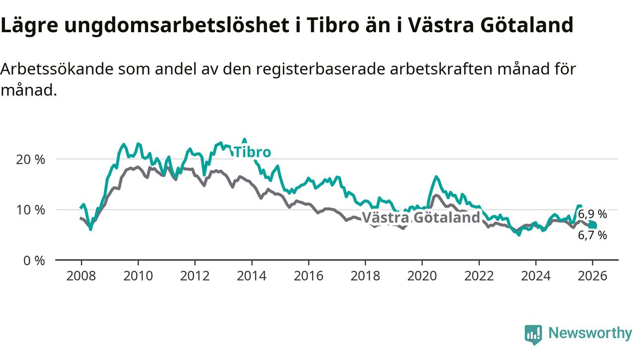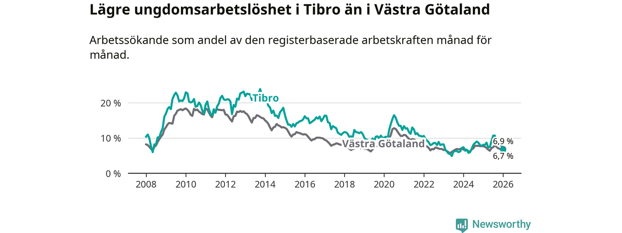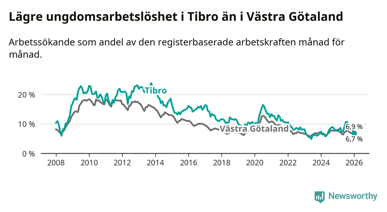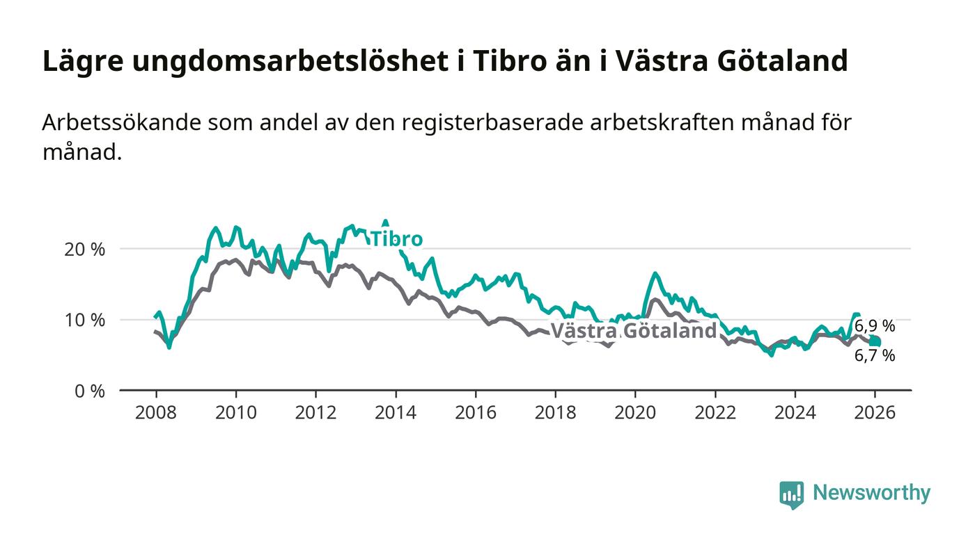 Medan Tibro har högre total arbetslöshet än Västra Götaland, ligger ungdomsarbetslösheten 0,2 procentenheter lägre i Tibro.