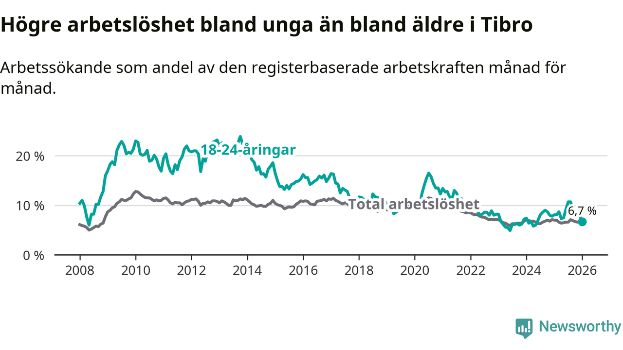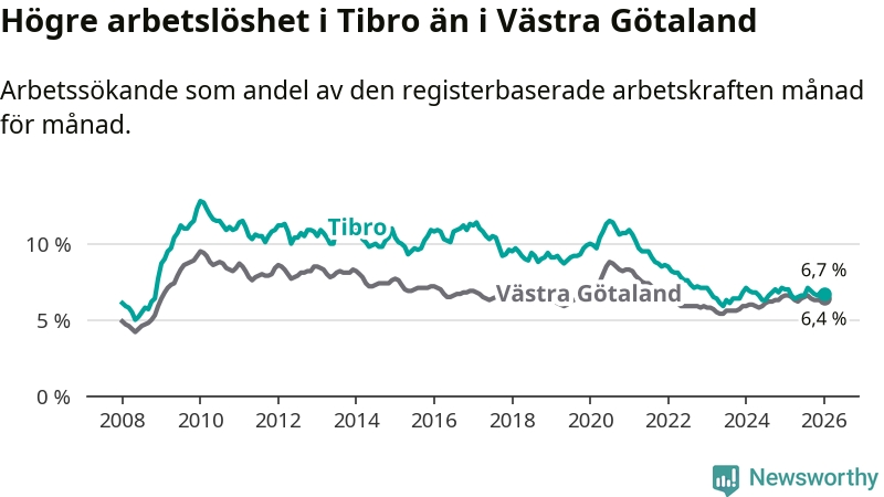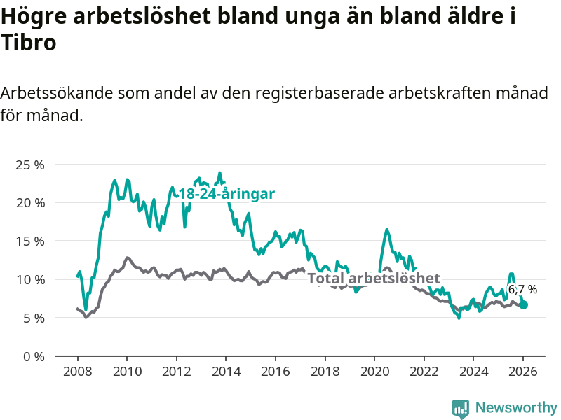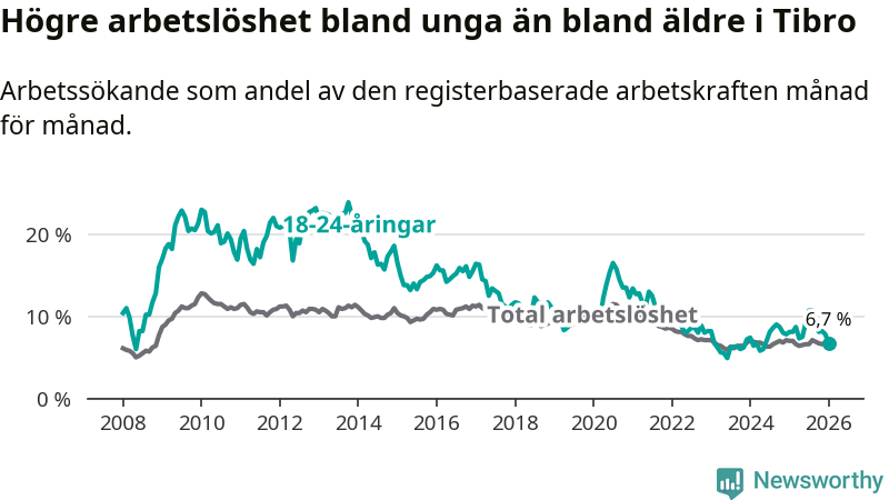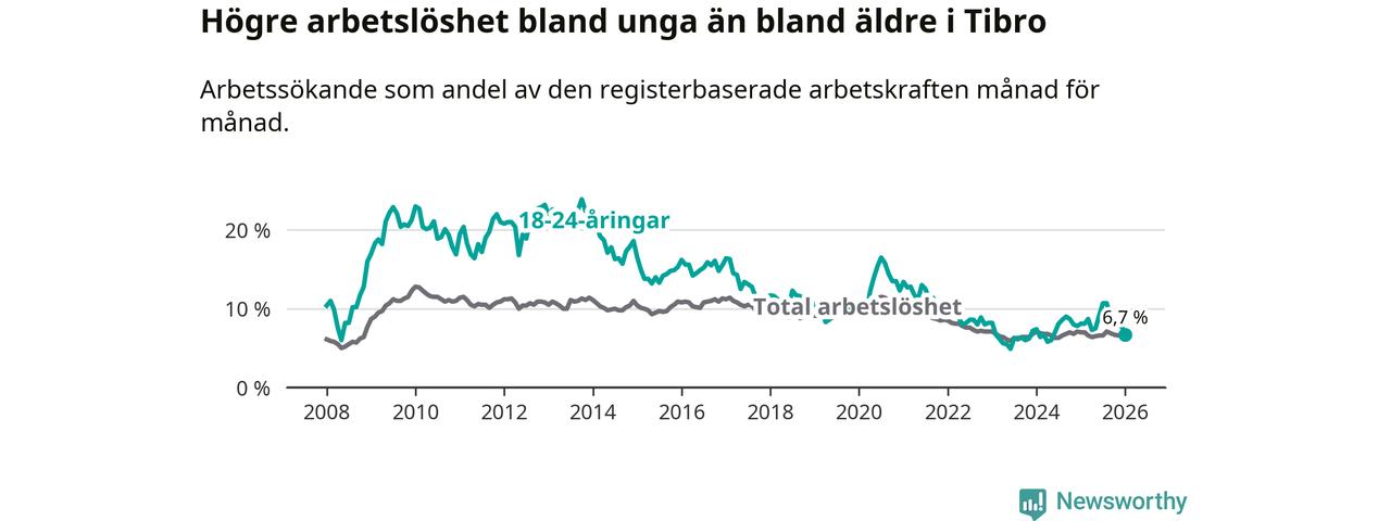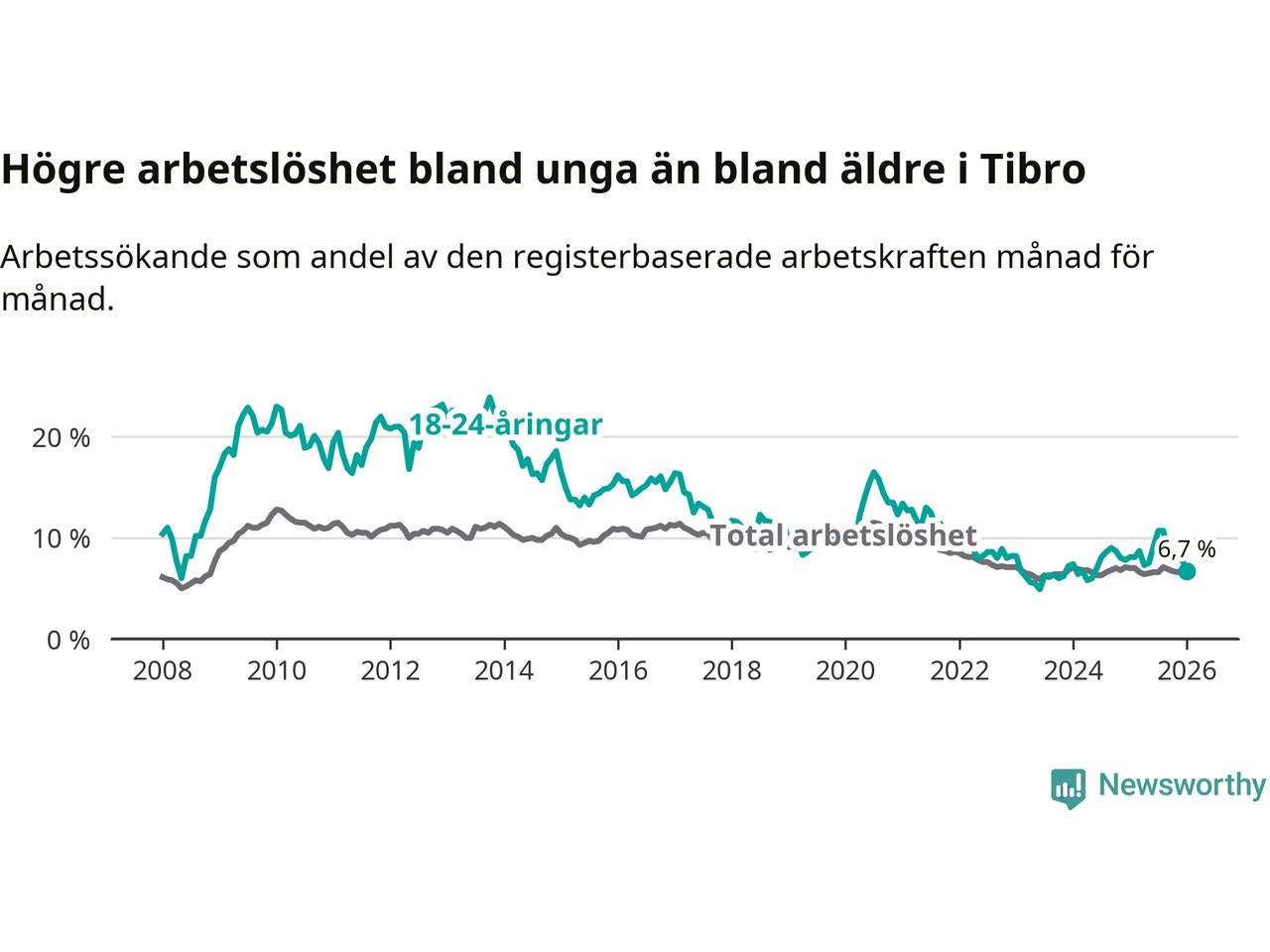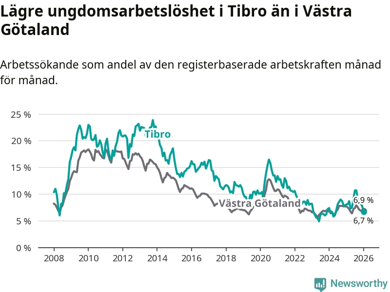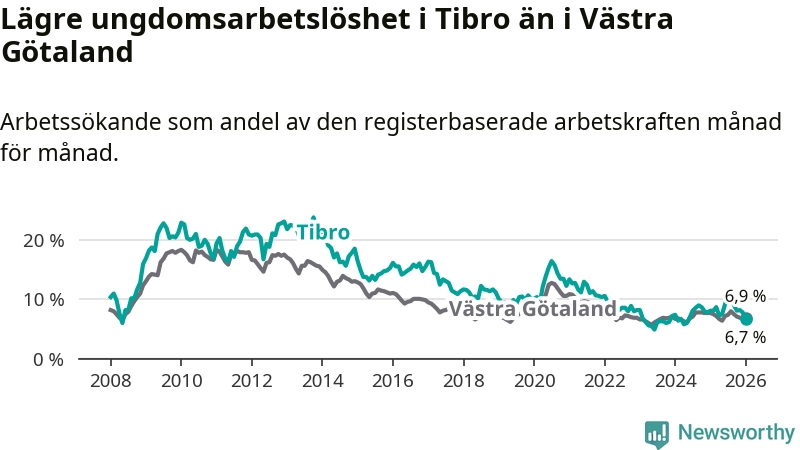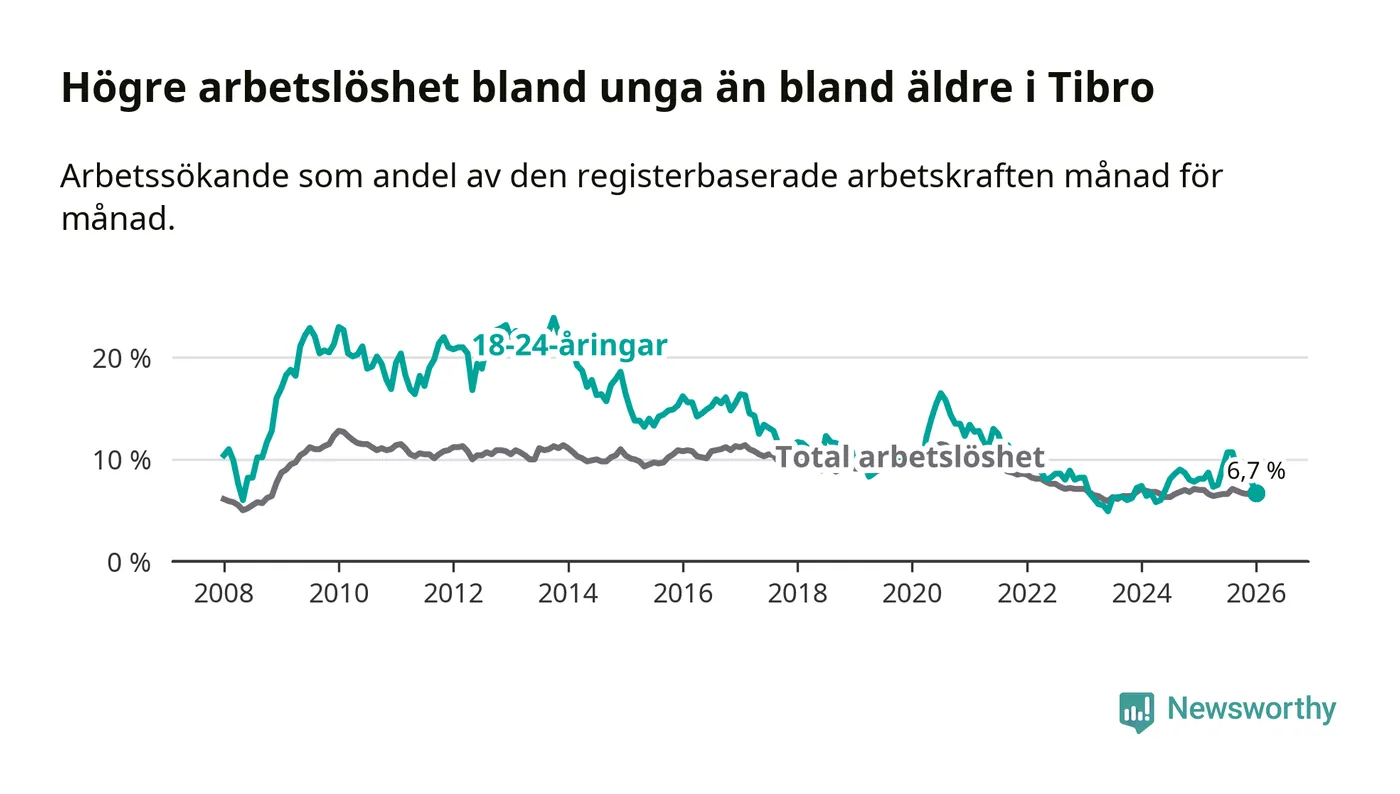 Medan Tibro har högre total arbetslöshet än Västra Götaland, ligger ungdomsarbetslösheten 0,2 procentenheter lägre i Tibro.