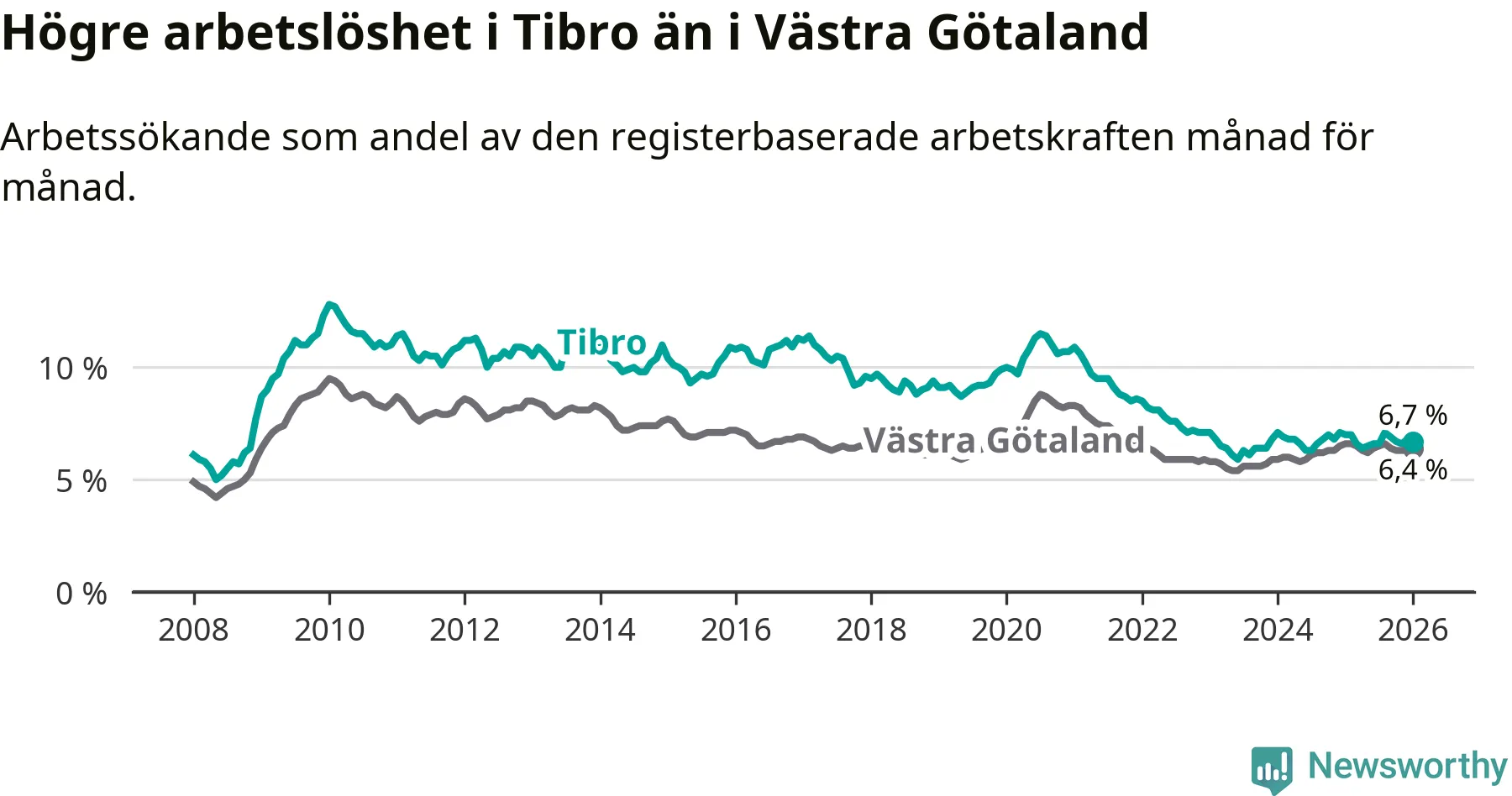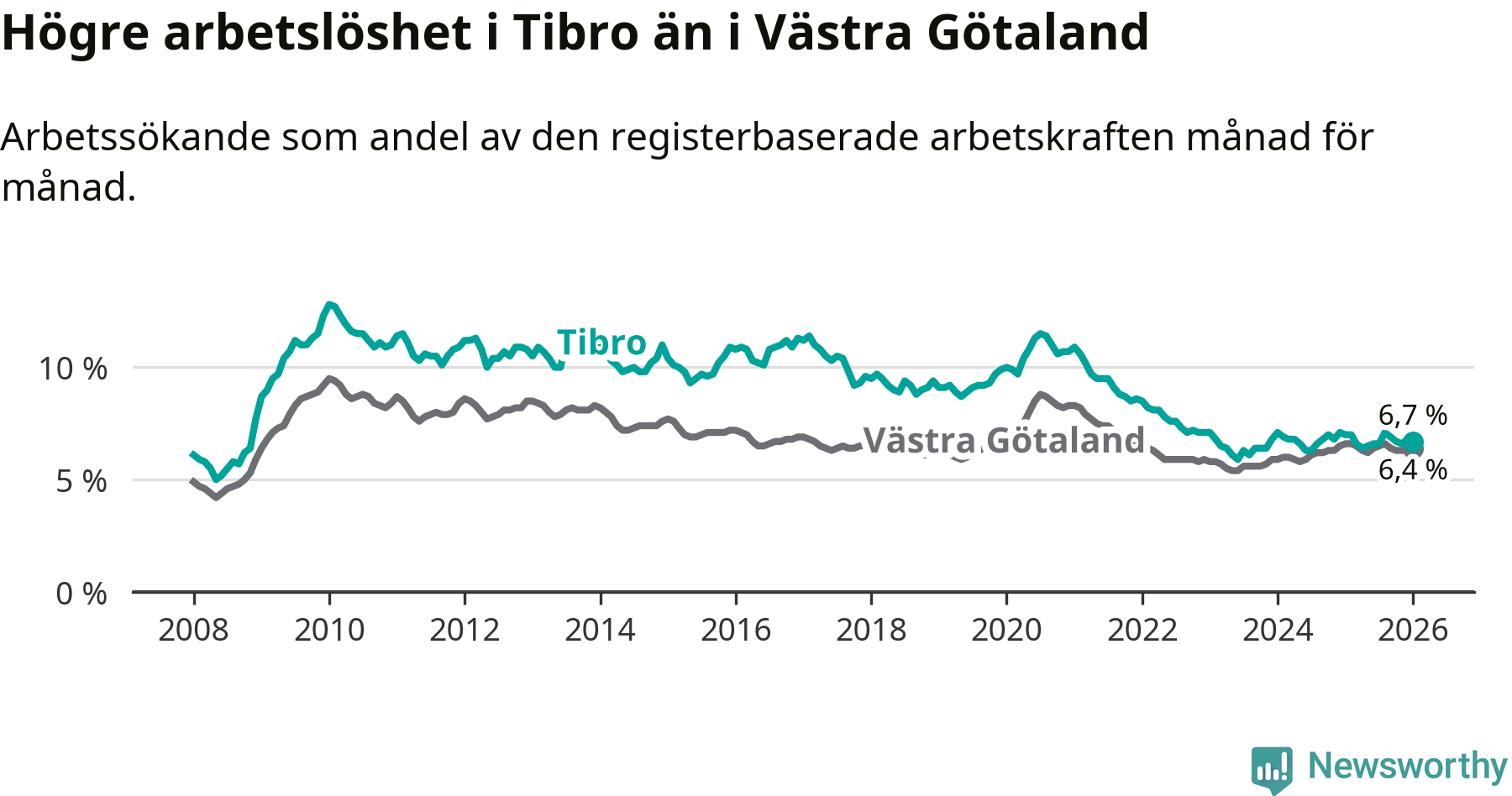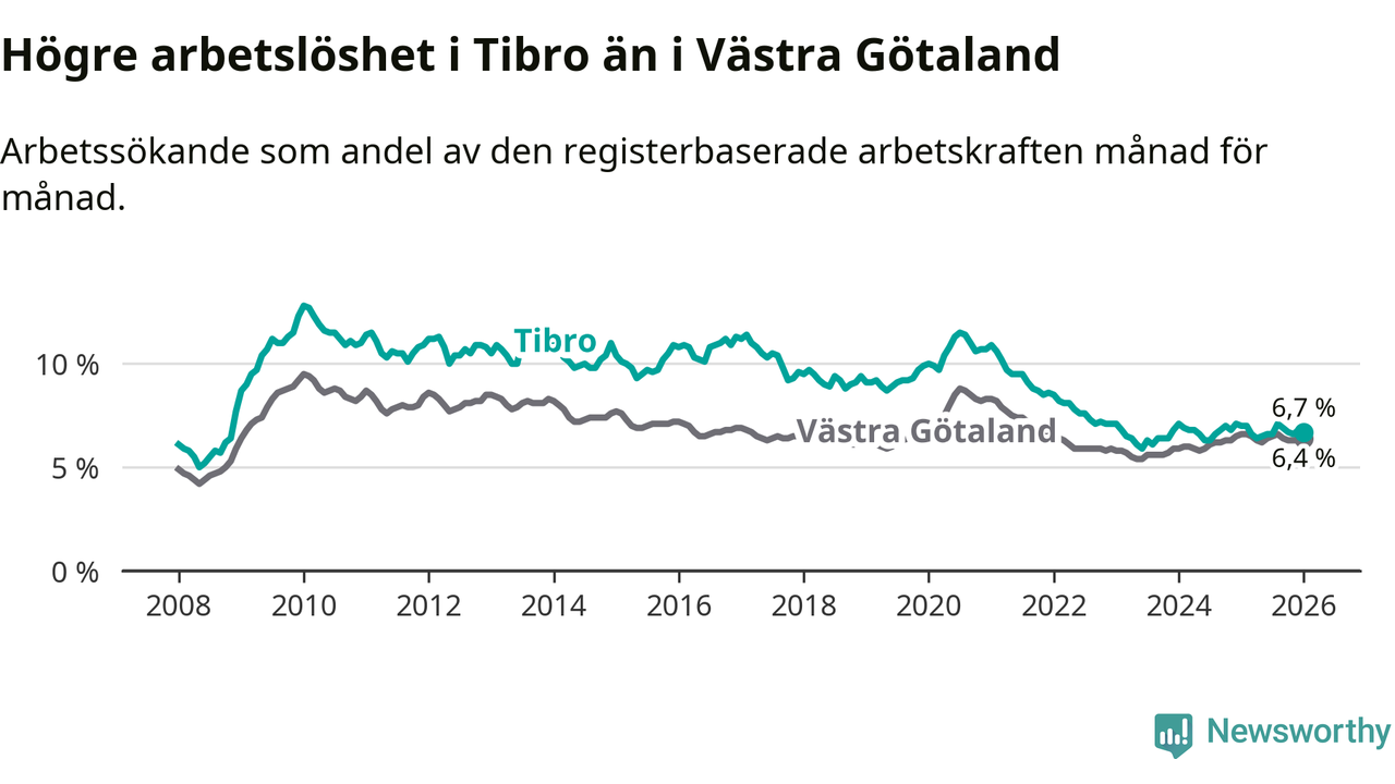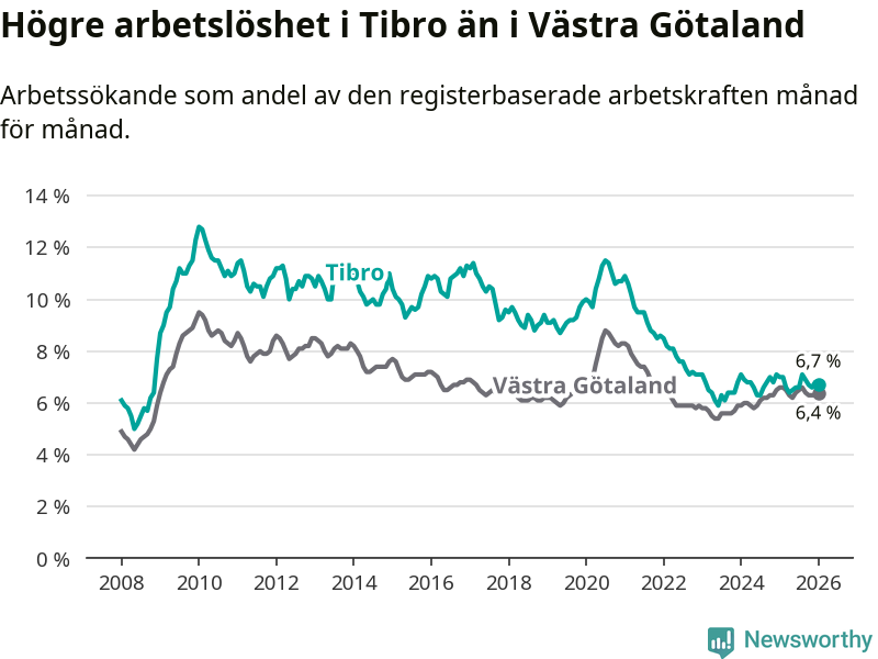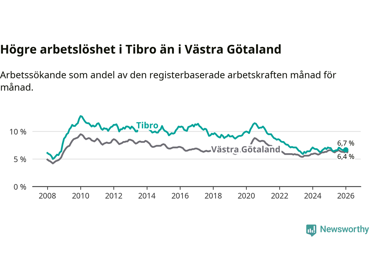 Under januari månad rapporterade Tibro kommun en total arbetslöshet på 6,7 procent. Det är en minskning jämfört med samma tidpunkt i fjol (−0,3 procentenheter). Även i Västra Götalands län sjunker arbetslösheten .