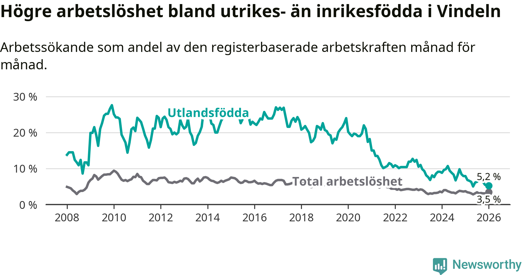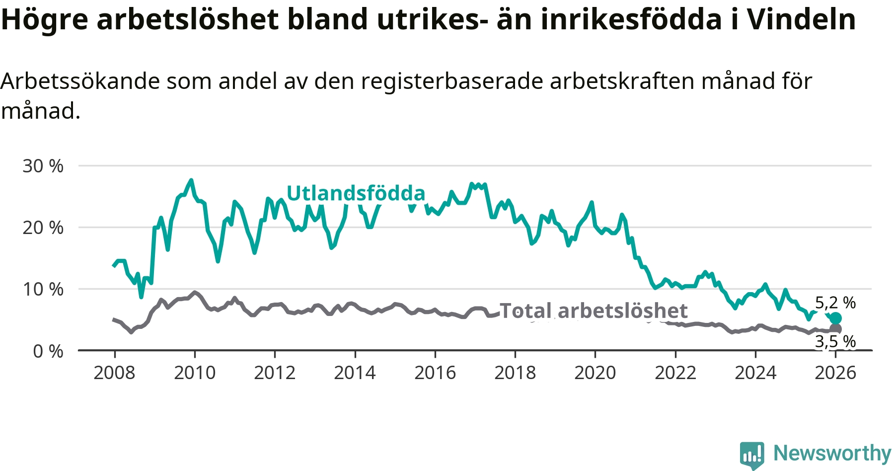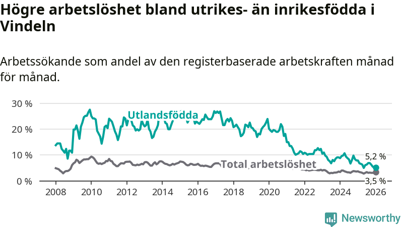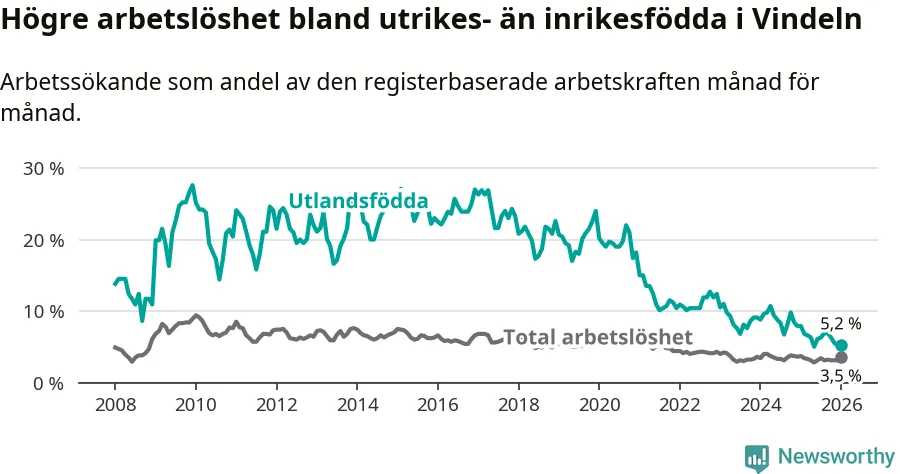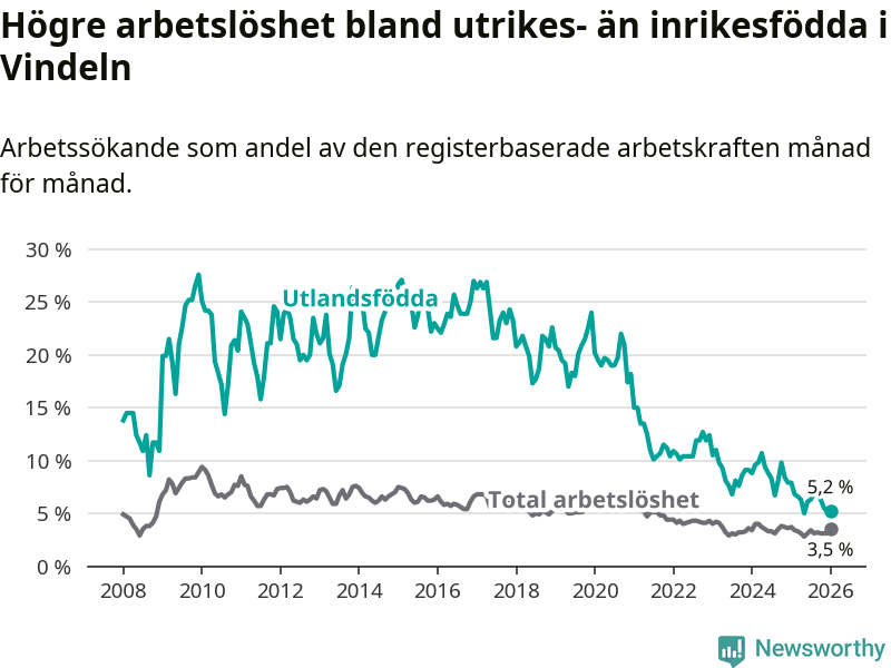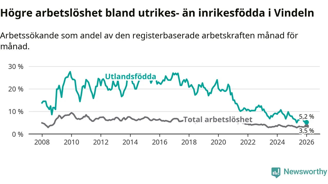 Arbetslösheten bland utlandsfödda var 5,2 procent i Vindeln under januari månad, motsvarande 19 av 365 personer. Det är 2,7 procentenheter färre än vid samma tidpunkt i fjol (−10 om man räknar personer).