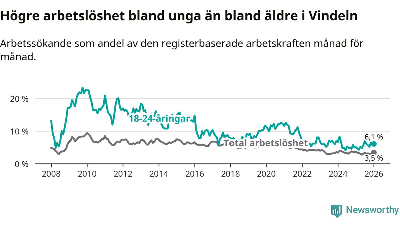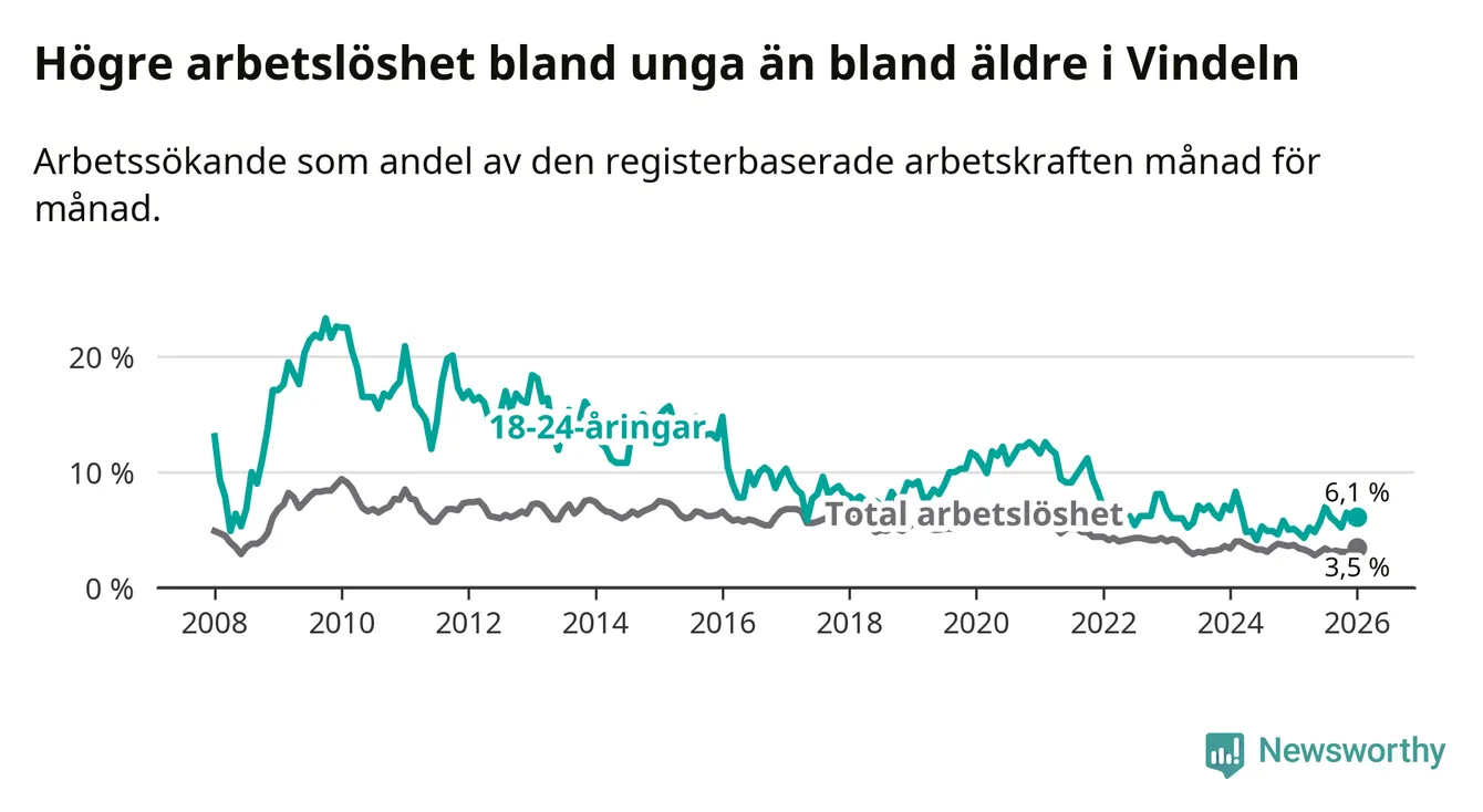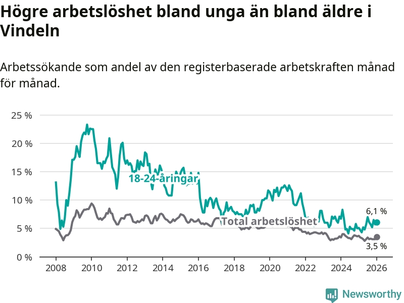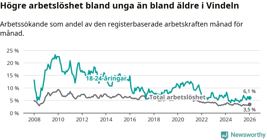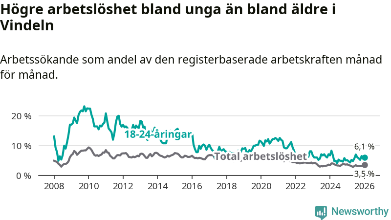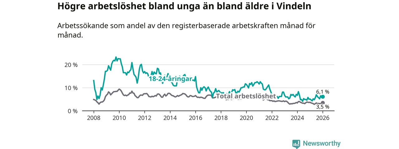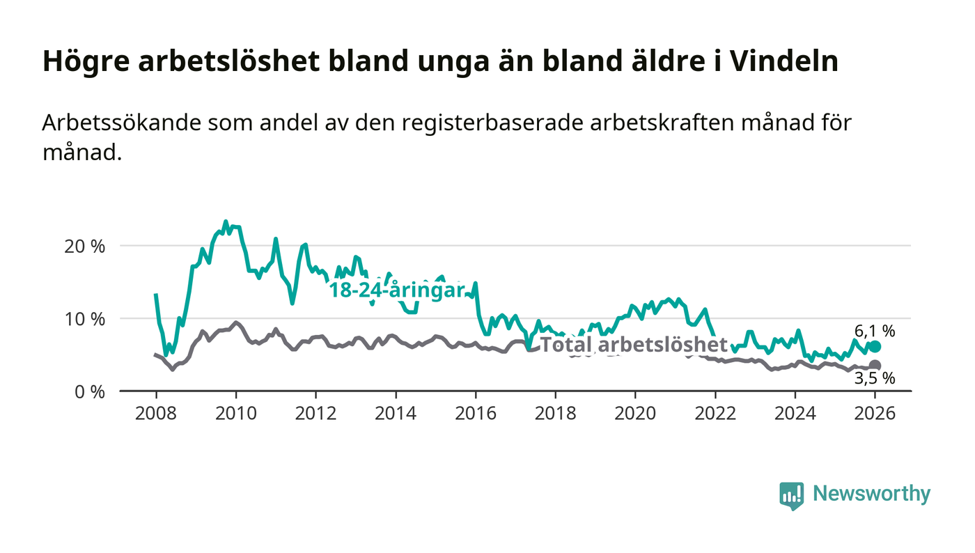I och med den senaste månadens uppgång har de ungas arbetslöshet i Vindeln stigit åtta månader i följd (upp från 4,8 procent i maj 2025 till 6,1 procent nu).