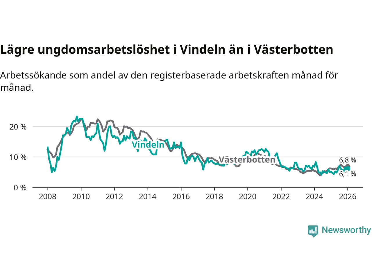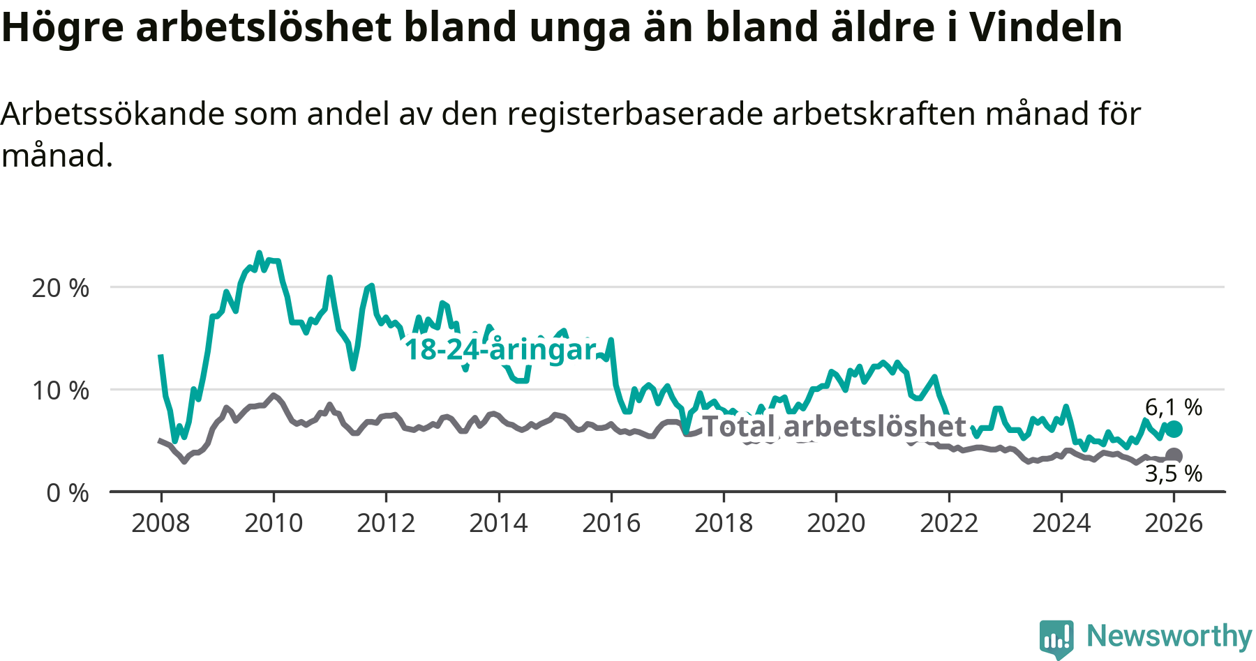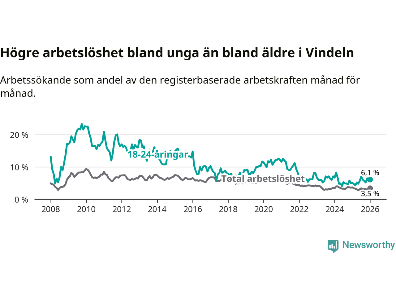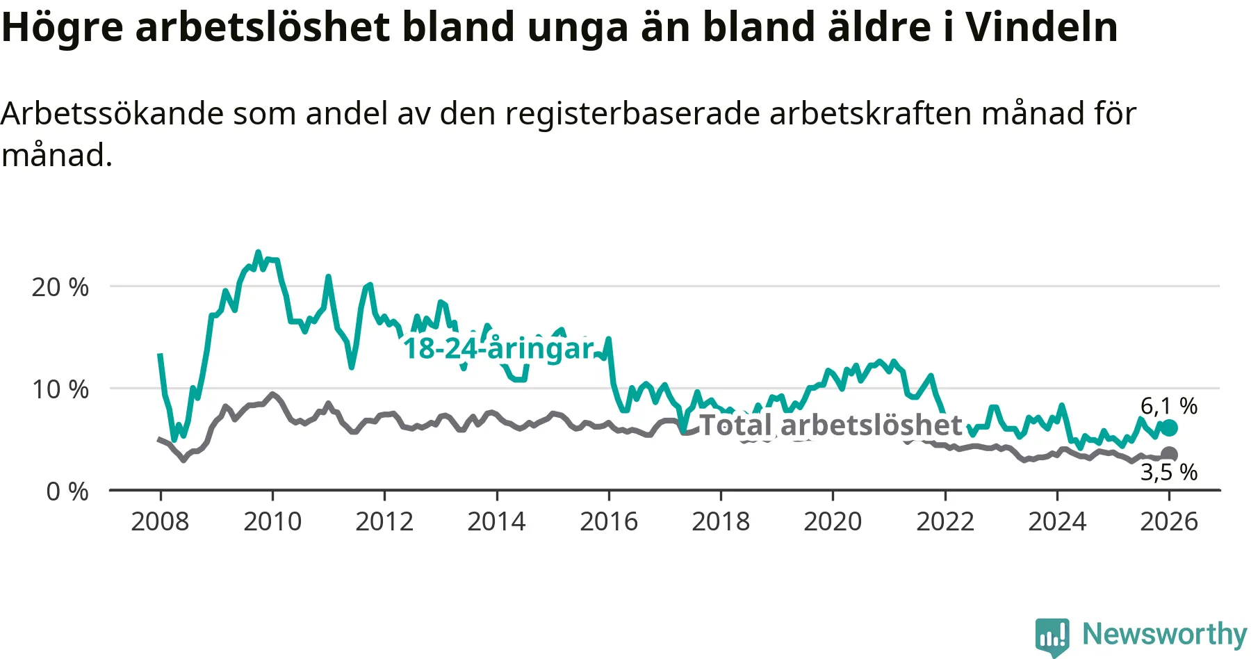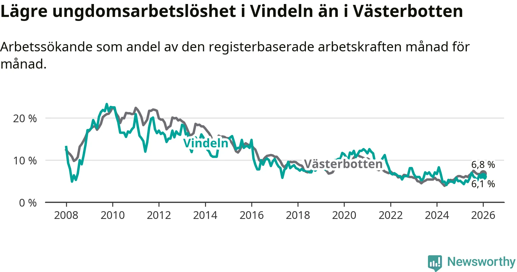 I och med den senaste månadens uppgång har de ungas arbetslöshet i Vindeln stigit åtta månader i följd (upp från 4,8 procent i maj 2025 till 6,1 procent nu).