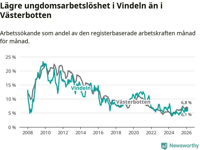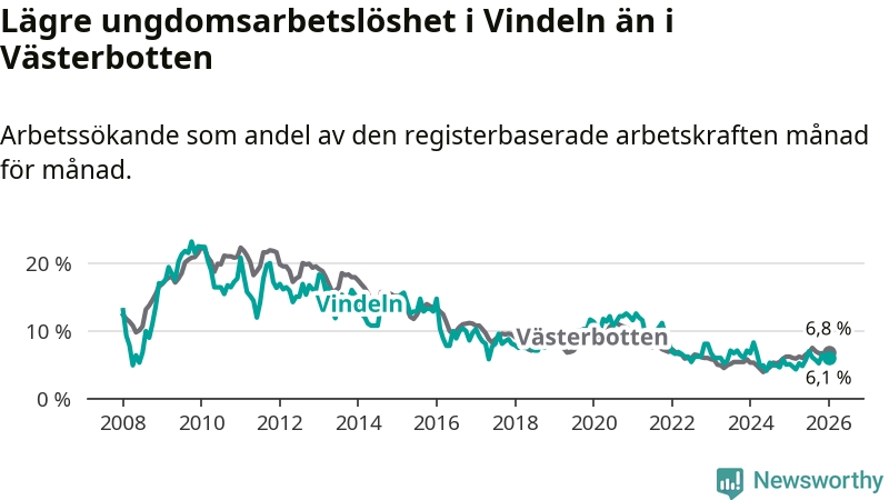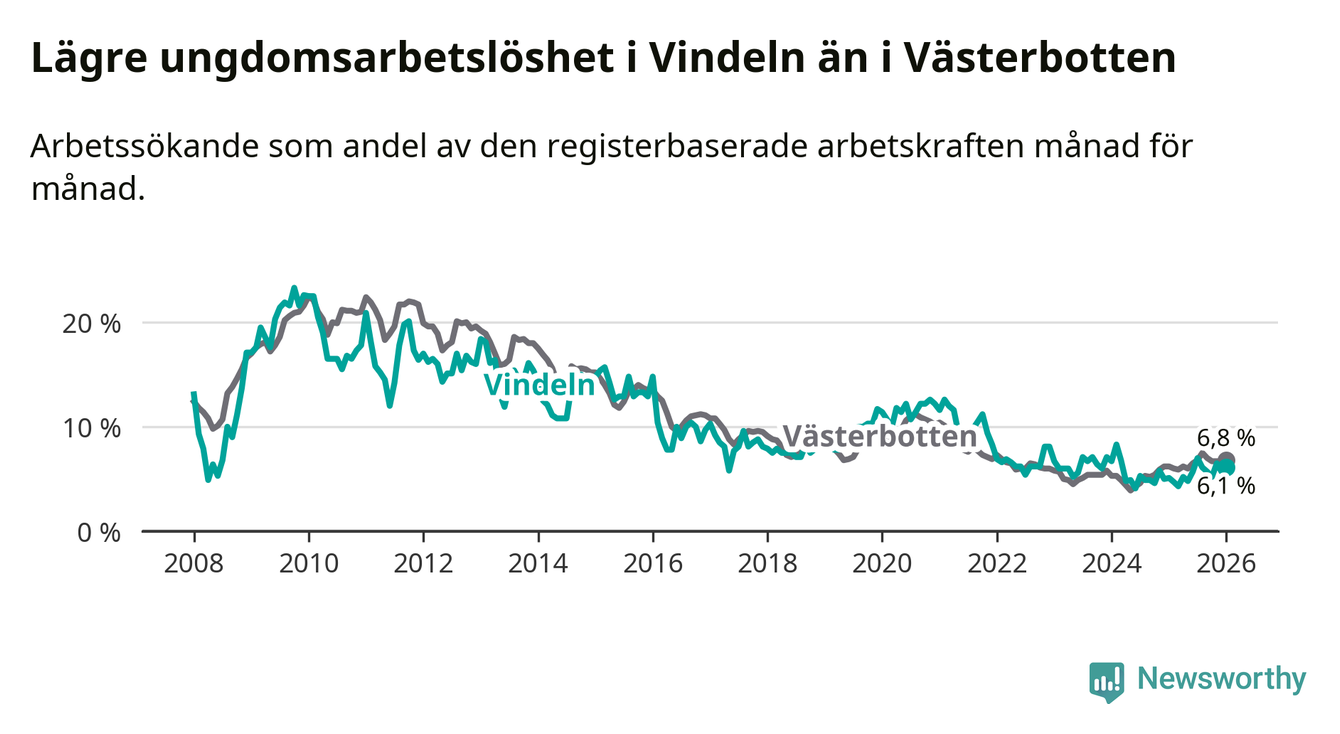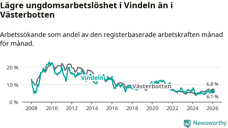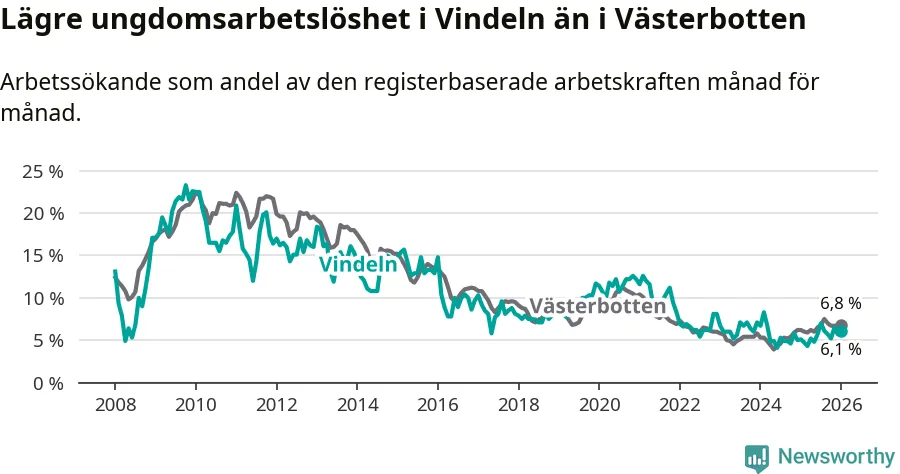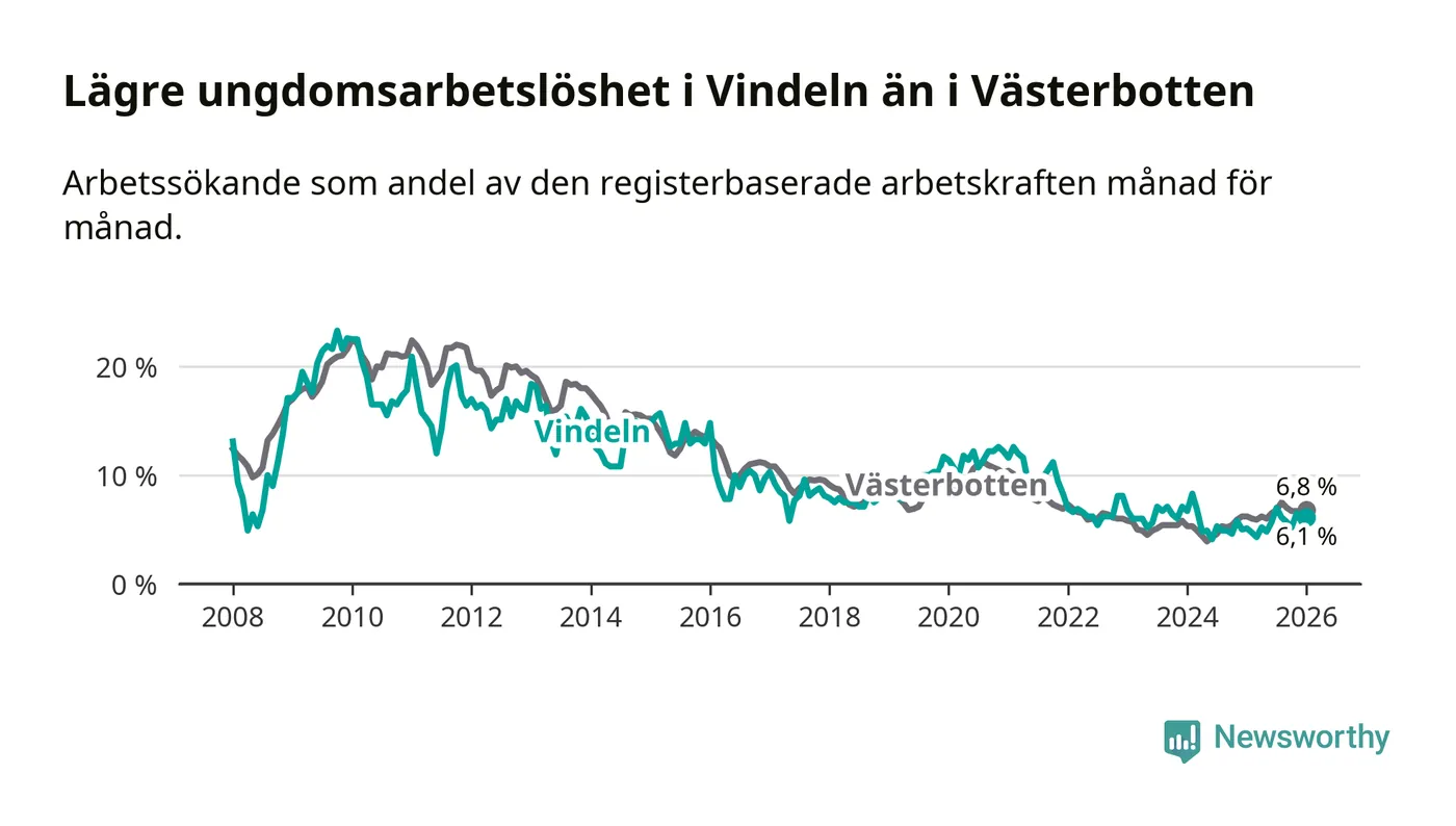 Precis som den totala arbetslösheten ligger ungdomsarbetslösheten i Vindeln lägre än i Västerbotten som helhet. Skillnaden mellan kommunen och länet är 0,7 procentenheter.