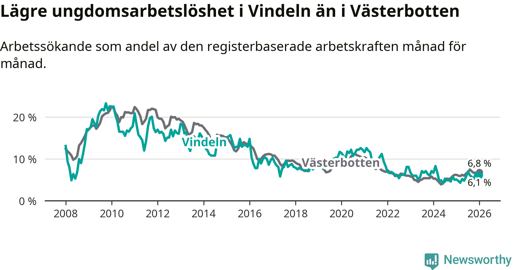 Graf: Arbetslöshet bland unga i Vindelns kommun och Västerbottens län