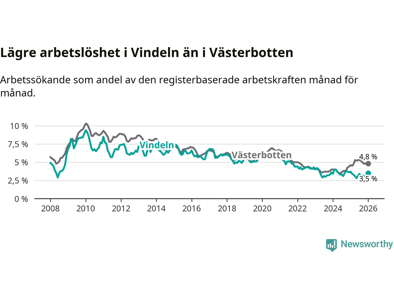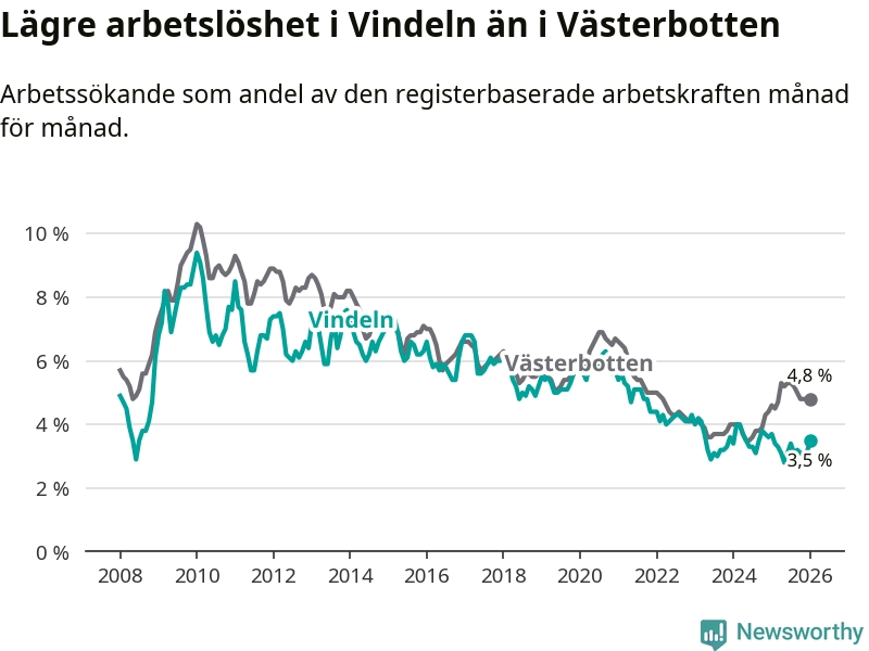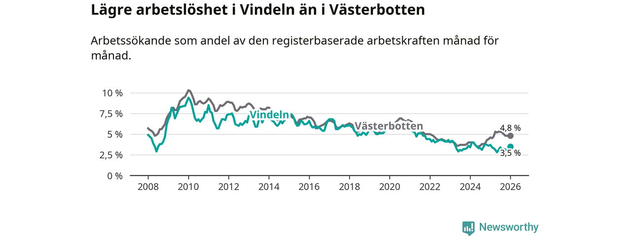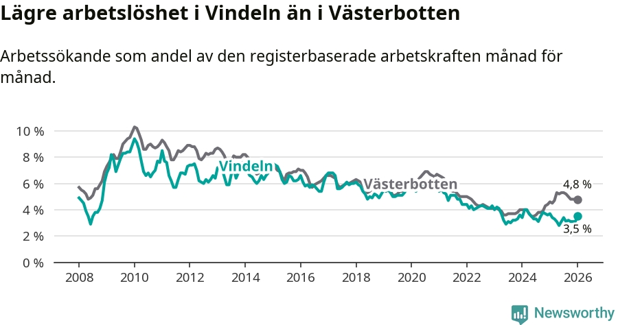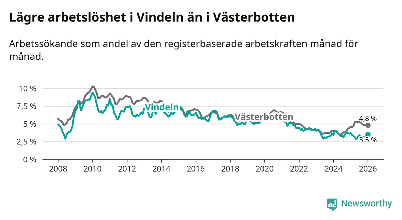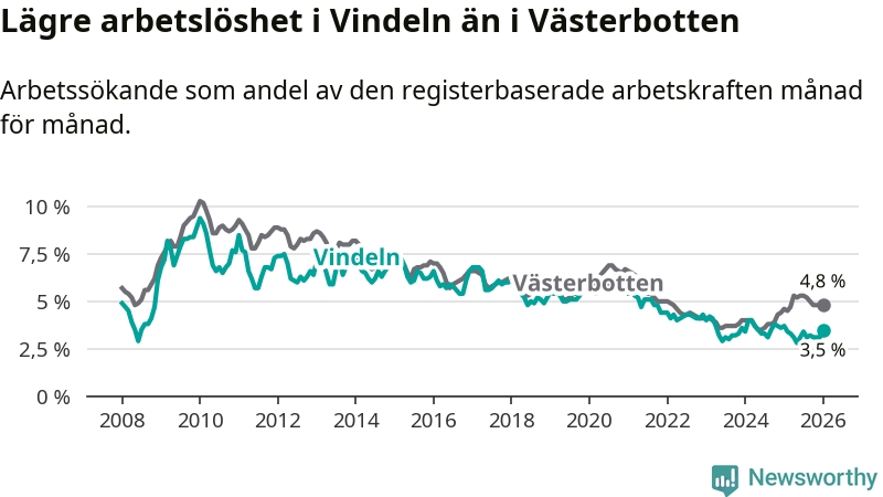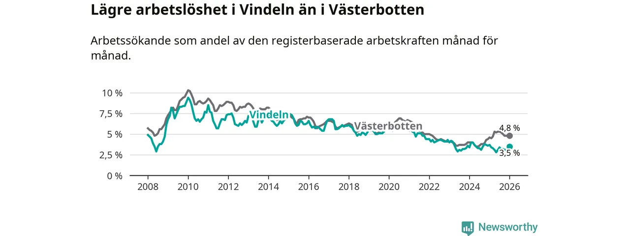 Under januari månad rapporterade Vindelns kommun en total arbetslöshet på 3,5 procent. Det är en minskning jämfört med samma tidpunkt i fjol (−0,2 procentenheter). I Västerbottens län däremot stiger arbetslösheten .