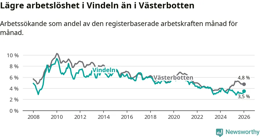 Ny statistik från Arbetsförmedlingen visar på en nedgång i arbetslöshet i Vindelns kommun. I Västerbotten däremot ökar arbetslösheten.