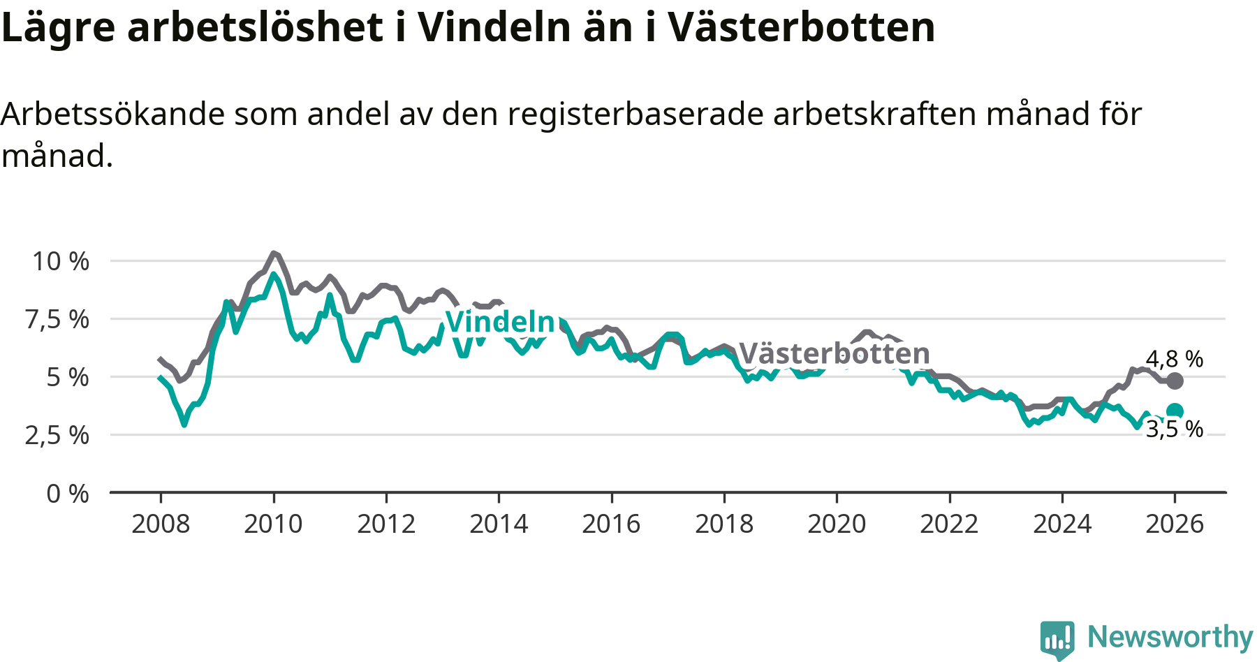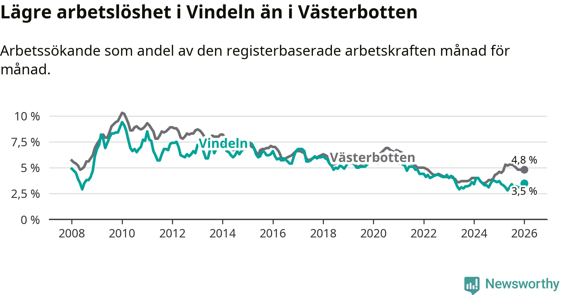 Graf: Arbetslöshet i Vindelns kommun och Västerbottens län