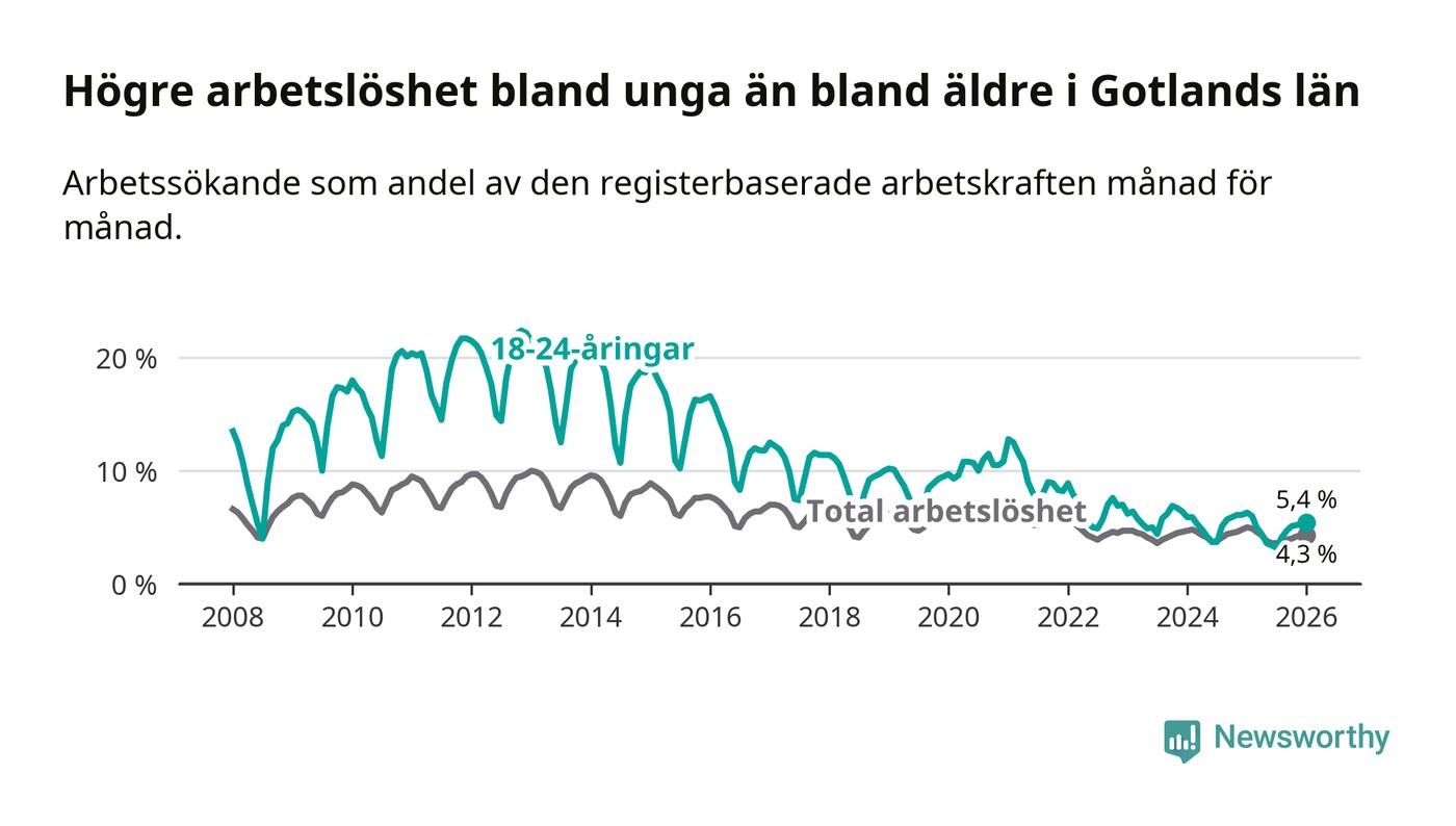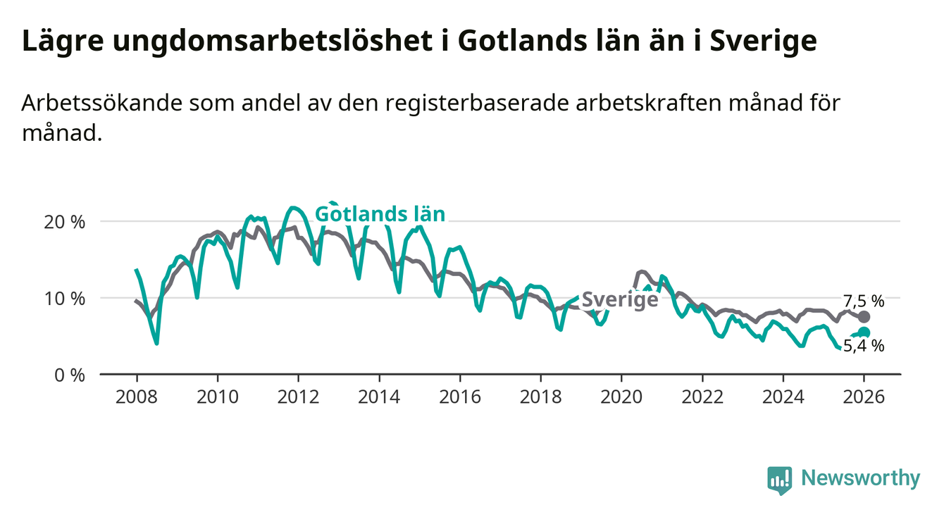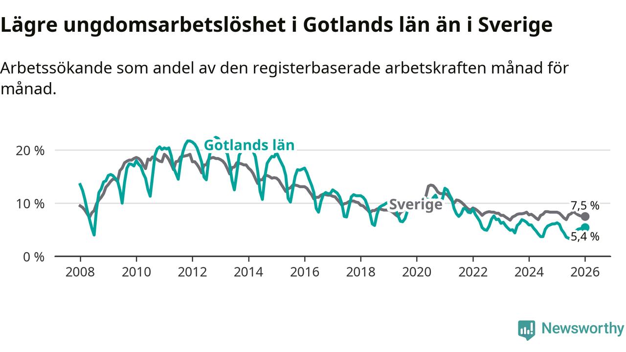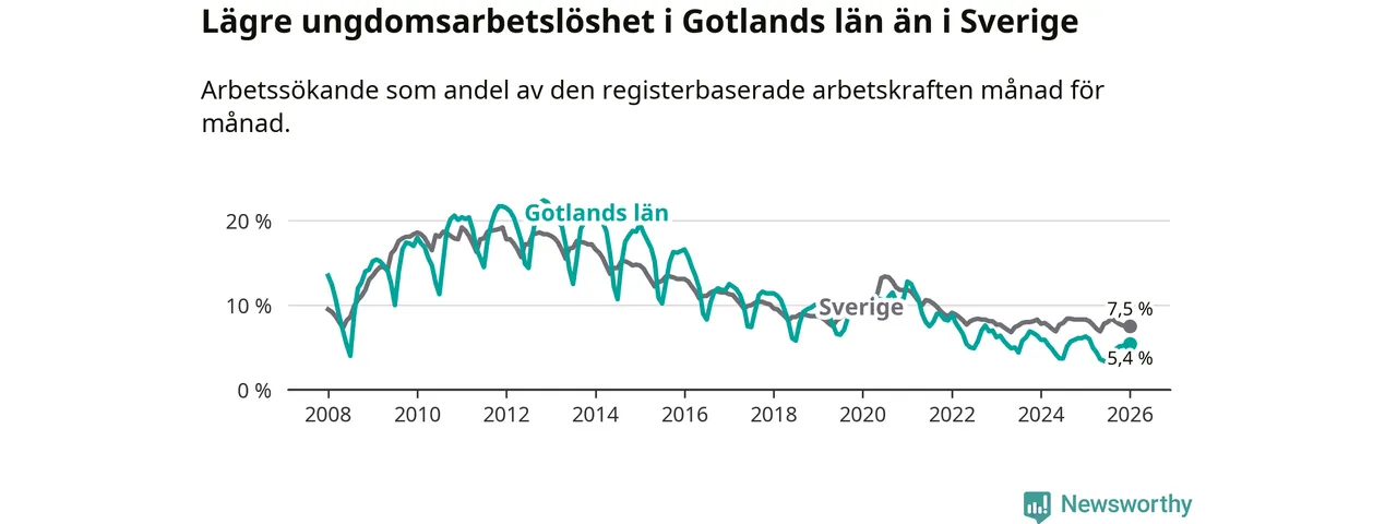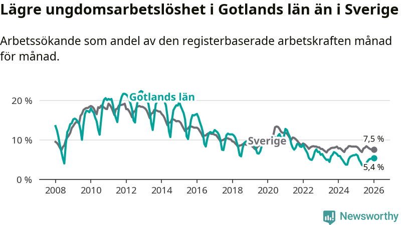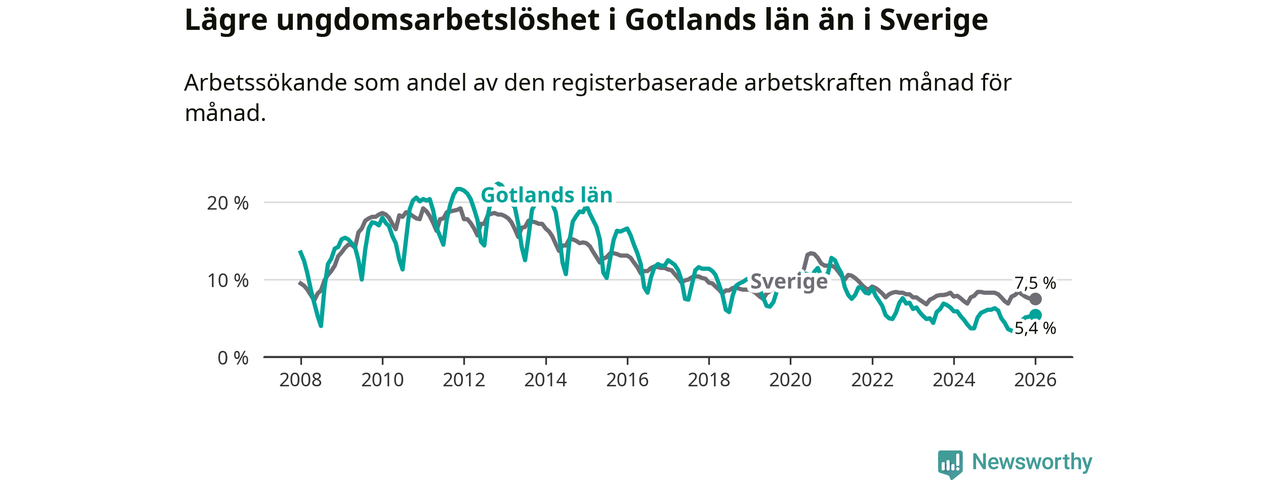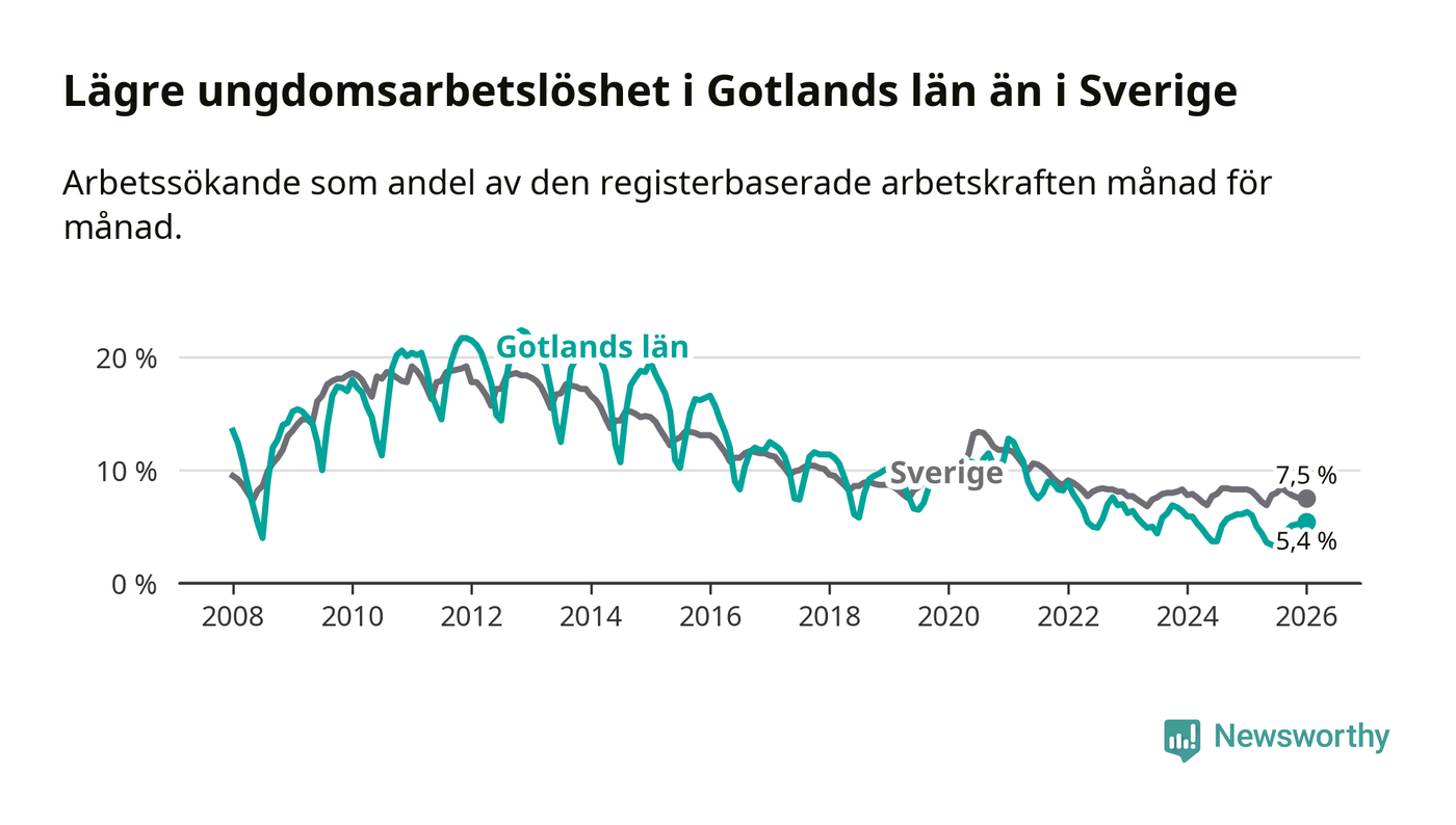I och med den senaste månadens nedgång har de ungas arbetslöshet på Gotland sjunkit elva månader i följd (ner från 6,0 procent i februari 2025 till 5,4 procent nu).