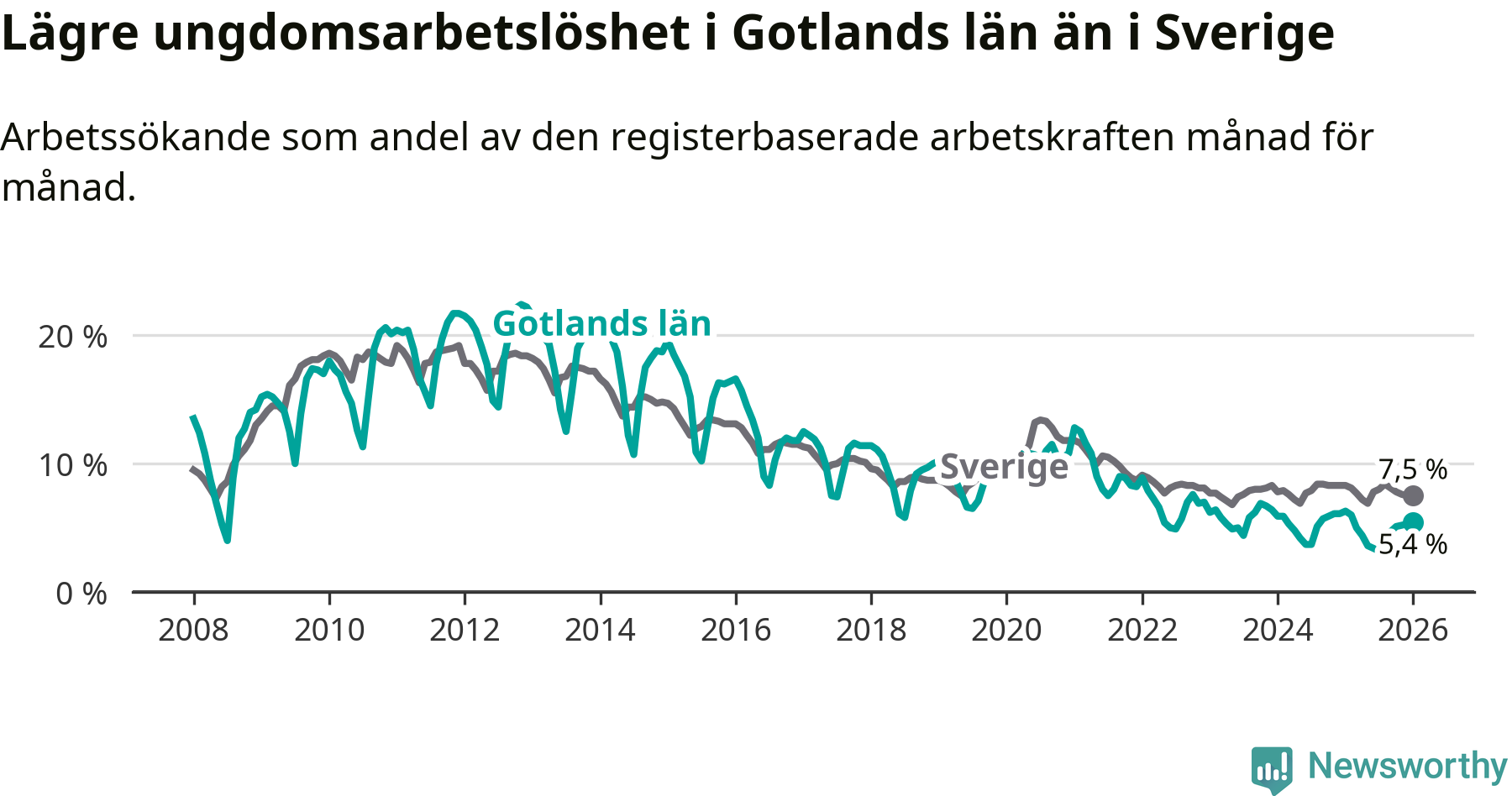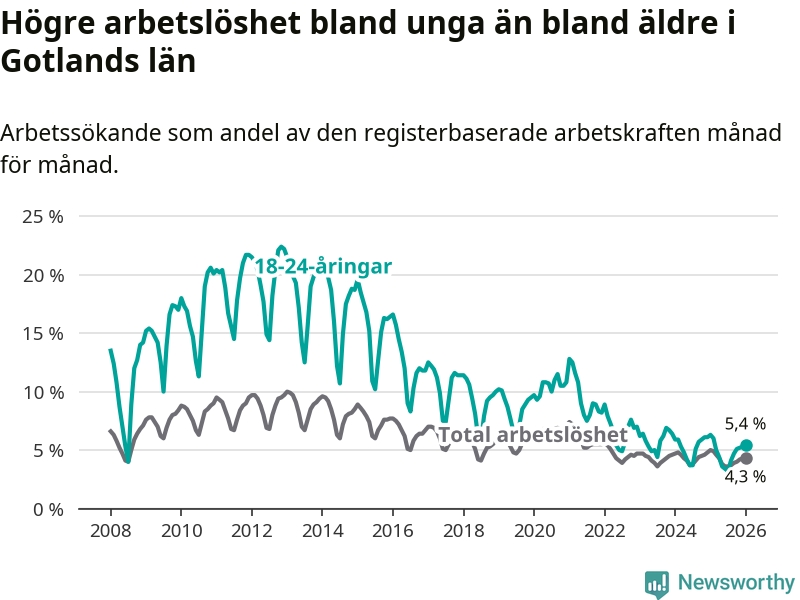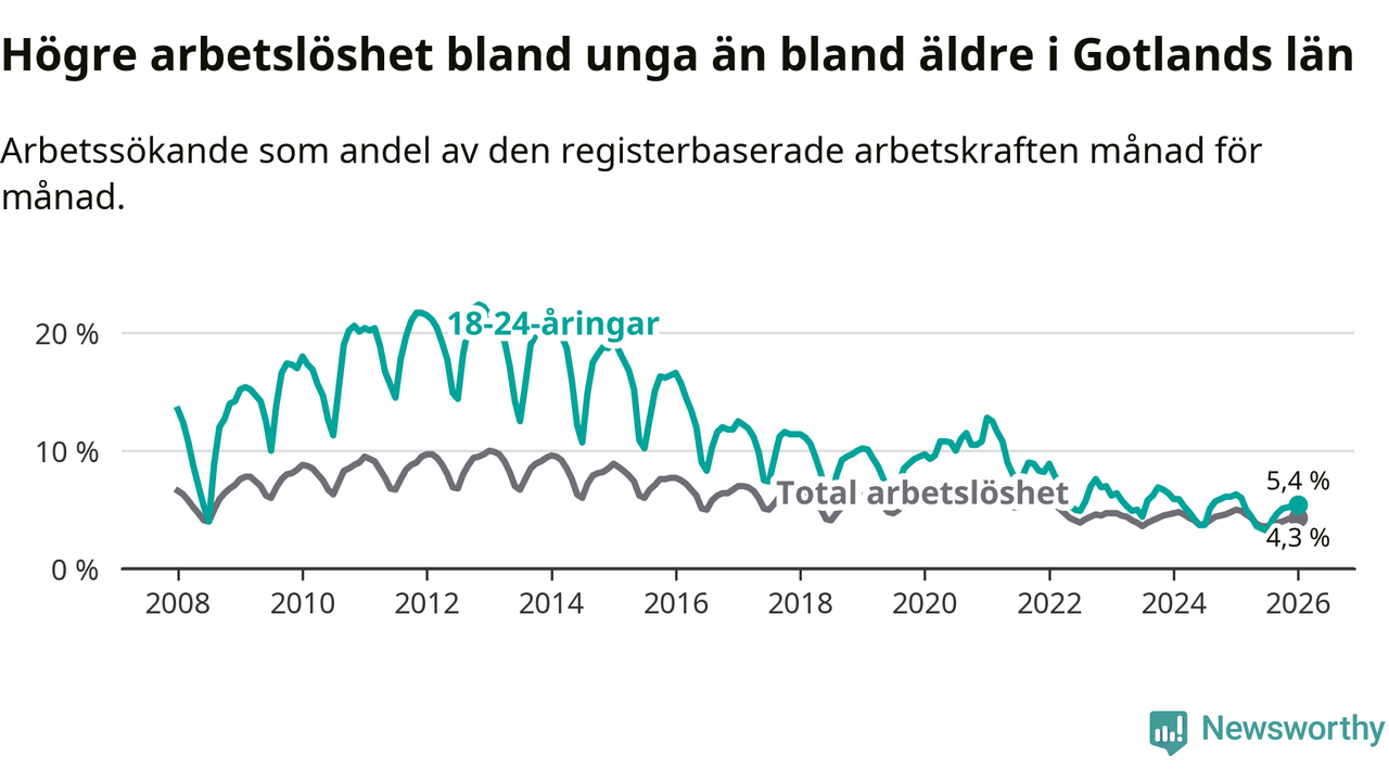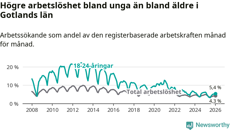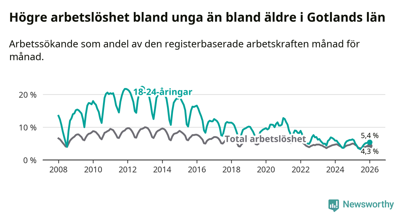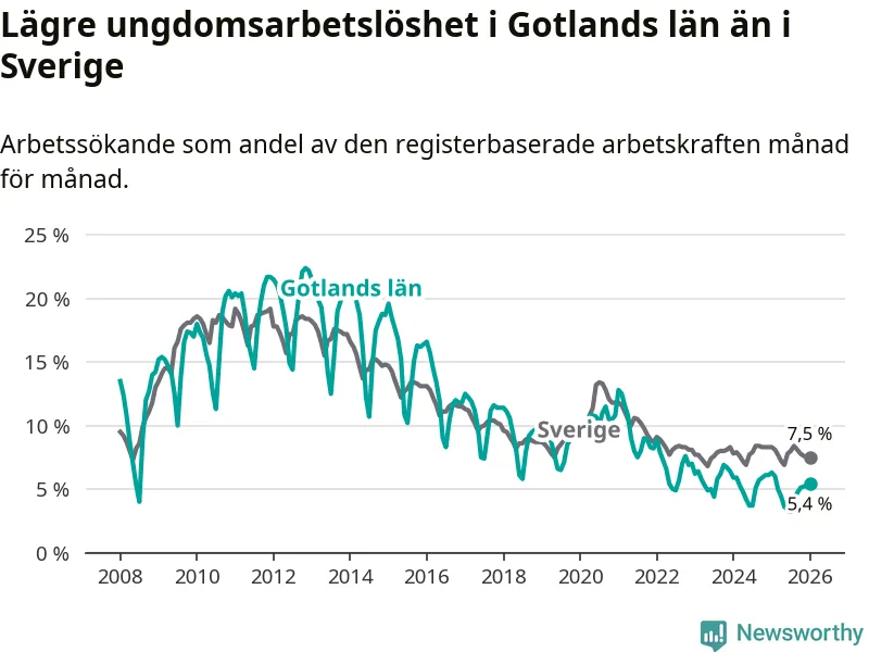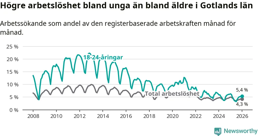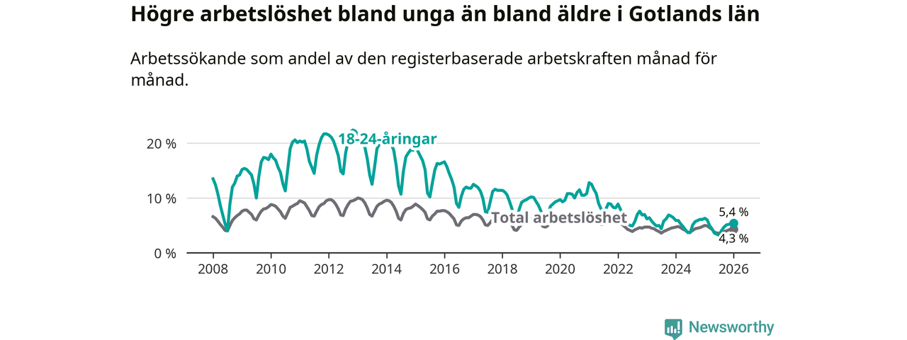 I och med den senaste månadens nedgång har de ungas arbetslöshet på Gotland sjunkit elva månader i följd (ner från 6,0 procent i februari 2025 till 5,4 procent nu).